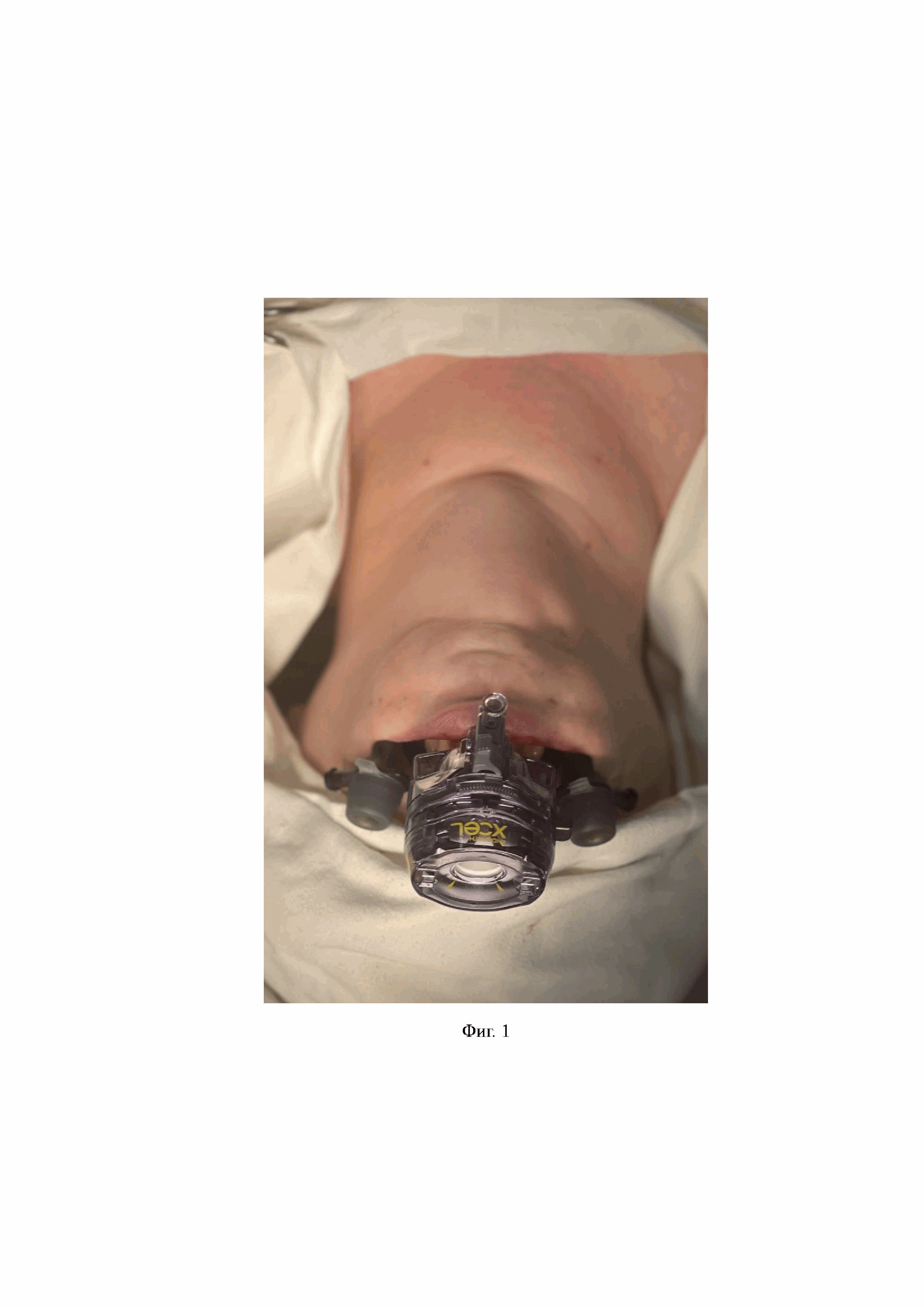 После антисептической обработки операционного поля инфильтрировали слизистую оболочку, подслизистый слой в нижнем своде преддверия полости рта, а также инфильтрировали подкожно-жировую клетчатку в подбородочной области и в подподбородочном треугольнике раствором адреналина в соотношении 1 мг адреналина на 500 мл физиологического раствора. Выполнили линейный разрез слизистой оболочки в нижнем своде преддверия полости рта длиной 1 см, с помощью туннелера сформировали субплазматическое пространство. В центр линейного разреза слизистой оболочки в нижнем своде преддверия полости рта поместили 10-мм троакар с краном для газоподачи (Фиг. 1), а по обеим сторонам от него через дополнительные 5 мм разрезы ввели 5-мм троакары для эндоскопических инструментов, выполнили инсуффляцию углекислым газом до уровня давления 5 мм рт. ст. (что позволило удержать адекватное рабочее пространство). Далее выполнили разрез кожи в правой подмышечной области длиной 3,0 см (Фиг. 2), подкожно-жировую клетчатку отсепаровывали до медиальной ножки правой грудинно-ключично-сосцевидной мышцы и сформировали туннель, через который поместили 16-мм троакар, обеспечивающий эвакуацию хирургического дыма (Фиг. 3, Фиг. 4). Гармоническими ножницами и монокоагулятором через троакары 5 мм сформировали необходимый объем рабочей полости (Фиг. 5). Щитовидную железу обнажили, мобилизовали и удалили в эндоскопическом контейнере через ранее выполненный разрез кожи в правой подмышечной области. Затем установили в ложе удаленной щитовидной железы дренажную трубку, фиксирующуюся к дренажу Редона. Разведенные грудино-подъязычные мышцы свели и сшили непрерывным рассасывающимся швом. Разрезы в преддверии рта и в подмышечной области ушили узловыми рассасывающимися швами (Фиг. 6).
