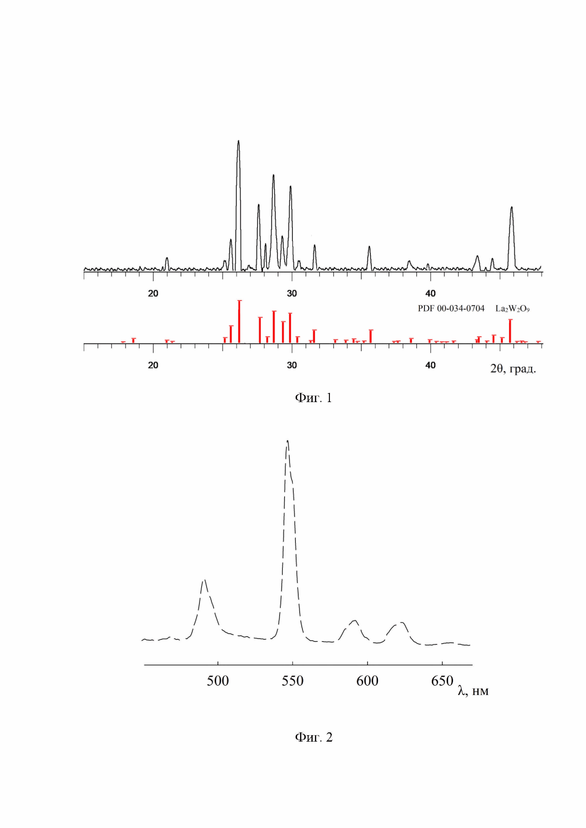 Изобретение относится к способам получения вольфраматов лантана, допированных редкоземельными элементами, состава La2-xLnxW2O9 и может быть использовано в химической промышленности, в частности для получения материалов для использования в люминесценции, диэлектриках, высокотемпературных материалах, электролитах твёрдооксидных топливных элементов, датчиках кислорода, фотокатализаторах. Неорганические красные и зелёные люминофоры широко используются в белых светодиодах для обеспечения излучения белого света. В частности, вольфраматы являются одними из самых популярных материалов для люминофоров благодаря своей высокой химической стабильности и представляют практический интерес для использования в фотолюминесценции, оптических волокнах и сцинтилляторах. Их структурное разнообразие обеспечивает разнообразные физические и химические свойства, обеспечивающие возможность легирования редкоземельными ионами (RE) без существенного тушения флуоресценции. Среди вольфраматов редкоземельных элементов описаны RE2W3O12, RE2WO6, RE6WO12, RE2W2O9, RE10W22O81 и др., в соответствии со стехиометрией W/RE их можно рассматривать как псевдобинарные композиции между RE2O3 и WO3. Допирование различными редкоземельными элементами (РЗЭ) позволит получить широкий спектр излучения света от ультрафиолетового до дальнего инфракрасного диапазона. Так, трёхвалентный европий (Eu3+) является эффективным красным люминофором благодаря его переходам5D0→7FJ (j= 0, 1, 2, 3, 4, 5) с высокой интенсивностью в области спектра от 570 нм до 750 нм. Полосы5D0→7F0 и5D0→7F1 - переходов соответствуют оранжевому, а перехода5D0→7F2 - красному свечению. Допированные ионами Tb3+ люминофоры показывают интенсивную люминесценцию зеленого цвета в области 470-640 нм, максимальная полоса свечения 545 нм, связана с5D4-7F5 -переходом в ионе Tb3+. Для получения различных люминофоров, в том числе и для получения допированных РЗЭ вольфраматов лантана, применяют твердофазный и гидротермальные методы. Так, в работе [Q. Cheng et al. «High quantum efficiency red emitting α-phase La2W2O9:Eu3+ phosphor»// Journal of Alloys and Compounds, 2019, V.772, рр. 905-911] люминофоры состава La2W2O9:Eu3+ получали путём модифицированной твердофазной реакции. Для синтеза использовали Eu2O3, La2O3, HNO3, H40N10O41W12⋅H2O, а в качестве вспомогательных реагентов NH4Cl, CO(NH2)2 и полиэтиленгликоль. Для получения люминофоров необходимое количество Eu2O3 растворяли в избытке HNO3, затем к раствору добавляли все остальные твёрдые реактивы и в агатовой ступке перетирали смесь при комнатной температуре в течение 10 минут для обеспечения однородности. Далее смесь сушили в термостатируемой печи при 100°С в течение 10 мин до получения опалесцирующего прекурсора, который прокаливали в муфельной печи при 600°С. Затем прекурсор растворяли при кипячении, а раствор упаривали с получением чёрного прекурсора. На заключительной стадии полученный прекурсор выдерживали в муфельной печи при 1050°C в течение 3 ч. В результате был синтезирован ряд люминофоров α-La2W2O9:xEu3+ (x=1, 3, 5 и 7 ат.%). Недостатками данного метода, прежде всего, является многостадийность за счёт большого количества технологических операций. Известен способ получения традиционным методом высокотемпературной твердофазной реакции допированного европием La2W2O9:Eu3+ [J. Zhang et al. «Synthesis and Luminescence Properties of La2W2O9:Eu3+Micron-Crystals»// Journal of Nanoscience and Nanotechnology, 2016, v. 16, рр. 3852-3856]. Для этого Eu2O3, La2O3 и Na2WO4 в стехиометрически