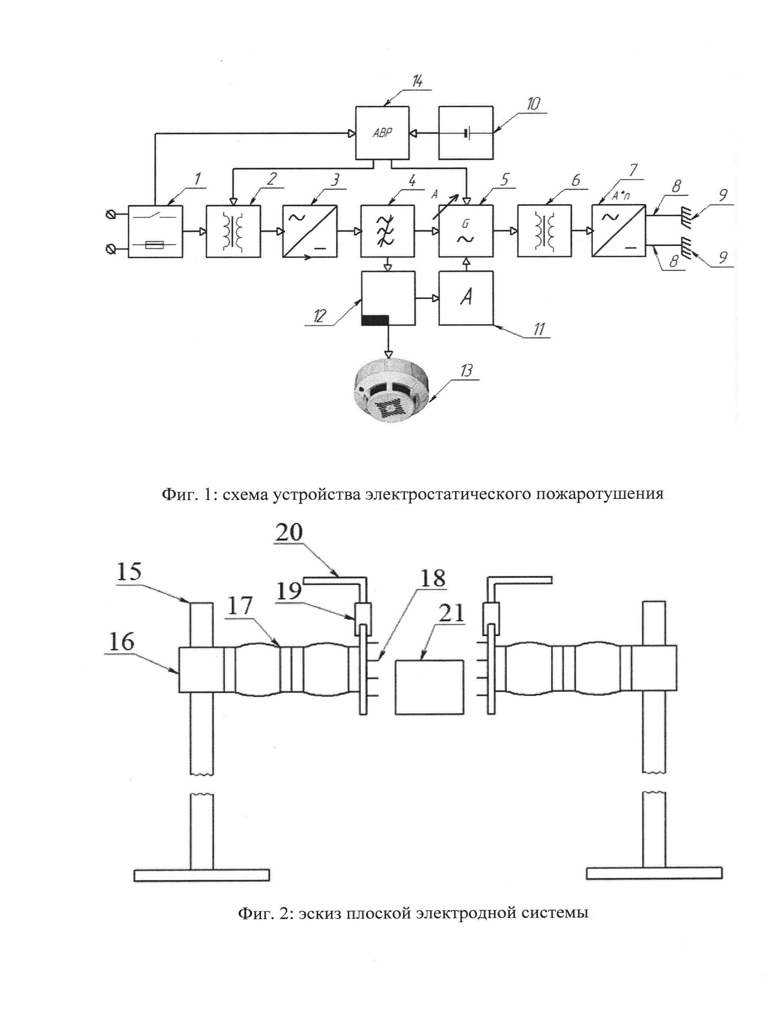 1. Устройство злектростатического пожаротушения, характеризующееся тем, что содержит связанные друг с другом: блок пускорегулирующей и защитной аппаратуры (1), понижающий трансформатор (2), двухполупериодный выпрямитель (3), сглаживающий фильтр (4), генератор синусоидального напряжения с регулируемой амплитудой выходного сигнала (5); высоковольтный трансформатор (6), резервный автономный источник электрической энергии (10) в виде аккумуляторной батареи, электродную систему (9), блок автоматического управления силовой системой устройства (11), прибор приемно-контрольный пожарный (12), комплекс средств регистрации возгорания (13), блок автоматического ввода резервного автономного источника электрической энергии (14), выполненный с возможностью автоматического включения резервного автономного источника электрической энергии (10); при этом электродная система (9) выполнена с возможностью воздействия на первичную реакционную зону факела пламени неоднородным статическим электрическим полем; источником напряжения, приложенного к электродной системе (9), является соединенный с высоковольтным трансформатором (6) двухполупериодный умножитель напряжения (7), выходные контакты которого электрически соединены высоковольтной кабельной линией (8) с электродной системой (9). 2. Устройство электростатического пожаротушения по п. 1, отличающееся тем, что электродная система выполнена в виде плоской электродной системы, выполненной с возможностью тушения возгораний твердых горючих веществ, проливов легковоспламеняющихся и горючих жидкостей. 3. Устройство электростатического пожаротушения по п. 1, отличающееся тем, что электродная система выполнена в виде цилиндрической электродной системы, выполненной с возможностью тушения нефтяных и газовых фонтанов. 4. Устройство электростатического пожаротушения по п. 1, отличающееся тем, что электродная система выполнена в виде модульной электродной системы, включающей плоский электрод и группу концентрических электродов, имеющих в разрезе игольчатую форму, выполненной с возможностью защиты помещений в зданиях и сооружениях от свободно развивающегося пожара. 5. Устройство электростатического пожаротушения по п. 1, отличающееся тем, что содержит блок автоматического ввода резервного автономного источника электрической энергии для обеспечения автономной работы устройства и тушения очага возгорания в условиях отсутствия напряжения в электрической сети объекта защиты от пожарной опасности.