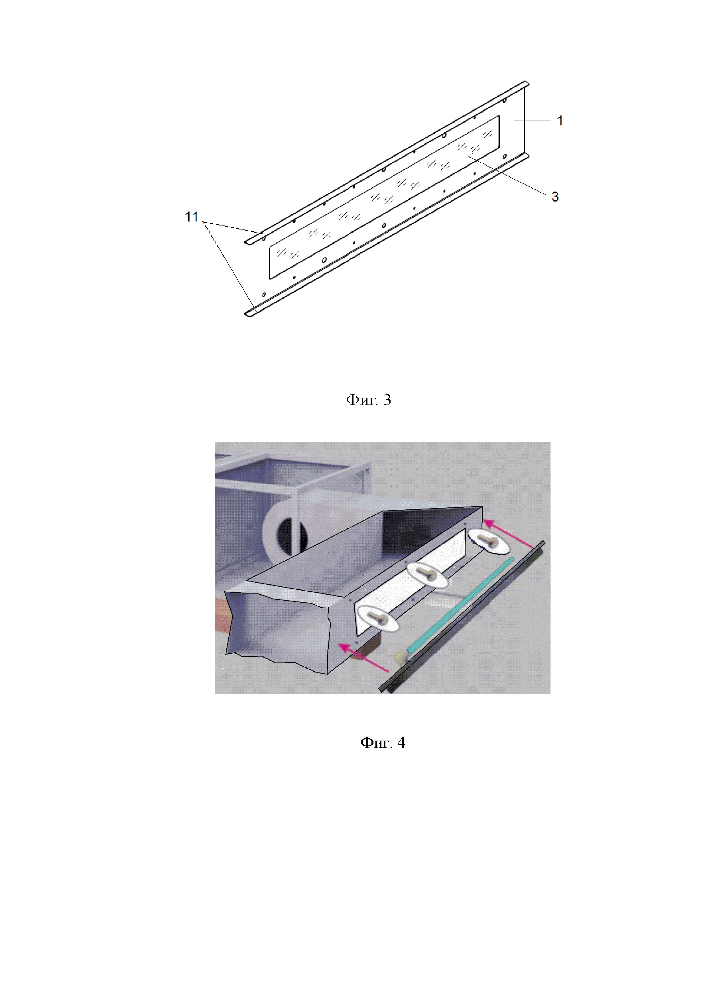 1. Устройство для обеззараживания воздуха в трубах внутренней вентиляции, содержащее источник бактерицидного излучения, корпус, имеющий незамкнутое поперечное сечение, выполненный с образованием внутренней полости, и переходник в виде прямоугольной пластины, выполненный с возможностью установки на прямоугольный вырез шириной 55 мм и длиной 245 мм или шириной 55 мм и длиной 445 мм, при этом в центральной части пластины содержится плафон с закрепленным патроном для установки источника бактерицидного излучения; во внутренней полости корпуса размещены элементы коммутации и управления; по периметру переходника выполнены отверстия для крепления переходника к трубе внутренней вентиляции, а по периметру корпуса выполнены отверстия для крепления корпуса к переходнику.