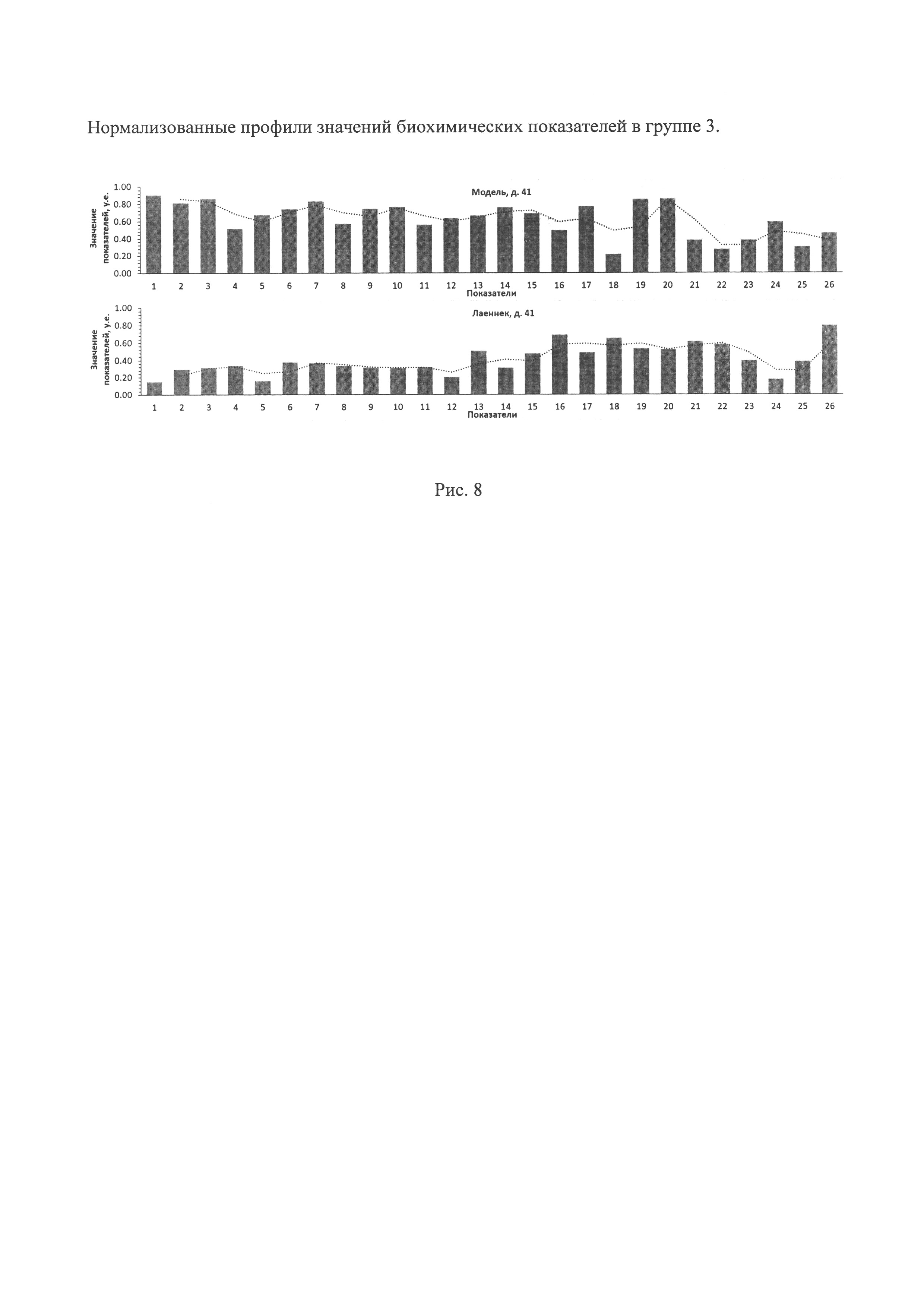 Нормализованные профили значений биохимических показателей при применении ГПЧ Лаеннек на 41 день представлены на профиль-диаграмме (рис. 8). Для Лаеннека характерно, прежде всего, снижение значений показателей 1-12 (показатели обмена железа: ферритин, коэффициент насыщения трансферрина железом,железо сыворотки и показатели общего анализа крови: ретикулоциты, эритроциты и др.), нормализация (снижение) ACT, АЛТ (показатели 19, 20).