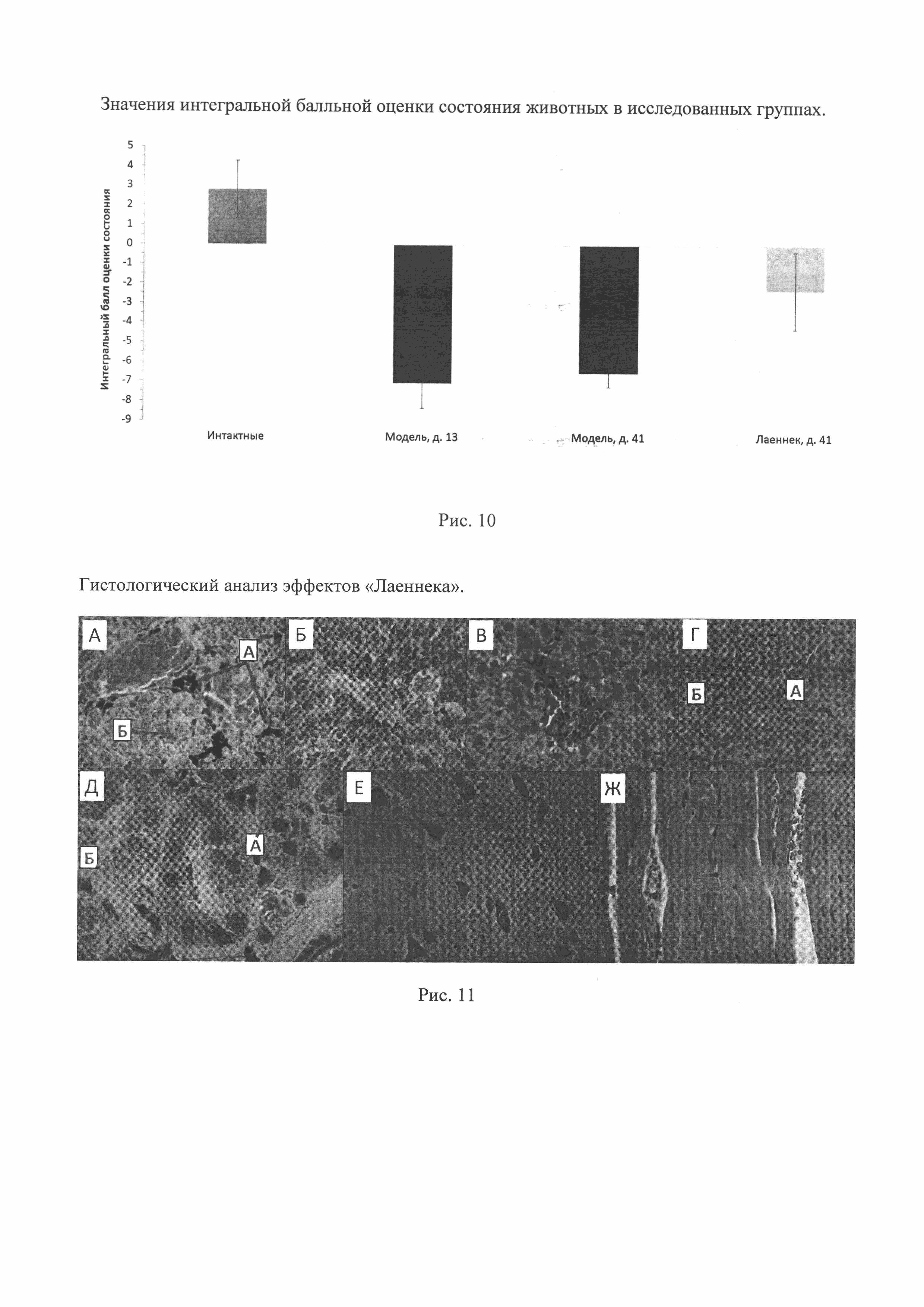 Изобретение относится к медицине, а именно к гепатологии, экспериментальной медицине, и может быть использовано для оценки эффективности применения лекарственного препарата Лаеннек на фармакологической модели неалкогольной жировой болезни печени с перегрузкой железом у экспериментальных животных – крыс. Осуществляют внутрибрюшинное введение железа сернокислого (II) 7-водного (хч) в дозе 50 мг/кг/сут, в условиях перорального избыточного потребления твердой фракции пальмового масла в дозировке 30 г/кг/сут и раствора фруктозы из расчета 1 г/кг/сут в течение 12 дней. Затем вводят препарат Лаеннек в дозе 0,6 мл/кг массы в сутки, внутримышечно, в течение 4 недель. Затем проводят биохимический и общий анализ крови. При показателях: ферритине от 127 до 175 мкг/л, коэффициенте насыщения трансферрина железом от 25 до 39% и железа в сыворотке крови от 20 до 30 мкмоль/л, ACT от 115,3 до 222,3 Ед/л, АЛТ от 30,4 до 46,6 Ед/л, лейкоцитов от 1,9×109до 7,7×109 кл/л, тромбоцитов от 547,6×109до 734,4х109 кл/л, общего белка от 53,5 до 61,7 г/л, креатинина от 27 до 30,6 мкмоль/л и СКФ от 165 до 178,2 мл/мин/1,73 м2 оценивают терапию препаратом Лаенннек, как эффективную. Способ обеспечивает возможность доказательства эффективности применения стандартизированного гидролизата плаценты человека лекарственного препарата Лаеннек за счет оценки эффективности применения Лаеннек на гистологической подтвержденной модели неалкогольной жировой болезни печени с полиорганной патологией у крыс, вызванной сочетанными приемом избытка жиров - пальмового масла, углеводов - фруктозы и неорганического железа - сульфата железа, с использованием доказательств в виде изменения клинических, биохимических, показателей общего анализа крови и гистологических маркеров. 21 ил., 9 пр.