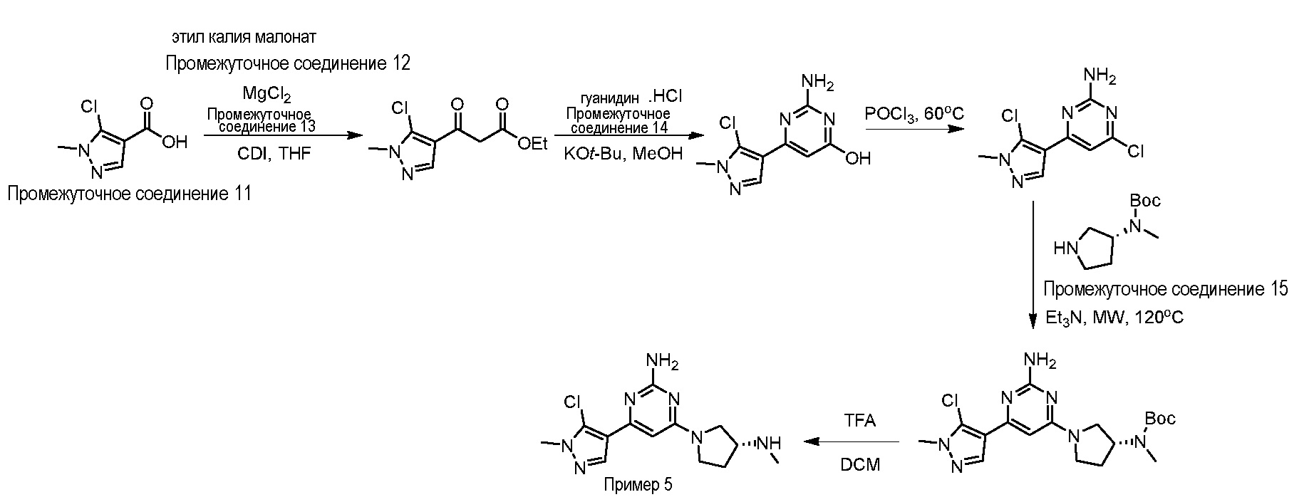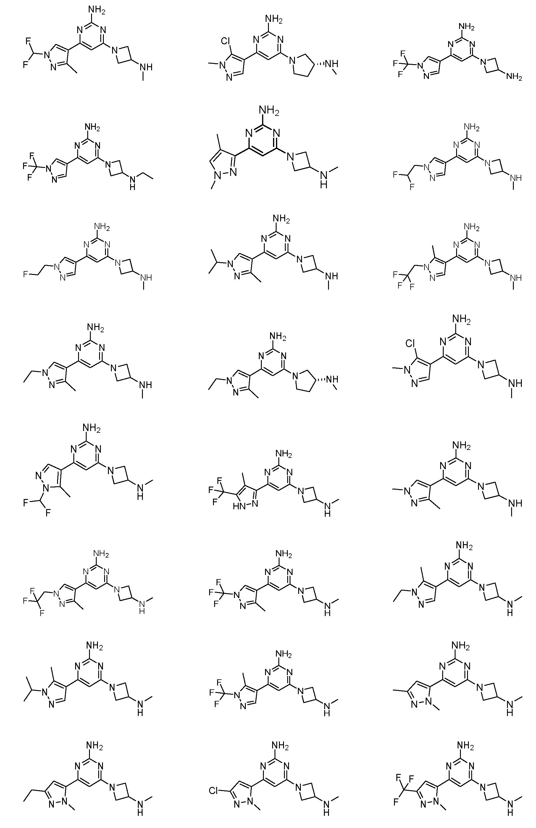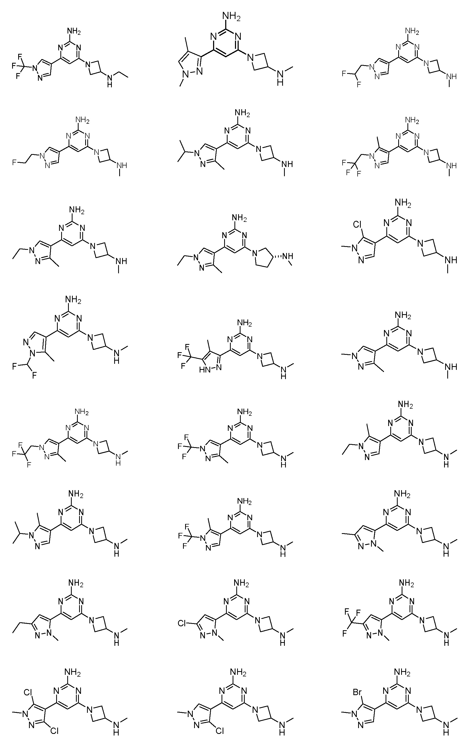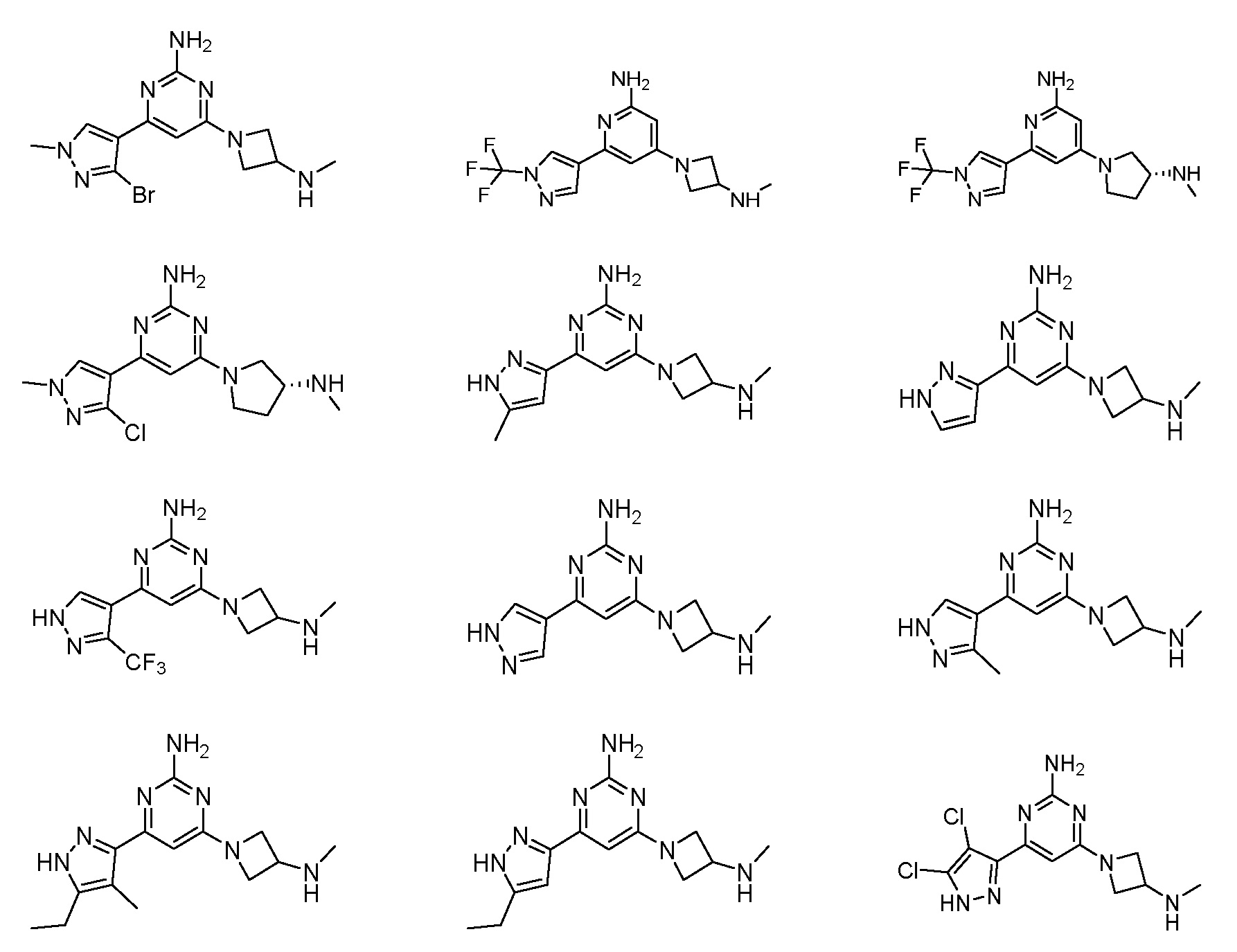 1 4-(1-(дифторметил)-1H-пиразол-4-ил)-6-(3-(метиламино)азетидин-1-ил)пиримидин-2-амина; 2 4-(3-(метиламино)азетидин-1-ил)-6-(1-(2,2,2-трифторэтил)-1H-пиразол-4-ил)пиримидин-2-амина; 3 4-(1-этил-1H-пиразол-4-ил)-6-(3-(метиламино)азетидин-1-ил)пиримидин-2-амина; 4 4-(1-(дифторметил)-3-метил-1H-пиразол-4-ил)-6-(3-(метиламино)азетидин-1-ил)пиримидин-2-амина; 5 ( 6 4-(3-аминоазетидин-1-ил)-6-(1-(трифторметил)-1H-пиразол-4-ил)пиримидин-2-амина; 7 4-(3-(этиламино)азетидин-1-ил)-6-(1-(трифторметил)-1H-пиразол-4-ил)пиримидин-2-амина; 8 4-(1,4-диметил-1H-пиразол-3-ил)-6-(3-(метиламино)азетидин-1-ил)пиримидин-2-амина; 9 4-(1-(2,2-дифторэтил)-1H-пиразол-4-ил)-6-(3-(метиламино)азетидин-1-ил)пиримидин-2-амина; 10 4-(1-(2-фторэтил)-1H-пиразол-4-ил)-6-(3-(метиламино)азетидин-1-ил)пиримидин-2-амина; 11 4-(1-изопропил-3-метил-1 12 4-(5-метил-1-(2,2,2-трифторэтил)-1 13 4-(1-этил-3-метил-1 14 ( 15 4-(5-хлор-1-метил-1 16 4-(1-(дифторметил)-5-метил-1H-пиразол-4-ил)-6-(3-(метиламино)азетидин-1-ил)пиримидин-2-амина; 17 4-(4-метил-5-(трифторметил)-1H-пиразол-3-ил)-6-(3-(метиламино)азетидин-1-ил)пиримидин-2-амина; 18 4-(1,3-диметил-1H-пиразол-4-ил)-6-(3-(метиламино)азетидин-1-ил)пиримидин-2-амина; 19 4-(3-метил-1-(2,2,2-трифторэтил)-1H-пиразол-4-ил)-6-(3-(метиламино)азетидин-1-ил)пиримидин-2-амина; 20 4-(3-метил-1-(трифторметил)-1H-пиразол-4-ил)-6-(3-(метиламино)азетидин-1-ил)пиримидин-2-амина; 21 4-(1-этил-5-метил-1H-пиразол-4-ил)-6-(3-(метиламино)азетидин-1-ил)пиримидин-2-амина; 22 4-(1-изопропил-5-метил-1H-пиразол-4-ил)-6-(3-(метиламино)азетидин-1-ил)пиримидин-2-амина; 23 4-(5-метил-1-(трифторметил)-1H-пиразол-4-ил)-6-(3-(метиламино)азетидин-1-ил)пиримидин-2-амина; 24 4-(1,3-диметил-1H-пиразол-5-ил)-6-(3-(метиламино)азетидин-1-ил)пиримидин-2-амина; 25 4-(3-этил-1-метил-1H-пиразол-5-ил)-6-(3-(метиламино)азетидин-1-ил)пиримидин-2-амина; 26 4-(3-хлор-1-метил-1H-пиразол-5-ил)-6-(3-(метиламино)азетидин-1-ил)пиримидин-2-амина; 27 4-(1-метил-3-(трифторметил)-1H-пиразол-5-ил)-6-(3-(метиламино)азетидин-1-ил)пиримидин-2-амина; 28 4-(3,5-дихлор-1-метил-1H-пиразол-4-ил)-6-(3-(метиламино)азетидин-1-ил)пиримидин-2-амина; 29 4-(3-хлор-1-метил-1H-пиразол-4-ил)-6-(3-(метиламино)азетидин-1-ил)пиримидин-2-амина; 30 4-(5-бром-1-метил-1H-пиразол-4-ил)-6-(3-(метиламино)азетидин-1-ил)пиримидин-2-амина; 31 4-(3-бром-1-метил-1H-пиразол-4-ил)-6-(3-(метиламино)азетидин-1-ил)пиримидин-2-амина; 32 4-(3-(Метиламино)азетидин-1-ил)-6-(1-(трифторметил)-1H-пиразол-4-ил)пиридин-2-амина; 33 ( 34 ( 35 4-(5-метил-1H-пиразол-3-ил)-6-(3-(метиламино)азетидин-1-ил)пиримидин-2-амина; 36 4-(3-(Метиламино)азетидин-1-ил)-6-(1H-пиразол-3-ил)пиримидин-2-амина; 37 4-(3-(Метиламино)азетидин-1-ил)-6-(3-(трифторметил)-1H-пиразол-4-ил)пиримидин-2-амина; 38 4-(3-(Метиламино)азетидин-1-ил)-6-(1H-пиразол-4-ил)пиримидин-2-амина; 39 4-(3-метил-1H-пиразол-4-ил)-6-(3-(метиламино)азетидин-1-ил)пиримидин-2-амина; 40 4-(5-этил-4-метил-1H-пиразол-3-ил)-6-(3-(метиламино)азетидин-1-ил)пиримидин-2-амина; 41 4-(5-этил-1H-пиразол-3-ил)-6-(3-(метиламино)азетидин-1-ил)пиримидин-2-амина; 4 4-(4,5-дихлор-1H-пиразол-3-ил)-6-(3-(метиламино)азетидин-1-ил)пиримидин-2-амина;