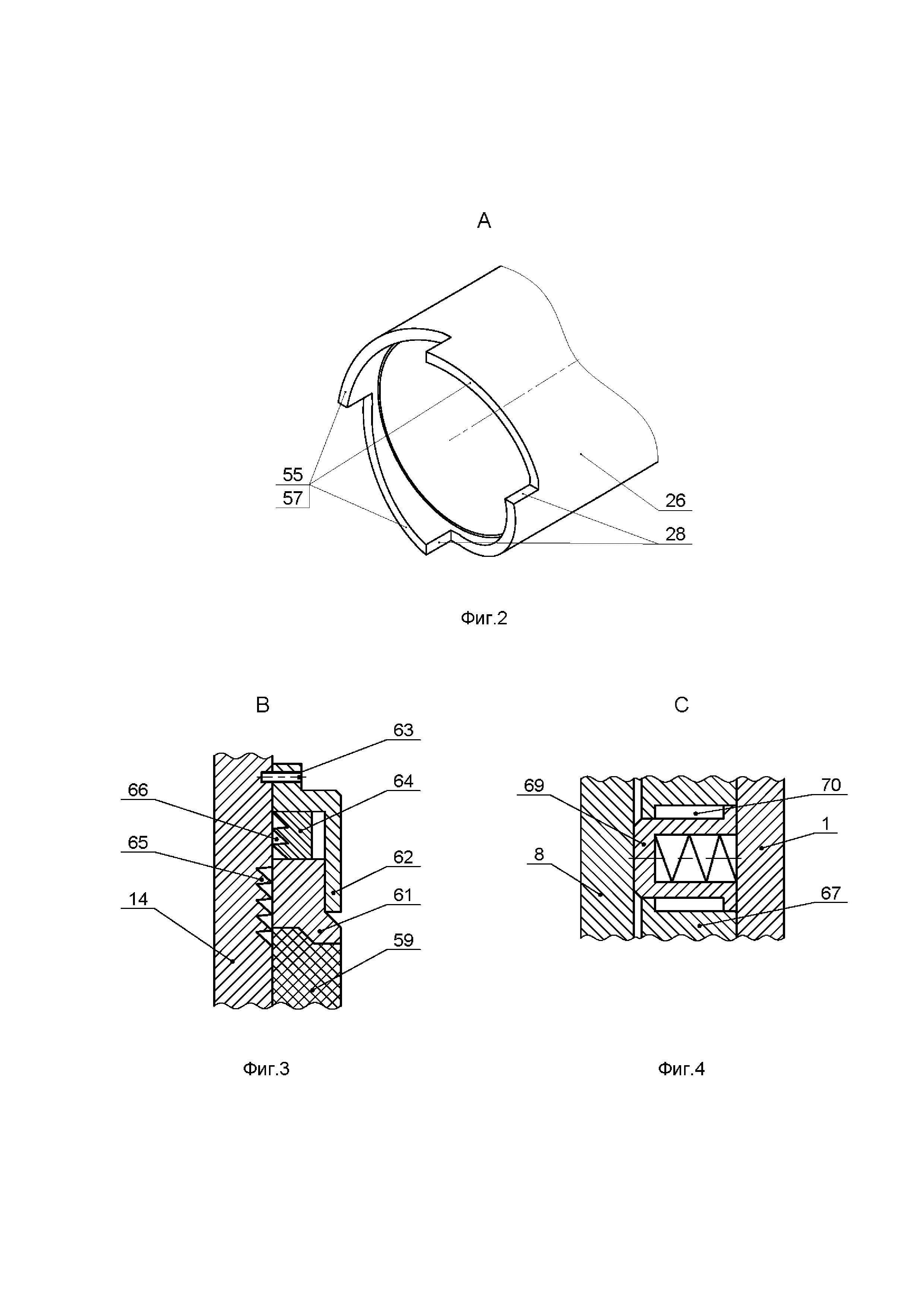 • причем в расточке поджимной ступенчатой втулки 62 установлен нижний стопор 64 (фиг.3) в виде подвижного разжатого разрезного упруго деформируемого кольца, взаимодействующего с внутренним торцом расточки поджимной ступенчатой втулки 62 и верхним торцом подвижного верхнего упорного кольца 61, причем на части проточки нижней ступени верхнего ствола 14 выполнена упорная резьба 65 с шагом Т3, а на внутренней поверхности нижнего стопора 64 выполнена ответная упорная резьба 66 с шагом Т3, взаимодействующая с упорной резьбой 65 при активации пакерного узла 58.