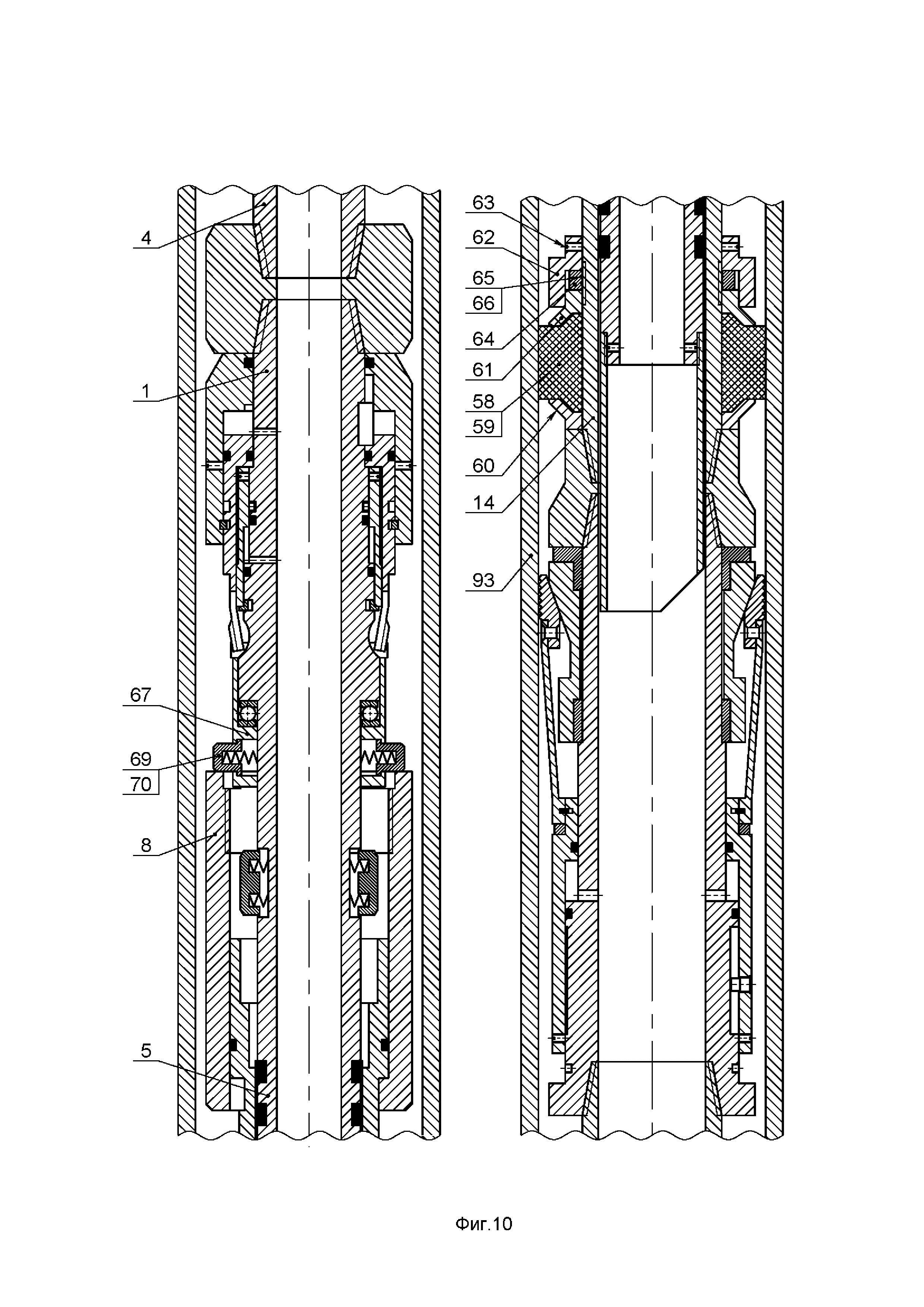 Для этого осуществляют спуск несущей колонны труб 4 с корпусом 1 до контакта подпружиненных упоров 69 с верхним торцом воронки 8 и разгружают несущую колонну труб 4 вниз для перемещения воронки 8 по верхнему стволу вниз до контакта с поджимной ступенчатой втулкой 62 для среза винтов 63, связывающих поджимную ступенчатую втулку 62 с верхним стволом 14, и последующего перемещения поджимной ступенчатой втулки 62 вниз для воздействия на подвижное верхнее упорное кольцо 61 с целью его перемещения вниз и сжатия эластичного элемента 59, взаимодействующего с неподвижным нижним упорным кольцом 60, до плотного контакта с внутренней поверхностью обсадной колонны 93.