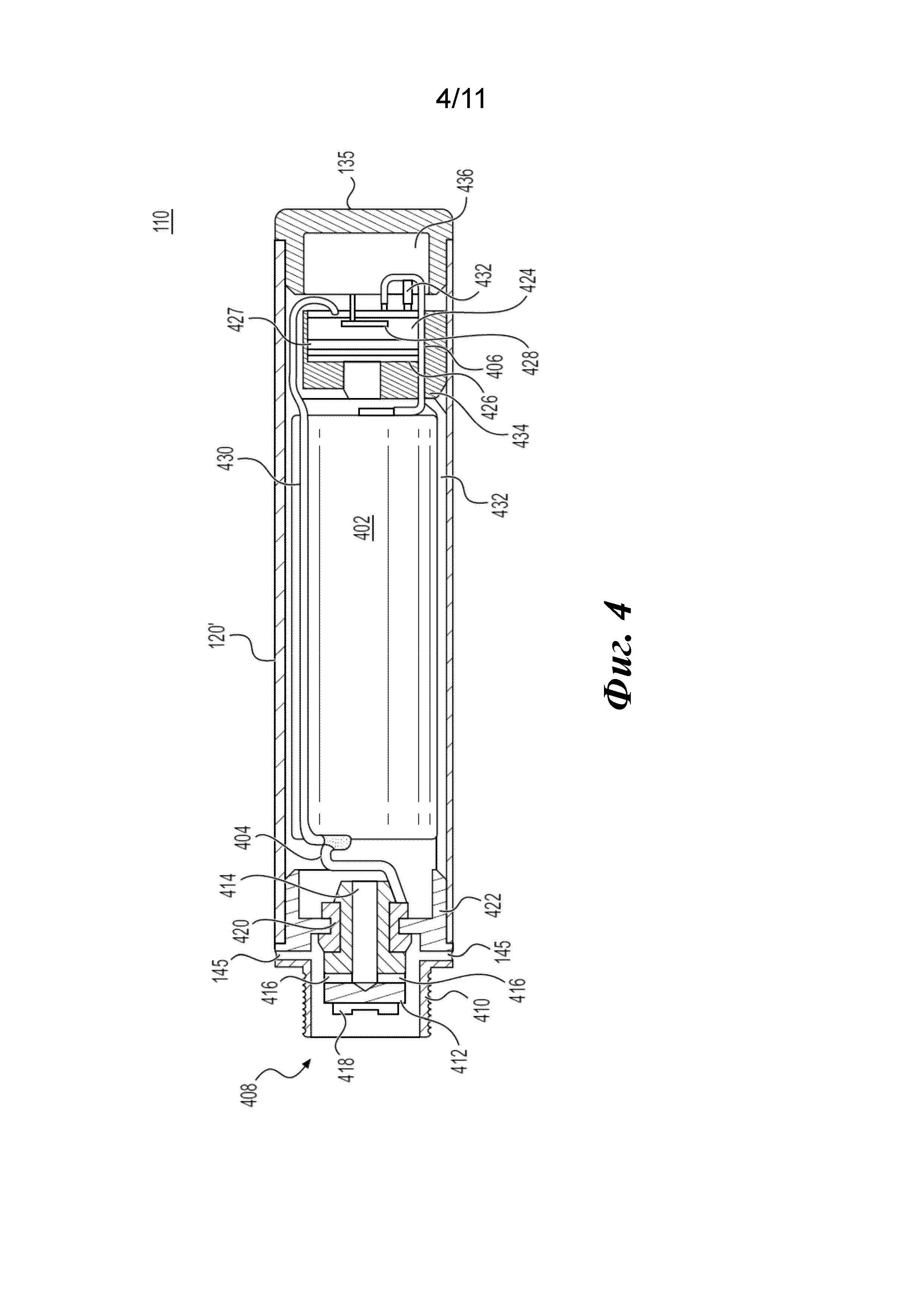 Настоящее изобретение относится к электронному устройству для вейпинга, или электронному устройству для парения, никотина. Электронное устройство для вейпинга, или электронное устройство для парения, никотина содержит нагревательный элемент, который испаряет содержащий никотин готовый состав для пара для получения пара никотина. Электронное устройство для парения никотина содержит блок питания, такой как перезаряжаемая батарея, расположенный в устройстве. Блок питания электрически соединен с нагревателем. Блок питания обеспечивает питание для нагревателя так, что нагреватель нагревается до температуры, достаточной для преобразования содержащего никотин готового состава для пара в пар никотина. Пар никотина выходит из электронного устройства для парения никотина через мундштук, содержащий по меньшей мере один выход. Из уровня техники известно техническое решение, раскрытое в публикации RU 2704891 C2 и относящееся к картриджу для системы генерирования аэрозоля, при этом картридж содержит датчик, содержащий конденсатор с первой и второй пластинами конденсатора, часть для хранения жидкости для удерживания жидкого образующего аэрозоль субстрата и испаритель, причем часть для хранения жидкости расположена между первой и второй пластинами конденсатора, при этом диэлектрическая проницаемость части для хранения жидкости изменяется при изменении объема жидкого образующего аэрозоль субстрата, удерживаемого в части для хранения жидкости, причем датчик сконфигурирован для измерения емкости конденсатора, при этом измеренная емкость относится к соответствующей диэлектрической проницаемости жидкого образующего аэрозоль субстрата, удерживаемого в части для хранения жидкости, так что величина объема жидкого образующего аэрозоль субстрата, удерживаемого в части для хранения жидкости, может быть определена по измеренной емкости. В публикации RU 2719243 C2 описана электрически управляемая система генерирования аэрозоля, включающая в себя часть для хранения жидкости, в которой хранится жидкость, из которой может быть получен аэрозоль, электрический нагреватель, капиллярный фитиль, расположенный между жидкостью в части для хранения жидкости и электрическим нагревателем и выполненный с возможностью подачи жидкости из части для хранения жидкости в электрический нагреватель, и электрическую схему, соединенную с электрическим нагревателем, причем электрическая схема выполнена с возможностью: активации электрического нагревателя на период испарения в ответ на ввод данных пользователем для испарения жидкости в капиллярном фитиле, первого заданного времени после периода испарения, активации нагревателя на второй период, регистрации измерения температуры нагревателя во время второго периода и определения уровня жидкости в части для хранения жидкости на основе измерения температуры. По меньшей мере один примерный вариант осуществления предоставляет электронное устройство для парения никотина, содержащее: резервуар для никотина, выполненный с возможностью удержания содержащего никотин готового состава для пара; фитиль, выполненный с возможностью вытягивания содержащего никотин готового состава для пара из резервуара для никотина; нагревательный элемент, выполненный с возможностью нагрева содержащего никотин 