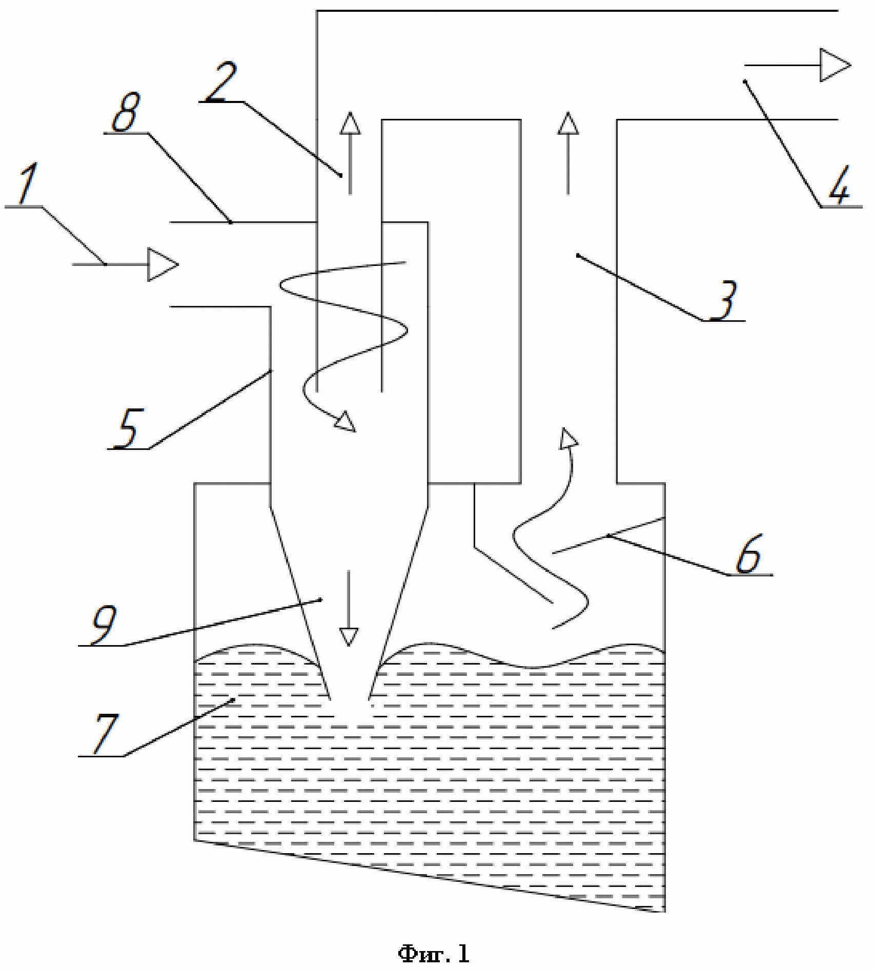 Изобретение предназначено для очистки газа. Широкое распространение в различных отраслях промышленности получили способы сухой инерционной очистки газа, осуществляемые с помощью циклонов. Разработанные возвратно-поточные циклоны различных конструкций имеют общий принцип действия - закрученный пылевой поток делает разворот и направляется к центру аппарата в выхлопную трубу. Отсепарированные твердые или жидкие частицы направляются в нижнюю часть устройства - в бункер приема пыли. На эффективность сепарации частиц влияет траектория движения газа, сформированная геометрией аппарата, скорость потока газа, его температура и другие параметры. При этом для эффективной сепарации необходимо, чтобы бункер приема пыли был газоплотный и исключал подсосы воздуха снаружи устройства. Также известно, что организация отбора части газов из циклона через бункер приема пыли повышает степень очистки газов, направляющихся в выхлопную трубу. Существуют способы мокрой очистки газа. Известны аппараты мокрой газоочистки ударного действия, например ротоклоны. Принцип работы таких скрубберов основан на столкновении потока газов с толщей воды и последующим движением через толщу брызг и капель. Очищенный в скрубберах газ обычно имеет относительную влажность не ниже 99% при эффективной работе каплеуловителей, при этом незначительное снижение температуры очищенных газов вызывает конденсацию жидкости. По этой причине газоходы на выходе из скруббера требуют утепления. Но даже при утепленных участках газоходов происходит частичная конденсация влаги в выхлопной или дымовой трубе, вызывая химическую коррозию и разрушение материала стен. Вторым негативным моментом повышенной влажности газов является конденсация влаги в тягодутьевых машинах, дымососах или вентиляторах. В зонах локального разряжения за лопатками рабочего колеса происходит конденсация влаги и налипание на смоченные поверхности неуловленных пылевых частиц, вызывая нарастание отложений. Со временем этот эффект приводит к дисбалансу рабочего колеса вентилятора, вибрациям и разрушению подшипников. По этой причине требуется регулярно проводить ремонт и чистку вентиляторов, что сопряжено с рядом трудностей. Как вариант борьбы с негативными последствиями повышенной влажности рекомендуется подогревать очищенные газы минимум на 5-10 градусов, чтобы отдалиться от точки росы дымовых газов. Такой нагрев требует установку теплообменника газ/газ в зоне горячих запыленных газов, или установку дополнительной газовой горелки в зоне очищенных газов, или применение иных мер, нацеленных на общее повышение температуры очищенных газов и снижение их относительной влажности. Комбинация сухого и мокрого способов очистки газов позволит существенно увеличить эффективность пылеулавливания, устранив при этом недостатки мокрых скрубберов, связанных с повышенной влажностью очищенных газов. Известен способ очистки потока отходящих газов (патент РФ № 2393910, 2009 г., B01D 45/00, B04C 9/00). Изобретение относится к способам сухой пылеочистки без применения воды или водных растворов и не способно абсорбировать газообразные вредные примеси. Известен центробежно-вихревой двухпоточный сепаратор (патент № 2760690, 2021 г., B01D 45/12), представляющий собой эффективный улавливатель капельной жидкости. Такой аппарат