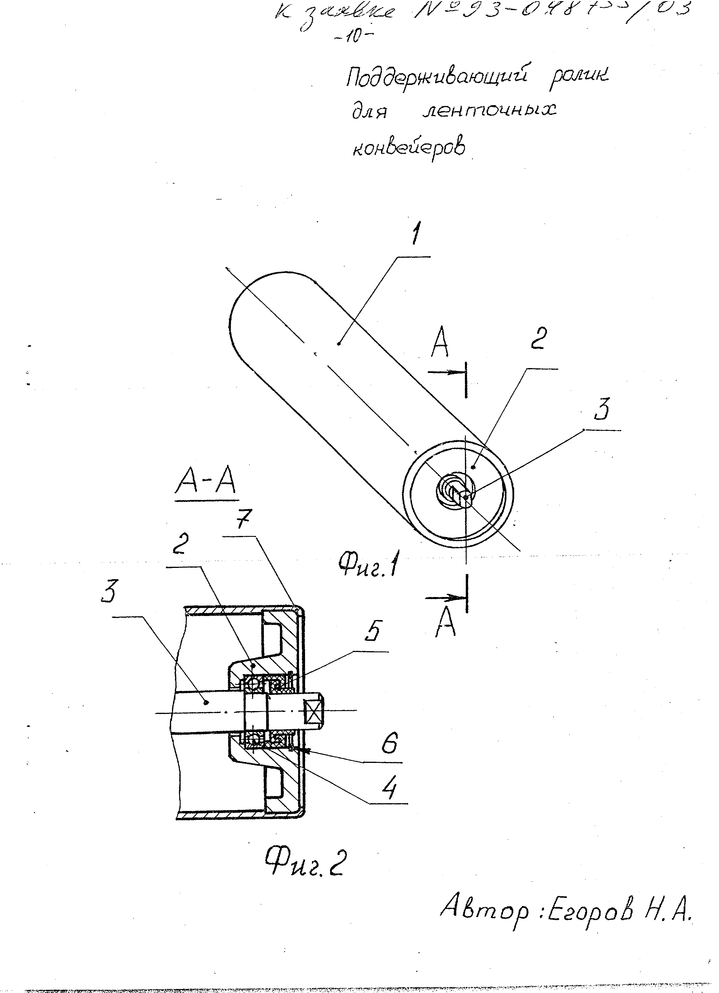 Поддерживающий ролик для ленточных конвейеров, содержащий корпус в виде отрезка металлической трубы с внутренней проточкой краев и ось, соединенные между собой подшипниковыми стаканами, снабженными подшипниками качения и лабиринтными уплотнениями со стопорными элементами, отличающийся тем, что на концах оси выполнены две цилиндрические выточки с различными диаметрами для подшипника и уплотнения соответственно, причем лабиринтное уплотнение выполнено из пластмассы, подшипниковые стаканы закреплены в проточках трубы завальцовкой, глубина проточки краев внутренней поверхности трубы выбрана больше толщины цилиндрической части подшипникового стакана на величину завальцовки.
