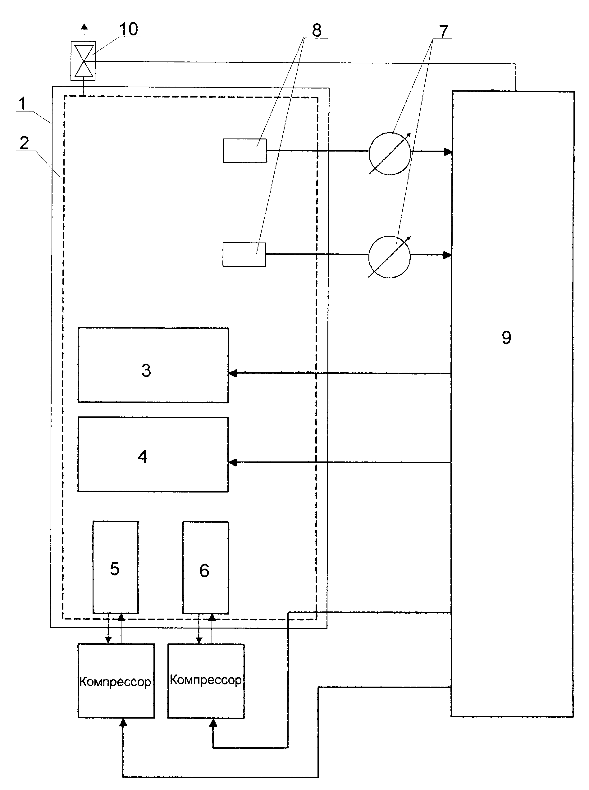1. Изотермический модуль для жидкой двуокиси углерода системы пожаротушения, состоящий из резервуара горизонтального типа, включающего внутренний сосуд, устройства автоматического поддержания давления во внутреннем сосуде, запорно-пускового устройства, обеспечивающего открытие, закрытие и блокировку подачи жидкой двуокиси углерода из резервуара в трубопровод, и блока управления, отличающийся тем, что устройство автоматического поддержания давления во внутреннем сосуде включает в себя электронагреватель, холодильную установку с испарителем и электроконтактный манометр с чувствительным элементом, соединенный с блоком управления.2. Изотермический модуль по п.1, отличающийся тем, что он содержит дополнительно, по меньшей мере, один электронагреватель, одну холодильную установку с испарителем и один электроконтактный манометр.3. Изотермический модуль по п.1, отличающийся тем, что электронагреватель, испаритель холодильной установки и чувствительный элемент электроконтактного манометра вмонтированы во внутренний сосуд.