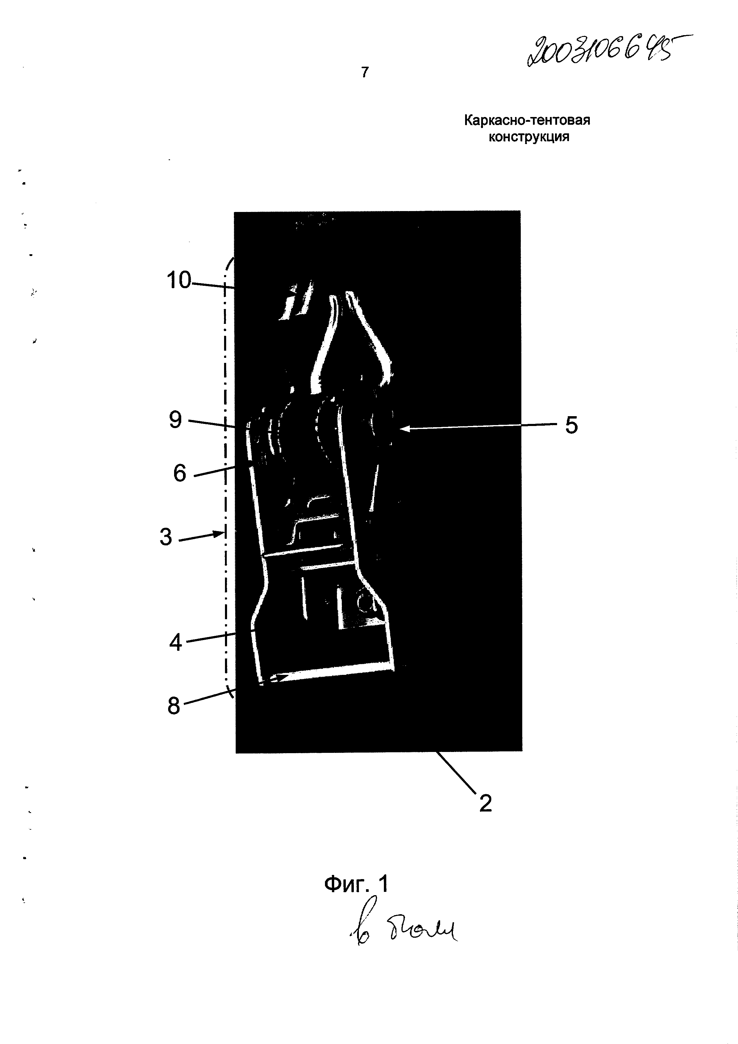 Каркасно-тентовая конструкция, содержащая тент крыши на каркасе со стойками, отличающаяся тем, что на части стоек или на каждой стойке закреплена, по меньшей мере, одна рычажно-храповая лебедка для натяжения тента.