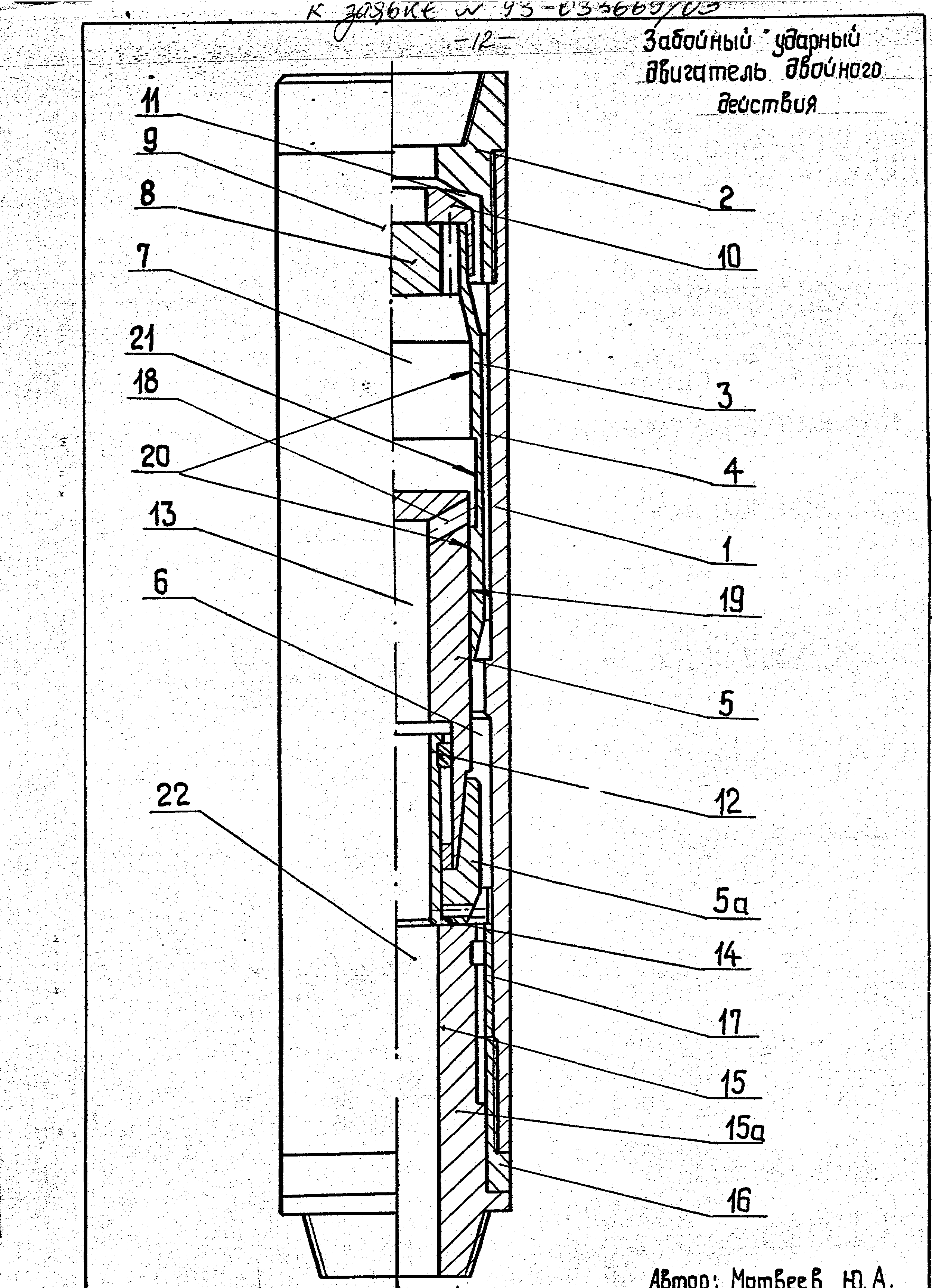 , -Рабошй дант в через-шаддевой зазор И, обводны канаки 4 шстудат в поршневую йш0рй-6, проходит через/ / TopiGteBot зазор шшшй к аноьг. 12 и наковальней 14 и цент ршшше вйхяюшое отверсдае 22 шт-ока 15 на забой сква: шш. . Щ)й шОшовке н забоГ ршщ наковальни 15 смыкаются ,, ввхлошоеотверстие 22 штока 15а дере ается,клаланом 12. Ра|5о 1 агент .поступает в йижнш пбршеда) камеру 6. Под действием :давления поршень ударник 5, 5а нашнаетхолостой ход, . веяний кла . пан Й-шрекривает жодае отверотй я 9. в :верй1ем торце 8 пз линдра 3, а нйшшйкд ан:,: силбй, ,дейстдаще|: на Йерез отверстиев нйдаей части За поршЁя ужарШка)-прижимается к нако -вальна 16,акрывая цщлопное отйвретйе 22. Верхняя надпоршевая камера 7.ерез о верстае 18 и внутренний дентражьшй канал 13 дорнр-дарника 5и кладааТЙ сЪе няется с зоной низкого давления (заэ рубнш пространством).
