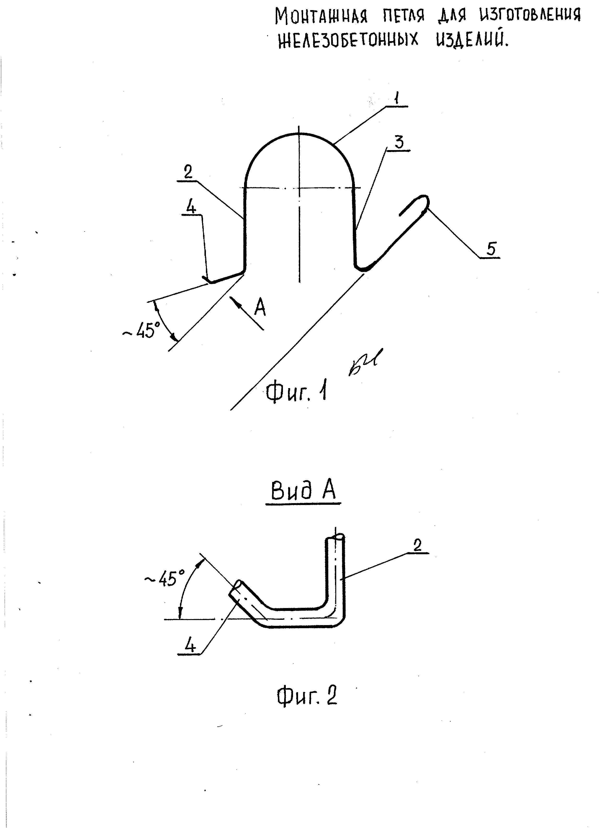1. Монтажная петля для изготовления железобетонных изделий, включающая проушину, ветви и крюки, отличающаяся тем, что профиль монтажной петли имеет арочную форму, при этом проушина выполнена в виде полуокружности, ветви - изогнутыми и направленными в противоположные стороны относительно друг друга, причем плоскость профиля монтажной петли расположена перпендикулярно по отношению к плоскостям изогнутых ветвей с крюками на концах, при этом один из них, расположенный на конце короткой ветви, выполнен в виде загиба. 2. Монтажная петля по п.1, отличающаяся тем, что плоскость короткой изогнутой ветви расположена под углом ~45° по отношению к плоскости другой ветви. 3. Монтажная петля по п.1, отличающаяся тем, что угол загиба крюка короткой ветви составляет ~45° к горизонтальной плоскости.
