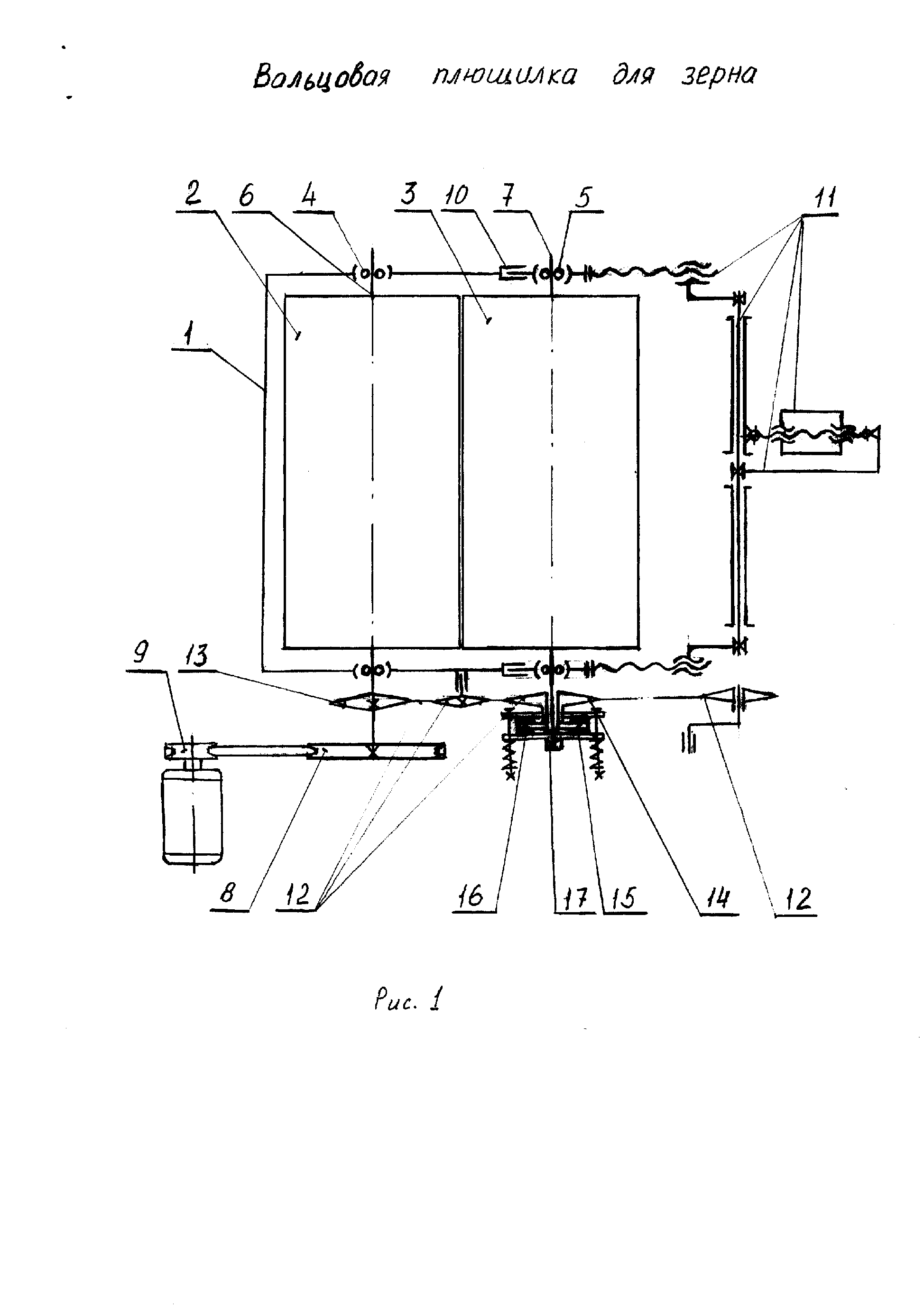 Вальцовая плющилка для зерна, содержащая раму, пару вальцов, установленных на раме в подшипниковых узлах на полуосях, механизм привала-отвала вальцов, один из вальцов неподвижно закреплен на раме с возможностью вращения и снабжен приводным шкивом, второй валец закреплен с возможностью плоскопараллельного перемещения в раме посредством механизма привала-отвала и кинематически связан гибкой передачей с неподвижным вальцом, отличающийся тем, что гибкая передача выполнена цепной передачей, а ведомая звездочка этой передачи снабжена элементами фрикционного сцепления с фрикционной полумуфтой, закрепленной на полуоси подвижного вальца.