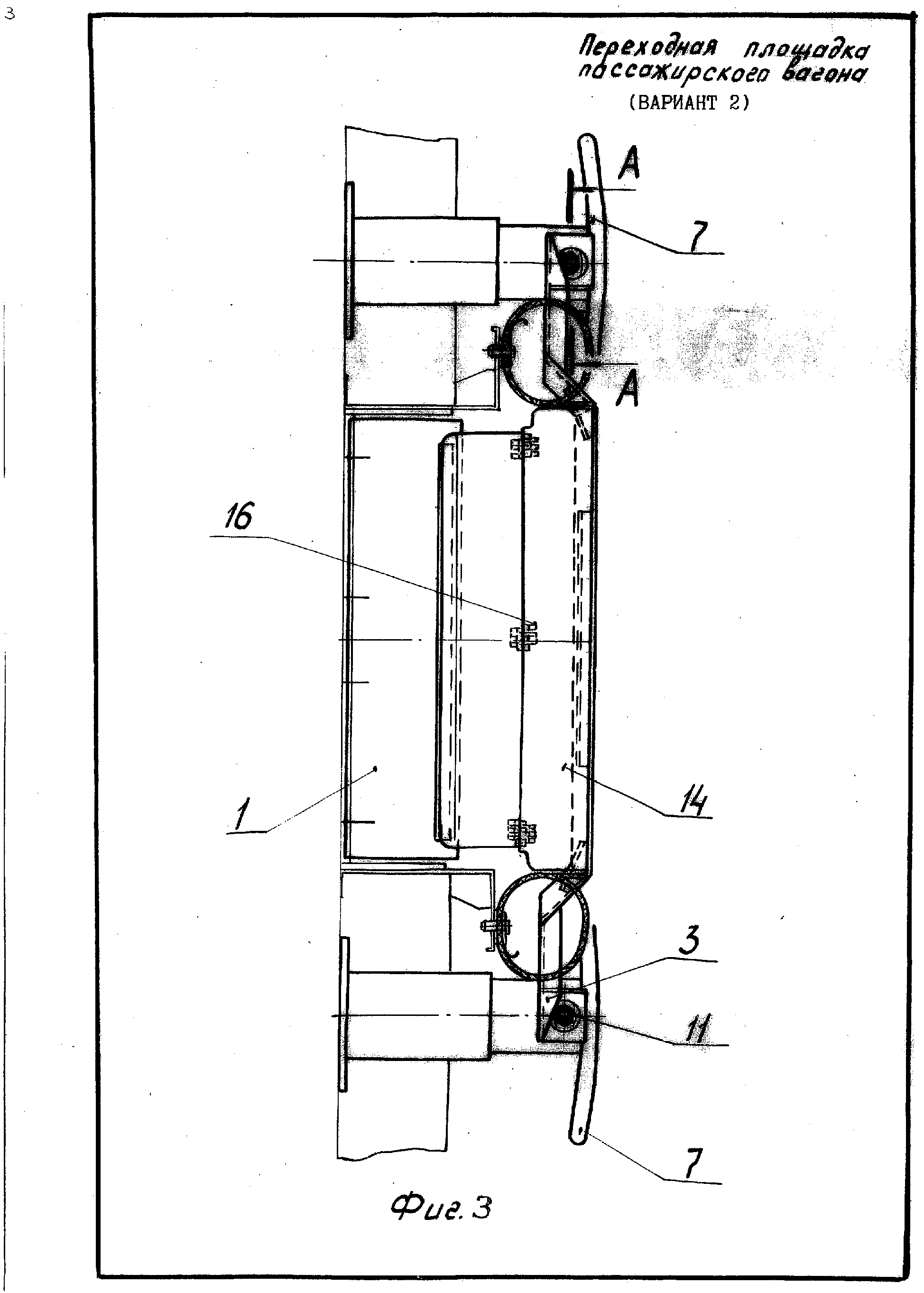 Заявляемая полезная модель относится к устройствам для перехода пассажиров из одного вагона в другой. Известна «Переходная площадка пассажирского вагона» (авт. св. СССР №1324901, В 61 Д 17/20, заявлено 31.03.1986 г.), в которой фартук (6) шарнирно соединен с поперечной балкой (4). На фартуке выполнена загнутая под углом к плоскости листа полка, на обратной стороне которой закреплена антифрикционная прокладка (8), с помощью которой фартук опирается на ступеньку (9), жестко закрепленную на торцевой стене вагона (10). Основной недостаток известной переходной площадки: отсутствует возможность отрегулировать по высоте расположение поперечных балок в межвагонном переходе в случае износа ходовых частей в буферах. Другим недостатком является перепад высот между несущим элементом балки и консольно закрепленной ступенькой на торцевой стене вагона. Это создает неудобство для пассажиров и обслуживающего персонала при перемещении ручной клади и продуктов из вагона-ресторана на тележках. Известна регулируемая по высоте опора в виде установочного винта (15). Гайка (16) служит для предохранения резьбового соединения от самоотвинчивания (А.Ф.Крайнов «Детали машин. Словарь-справочник», М., «Машиностроение», 1992 г., стр.186, схема «Ф»). Фиксирование вертикальной опоры требует расположения контргайки непосредственно над кронштейном тарели, что недостаточно надежно. За прототип принят «Мостик межвагонной» (свидетельство РФ 13784, В 61 Д 17/20, заявлено 22.11.1999 г.), содержащий ступеньку (2) торцевой стены, расположенную над буферами вровень с полом тамбура, поперечную балку, включающую концевые опоры с удлиненными отверстиями, соединенные шарнирно с кронштейнами буферных тарелей посредством закрепленных в кронштейнах вертикальных осей, пропущенных через удлиненные отверстия концевых опор и ограниченных каждая резьбовые шипом, несущим шайбу, зафиксированную контргайкой над концевой опорой с возможностью обеспечения свободного сдвига вертикальных осей относительно балки в пределах длины упомянутых отверстий, несущий элемент (3), прикрепленный к поперечной балке и связанный шарнирным соединением с фартуком (10), свободно опущенным на ступеньку (2) торцевой стены. Основным недостатком известного «Мостика межвагонного» является большой угол подъема фартука в переходе от ступеньки к поперечной балке, а также несоответствие высоты расположения поперечной балки одного вагона по отношению к высоте расположения поперечной балки другого вагона, обусловленное изношенностью ходовых частей, различным состоянием допусков на размеры, определяющих положение поперечных балок по высоте. Задачей предложения является повышение безопасности переходной площадки в эксплуатации за счет выравнивания фартука, связанного шарниром с несущим элементом поперечной балки, относительно ступеньки торцевой стены. По первому варианту переходная площадка пассажирского вагона содержит ступеньку торцевой стены, расположенную над буферами вровень с полом тамбура, поперечную балку, включающую концевые опоры с удлиненными отверстиями, соединенные шарнирно с кронштейнами буферных тарелей посредством закрепленных в кронштейнах вертикальных осей, пропущенных через удлиненные отверстия концевых опор и ограниченных каждая шипом, несущим шайбу, зафиксированную крепежным элементом над ко