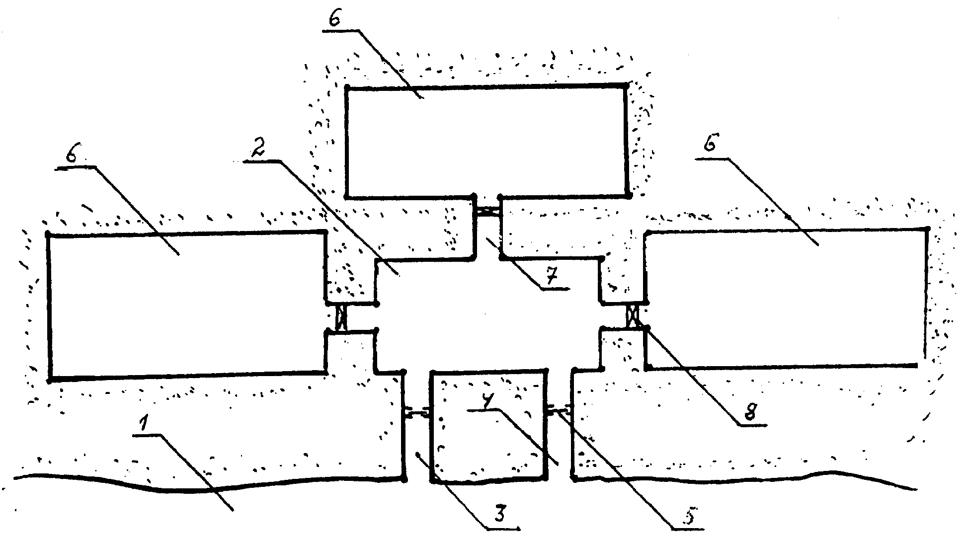 Полезная модель относится к озерному рыбоводству и может использоваться как при однолетнем, так и многолетнем выращивании рыбы в заморных и периодически заморных озерах. Известно устройство для выращивания рыбы, состоящее из заморного или периодически заморного озера, зарыбляемого трех-пяти дневными личинками пеляди, спустя 10-15 дней после распадения льда и облавливаемого осенью по открытой воде (в сентябре-октябре) или в подледный период лова (1). Однако в заморных, особенно в периодически заморных, озерах нередко обитает большое количество малоценных и хищных рыб (гольян, верховка, окунь и др.), которые за первые 3-5 дней после зарыбления полностью или почти полностью уничтожают (съедают) ослабленных после перевозки, еще не способных скрываться от хищников, личинок. Поэтому такие озера часто вообще не зарыбляются (нет смысла их зарыблять). Известно устройство для выращивания рыбы (принято за прототип), состоящее из заморного или периодически заморного озера и зимовального водоема-спутника, соединенного с озером водозаборным и водосбросным каналами со съемными перегородками (2). Водоем-спутник в известном устройстве весной используют для подращивания мелкого посадочного материала (мальков и личинок), предварительно освободив его от хищных рыб, путем, например, двух-трех кратного процеживания, а осенью и зимой для концентрации, зимнего содержания и вылова рыбы. Однако, вода в глубоком водоеме-спутнике, предназначенном для зимовки рыбы, весной прогревается медленно и, как следствие, медленно развивается кормовая база и растет рыба. Кроме того, возникает необходимость в ежегодном освобождении водоема-спутника от хищных рыб. Технический результат от использовании полезной модели заключается в улучшении условий подращивания молоди рыб (при более раннем прогреве воды и более высокой обеспеченности кормами), увеличении периода нагула и повышении продуктивности озер. Это достигается тем, что в устройстве для выращивания рыбы, состоящем из заморного или периодически заморного озера и водоема-спутника для зимовки и лова рыбы с водозаборным и водосборным каналами, имеющими съемные перегородки, около водоема-спутника расположены один или несколько, например три, спускных мелководных пруда, предназначенных для подращивания молоди или нереста производителей, соединенных с ним водоспусками. Это достигается и тем, что оно (устройство) снабжено одним или несколькими (в зависимости от количества спускных прудов) аэраторами-потокообразователями, например турбоаэраторами H16-ИАК мощностью 2-3 кВт конструкции ФГУП Госрыбцентра, используемыми летом для аэрации воды в спускных прудах, а осенью и зимой для концентрации рыбы в зоне облова, направления ее в ловушки и спасения от замора. На чертеже схематически изображено устройство для выращивания рыбы (вид сверху). Устройство состоит из заморного или периодически заморного озера 1, водоема-спутника 2, водозаборного 3 и водосбросного 4 каналов со съемными перегородками 5 и, расположенными около него тремя спускными мелководными прудами 6, с водоспусками 7 и стояками 8. Устройство работает следующим образом. До начала использования спускных прудов выполняют комплекс мероприятий, направленных на повышение рыбопродуктивности, к которым относятся удаление жесткой растительности, удобрени