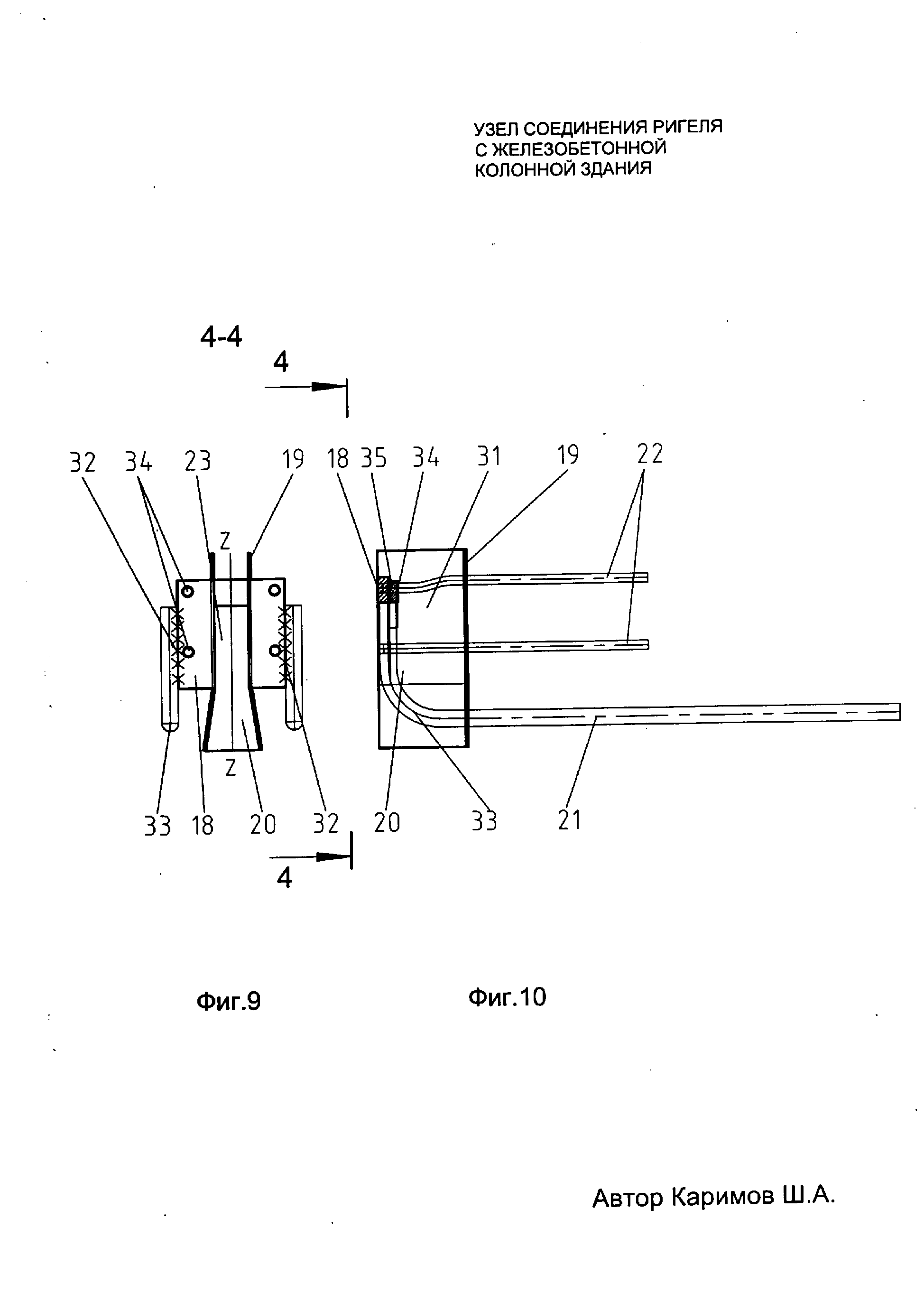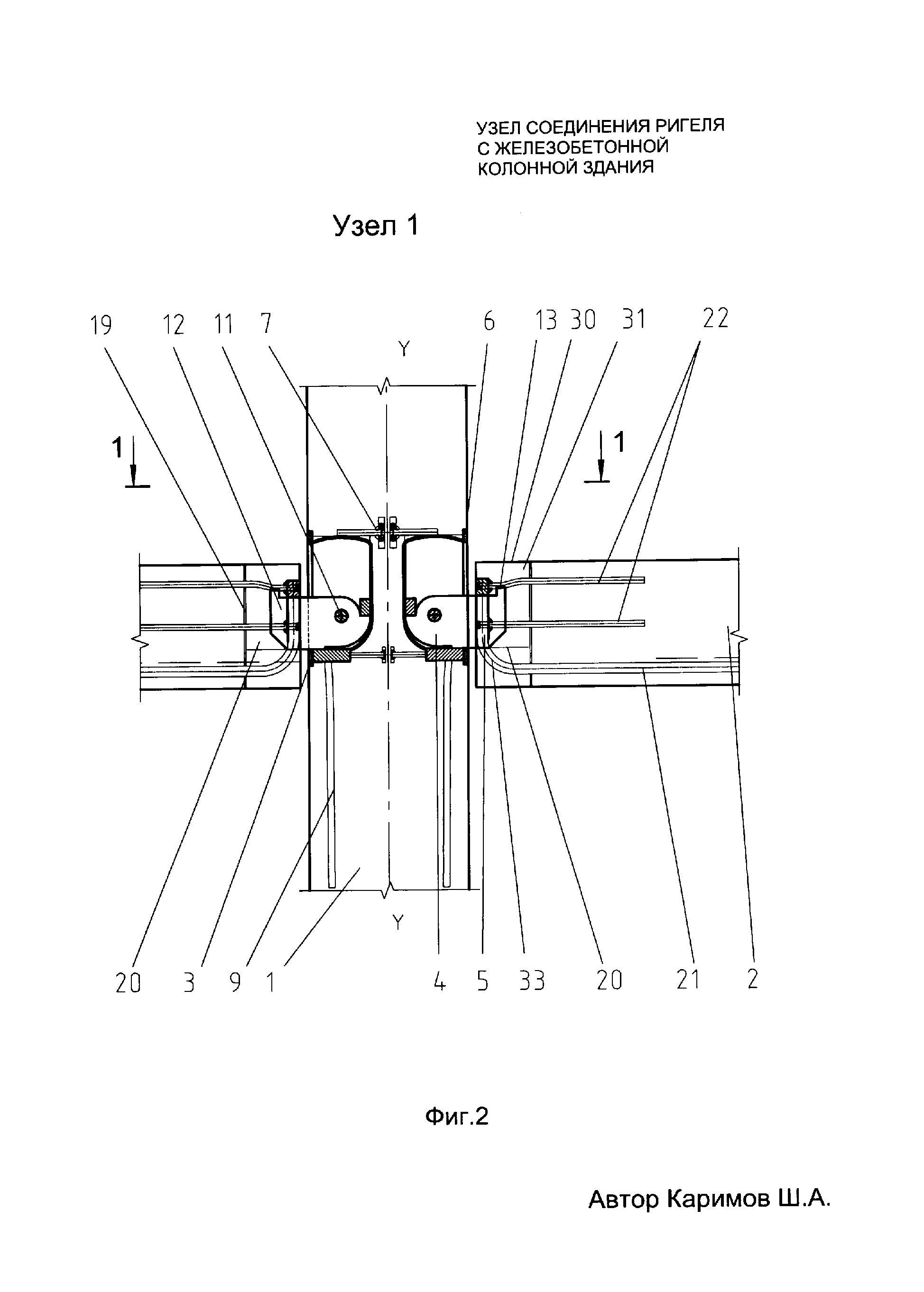 Узел соединения ригеля с железобетонной колонной здания относится к строительству, а именно к узлам соединения элементов каркаса зданий и сооружений. Для повышение прочности, надежности и несущей способности узла соединения ригеля с колонной при одновременном упрощении его конструкции, он включает колонну 1 и ригель 2, комплект закладных деталей 3 в железобетонной колонне 1, опорную консоль 4, и комплект закладных деталей 5 на концевом участке железобетонного ригеля. Комплект закладных деталей 3 состоит из корпуса 6 с опорной консолью 4 и включает верхние 7 и нижние 8 горизонтально отходящие анкера и анкера 9, отходящие вниз вдоль оси колонны и прикрепленные снизу к корпусу 6. Опорная консоль 4, выполнена в виде вертикально установленной пластины на поворотной оси Х-Х в корпусе 6 закладной детали 3, содержащая отверстие 10 для пропуска горизонтальной стяжки 11, выносную опорную часть 12 с монтажным шипом 13 для монтажа железобетонного ригеля 2, выступ 14 в задней части 15 опорной консоли 4, нижнюю опорную часть 16 для упора после разворота. Комплект закладных деталей 5 на концевом участке 17 железобетонного ригеля 2 включает несущую торцевую П-образную пластину 18, ограждающий корпус 19 для образования монтажной щели 20 при формировании ригеля и горизонтально отходящие вдоль оси ригеля основной 21 и дополнительный 22 анкера. Сквозное отверстие, образованное в верхней части монтажной щели 20, имеет прямоугольную форму. Монтажный шип 13 выполнен с возможностью ввода при монтаже паз 23 закладной детали в ригеле 2. Корпус 6 закладной детали колонны 1 включает упор 24 в задней части и опорную пяту 25 для упора после разворота опорной консоли 4 в монтажном положении, горизонтальную стяжку 11, закрепленную в боковых стенах 26 корпуса 6, переднюю пластину 27 в виде рамки прямоугольной формы с отверстием 28 для выпуска выносной опорной части 12 опорной консоли при ее развороте в монтажное положение. Каждая закладная деталь 5 выполнена с образованием монтажной щели 20, направленной вниз и в торец 29 концевого участка ригеля и связана с поворотной опорной консолью 4 с образованием в верхней части 30 сквозного отверстия 31 для фиксаторов, при этом она включает несущую торцевую П-образную пластину 18, а основной анкер 21 закладной детали ригеля выполнен в виде арматурного стержня, в начале жестко прикрепленного к несущей торцевой П-образной пластине 18 по типу крепления внахлестку 32 сверху вниз и далее с отгибом 33 направлен вдоль оси ригеля. Основные анкера 21 размещены симметрично относительно вертикальной оси Z-Z монтажной щели 19 и прикреплены по бокам к несущей торцевой П-образной пластине 18, а каждый дополнительный анкер 22 закладной детали ригеля жестко прикреплен встык в верхней части 34 к несущей торцевой П-образной пластине 18 и направлен вдоль оси ригеля. 1 осн. п-т ф-лы и 9 доп.п-тов ф-лы. 10 ил.