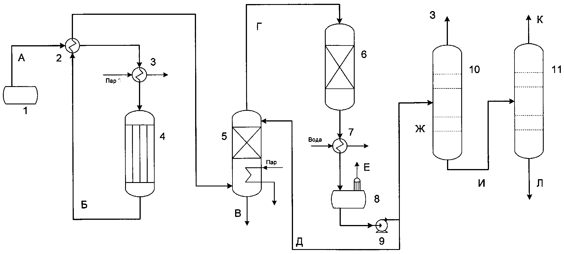 Полезная модель относится к нефтехимической промышленности, в частности касается установок разделения газов пиролиза углеводородного сырья, а именно к блоку разделения и очистки пропан-пропиленовой фракции (ППФ). Известна установка разделения газов пиролиза углеводородного сырья при получении этилена и пропилена фирмы Linde AG, которая включает блок разделения и очистки ППФ, состоящий из реактора гидрирования и ректификационной колонны для разделения пропилена и пропана. (Нефтегазовые технологии. Переработка углеводородов. №5, сентябрь-октябрь 2003, с.85). ППФ из депропанизатора очищают в реакторе гидрирования от метилацетилена и пропадиена (аллена) в реакторе гидрирования и разгоняют в ректификационной колонне, получая с верха колонны пропилен для полимеризации, а из куба колонны - пропан, который возвращают на пиролиз сырья. К недостаткам известного блока разделения и очистки ППФ относится нерациональное использование пропана, полученного на этой установке. В качестве прототипа взята установка разделения газов пиролиза углеводородного сырья, используемая на отечественных промышленных установках ЭП-300 производства этилена, в которой описан блок разделения и очистки ППФ. (Мухина Т.Н., Барабанов Н.Л. и др. Пиролиз углеводородного сырья. М., Химия, 1987, с.142-145). Блок разделения и очистки ППФ, выделенной из продуктов пиролиза углеводородного сырья, состоит из реактора гидрирования и ректификационной колонны для разделения пропилена и пропана. Блок работает аналогично описанному в предыдущем источнике, за исключением того, что на отечественных установках пропан, выделенный из куба ректификационной колонны для разделения пропилена и пропана, либо возвращают в качестве сырья на пиролиз (как описано в схеме фирмы Linde AG), либо чаще его продают как бытовой газ по ГОСТ 20448-90 «Газы углеводородные сжиженные топливные для коммунально-бытового потребления», что является еще более нерациональным. Следует отметить, что для увеличения рентабельности производства, пропан из куба ректификационной колонны для разделения пропилена и пропана целесообразно реализовывать по ГОСТ 27578-87 «Газ углеводородный сжиженный для автомобильного транспорта», однако пропан, полученный по прототипу, не соответствует нормативным физико-химическим показателям, указанным в данном ГОСТе, в частности, пропан содержит «тяжелый остаток» (димеры, тримеры С3), так называемое «зеленое масло», которое образуется в процессе гидрирования метилацетилена и пропадиена в реакторе гидрирования, и которое должно отсутствовать по требованиям указанного ГОСТа. Задачей предлагаемой полезной модели является разработка блока разделения и очистки ППФ пиролиза углеводородного сырья, который позволял бы получать наряду с пропиленом также пропан, который по физико-химическим показателям, в частности по содержанию «тяжелого остатка», соответствовал бы ГОСТ 27578-87 «Газ углеводородный сжиженный для автомобильного транспорта». Поставленная задача решается предлагаемой полезной моделью - блоком разделения и очистки ППФ пиролиза углеводородного сырья, который состоит из реактора гидрирования для очистки от метилацетилена и пропадиена и ректификационной колонны для разделения пропилена и пропана, и отличается тем, что дополнительно включает последовательно расположенные 