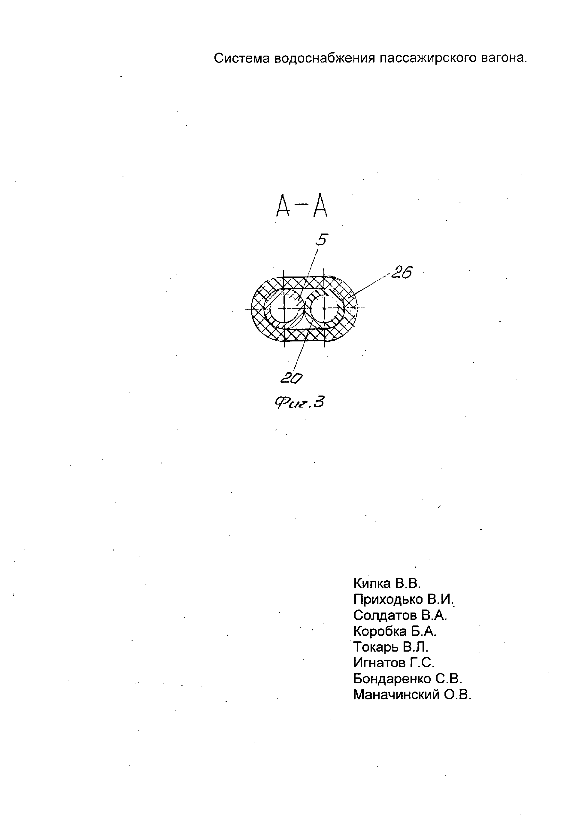 на фиг.2 - поперечное сечение пассажирского вагона с баком и трубопроводами системы отопления и переливным трубопроводом системы водоснабжения;