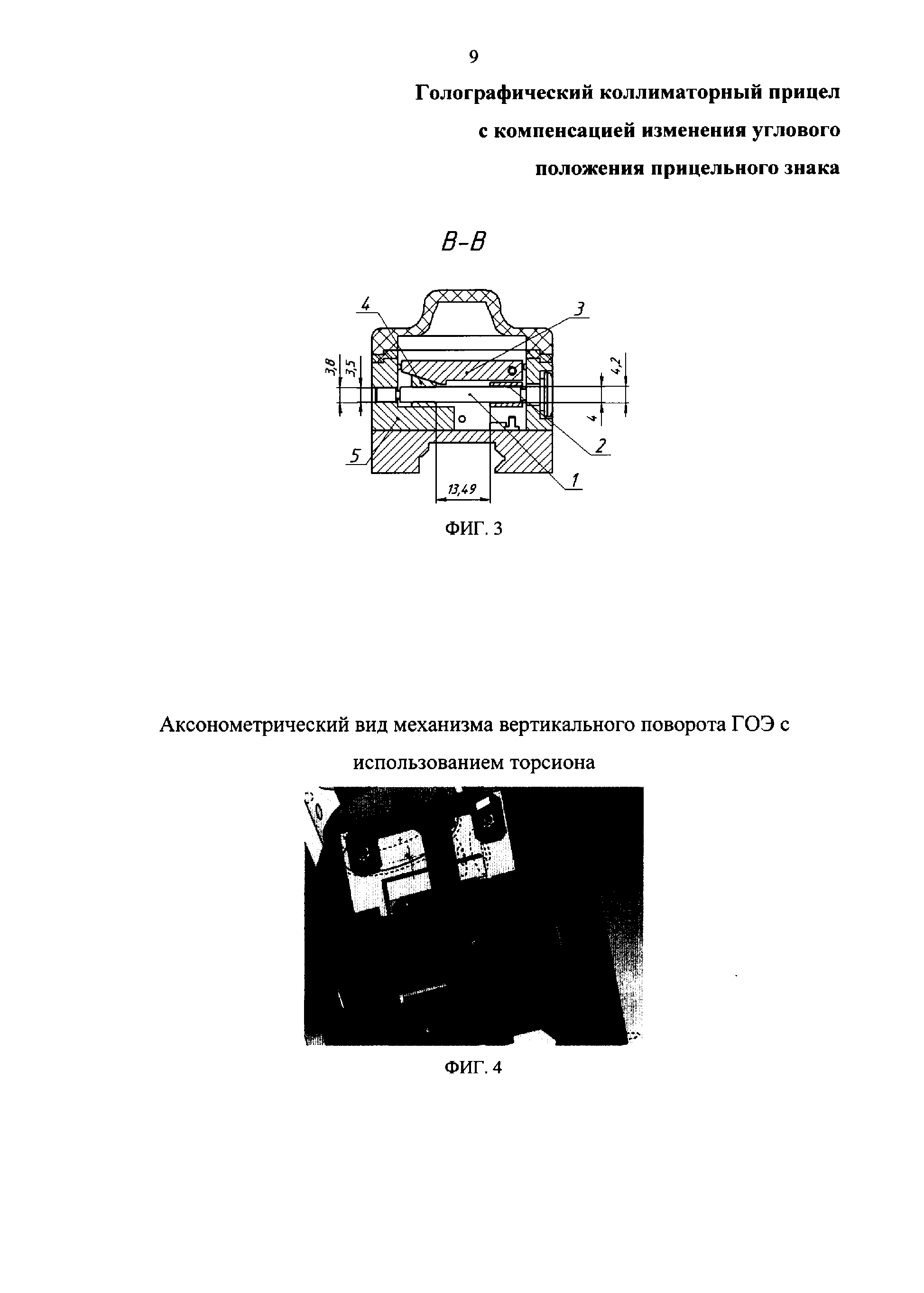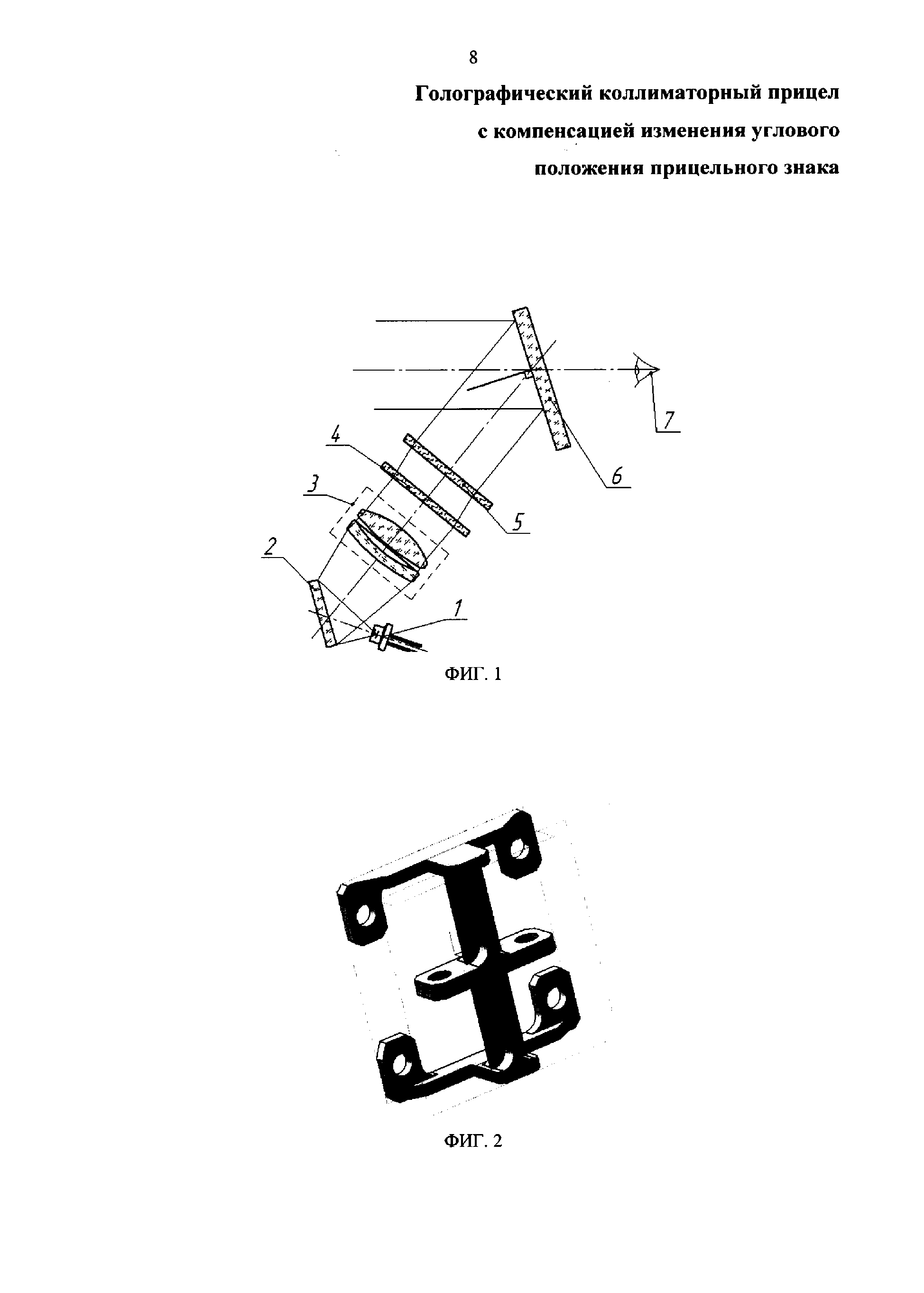 Область техники Техническое решение относится к голографическим коллиматорным прицелам, формирующим мнимое изображение прицельного знака в бесконечности с помощью голограммного оптического элемента (ГОЭ). Уровень техники Обычные коллиматорные прицелы состоят из телескопической оптической системы (телескопической трубы), в фокальной плоскости объектива которой установлена прицельная марка, изображение которой в свою очередь рассматривается глазом стрелка через окуляр. В процессе прицеливания глаз стрелка вплотную устанавливается к окуляру телескопической трубы, и изображение цели рассматривается через трубу, имеющую соответствующее увеличение. Увеличение коллиматорного прицела такое, что поле зрения, в котором наблюдаются цель и изображение прицельного знака-метки, мало (несколько градусов). Это приводит к тому, что значительное влияние на процесс прицеливания оказывают вибрации рук и оружия, воздушные колебания и поэтому положение стрелка в процессе прицеливания должно быть строго статическое и невозможно обеспечить прицеливание в «динамике». Голографический коллиматорный прицел обеспечивает процесс прицеливания в «динамике». Глаз стрелка не надо устанавливать вплотную к прицелу, а можно смотреть через него на любом расстоянии, как в «окно», и видеть прицельный знак в бесконечности, что для динамической стрельбы очень важно. Таким образом, реализуется значительное преимущество голографического коллиматорного прицела - легкость процесса прицеливания. В патенте РФ №2034321 от 30.04.95 г., [1] описано устройство голографического коллиматорного прицела, содержащего голограмму, при подсветке которой лазерным излучением в бесконечности восстанавливается прицельная марка. Отличительная особенность данного прицела состоит в том, что. Недостатком данной системы является то, что голограмма является отражательной и синтезированной из оптически прозрачных слоев с разными показателями преломления и подсветка голограммы осуществляется под малым углом (менее 10°) в направлении цели, в результате чего часть излучения проходит через голограмму и демаскирует стрелка. В патенте US No 5,483,362 of Jan. 09, 1996, [2] представлена схема голографического коллиматорного прицела, в котором все элементы установлены в отдельных креплениях на общем основании. Схема содержит лазерный источник, излучение от которого после прохождения через линзу и ахроматизатор, освещает голограмму, с которой восстанавливается прицельная метка. Линза формирует параллельный пучок, а ахроматизатор обеспечивает постоянство положения прицельного знака при изменении длины волны вследствие температурных воздействий. Также в прицеле предусмотрены регулировка яркости, и юстировка для выверки положения прицельного знака. Прицел может также за счет наклонного пучка или дополнительных оптических элементов превращать эллиптический пучок, испускаемый лазерным диодом, в пучок круглого сечения для обеспечения равномерной засветки голограммы. Кроме того, для компактификации схемы предложено применять различные оптические схемы, содержащие призмы. При этом можно изменять угол падения излучения на голограмму (а, следовательно, и схему получения голограммы) для достижения того, чтобы нулевой порядок составлял больший угол с первым (рабочим) порядком. Однако, пр