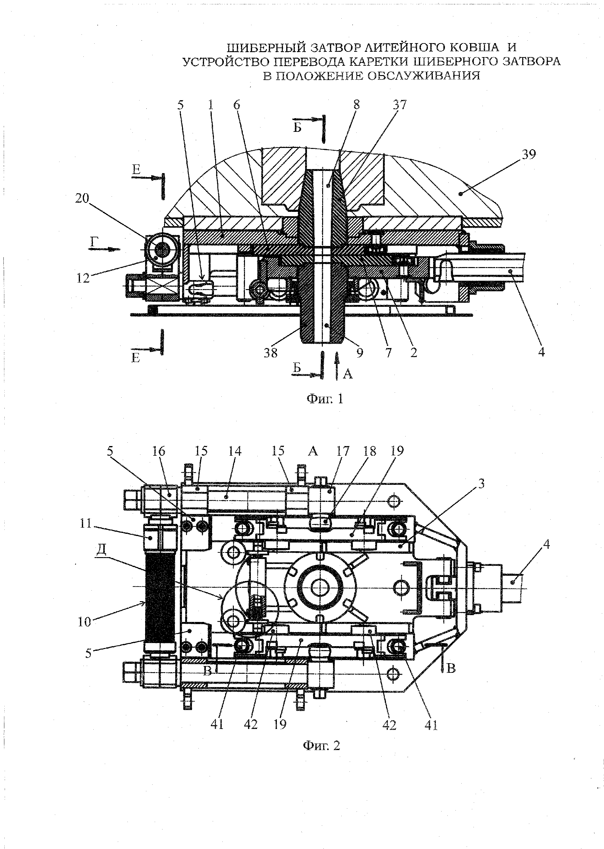 1. Шиберный затвор литейного ковша, содержащий монтажную раму, каретку, снабженную направляющими, параллельными продольной оси затвора, с механизмом ее перемещения и устройством перевода в положение обслуживания, неподвижную и подвижную огнеупорные плиты с рабочими отверстиями, размещенные соответственно в монтажной раме и каретке и поджатые одна к другой, пружинный блок с механизмом регулировки усилия сжатия пружин, два двуплечих рычага первого рода, расположенных по обе стороны от продольной оси затвора и оси поворота которых выполнены в виде валов, установленных в опорах вращения на монтажной раме параллельно по обе стороны от продольной оси затвора, с разнесенными по краям плечами, причем первые плечи отжаты друг от друга пружинным блоком, а на вторых плечах размещены опорные элементы, установленные на валах по обе стороны от оси отверстия неподвижной огнеупорной плиты симметрично продольной оси затвора и взаимодействующие с подвижной огнеупорной плитой, отличающийся тем, что опорные элементы двуплечих рычагов взаимодействуют с подвижной огнеупорной плитой посредством балансиров, установленных на монтажной раме с возможностью качания в плоскостях перпендикулярных плоскости разъема огнеупорных плит, и поступательного перемещения вдоль оси рабочего отверстия неподвижной огнеупорной плиты, при этом пружинный блок включает направляющий вал с набором тарельчатых пружин и два, взаимодействующих с крайними пружинами набора концевых элемента, которые связаны шарнирно с первыми плечами двуплечих рычагов, один из концевых элементов выполнен в виде втулки с отверстием, внутри которого с возможностью продольного перемещения размещена часть направляющего вала, и наружной резьбой, на которую навернута регулировочная гайка, при этом одна из крайних пружин набора контактирует с концевым элементом через регулировочную гайку. 2. Устройство перевода каретки шиберного затвора в положение обслуживания, включающее ее шарнирное соединение с монтажной рамой, причем монтажная рама и каретка оснащены, соответственно, неподвижной и подвижной огнеупорными плитами, контактирующими по плоскости с возможностью относительного смещения вдоль оси затвора, отличающееся тем, что шарнирное соединение выполнено в виде двух цапф на каретке и ответных гнезд на монтажной раме, при этом гнезда включают направляющие пазы, расположенные вдоль оси затвора, по меньшей мере, часть поперечных сечений которых имеет переменный профиль и ширину меньшую диметров цапф, а цапфы включают лыски, выполненные параллельно плоскости контакта огнеупорных плит и расположенные с возможностью их прохода вдоль профиля пазов до контакта с гнездами. 3. Устройство по п.2, отличающееся тем, что гнезда под цапфы включают упорные поверхности, расположенные со стороны продольной оси затвора перпендикулярно плоскости контакта огнеупорных плит, а цапфы выполнены сборными, установлены на каретке с возможностью относительного смещения и фиксации вдоль своей оси и снабжены упорными фланцами, выполненными с возможностью контактирования с, по меньшей мере, одной из упорных поверхностей гнезд.