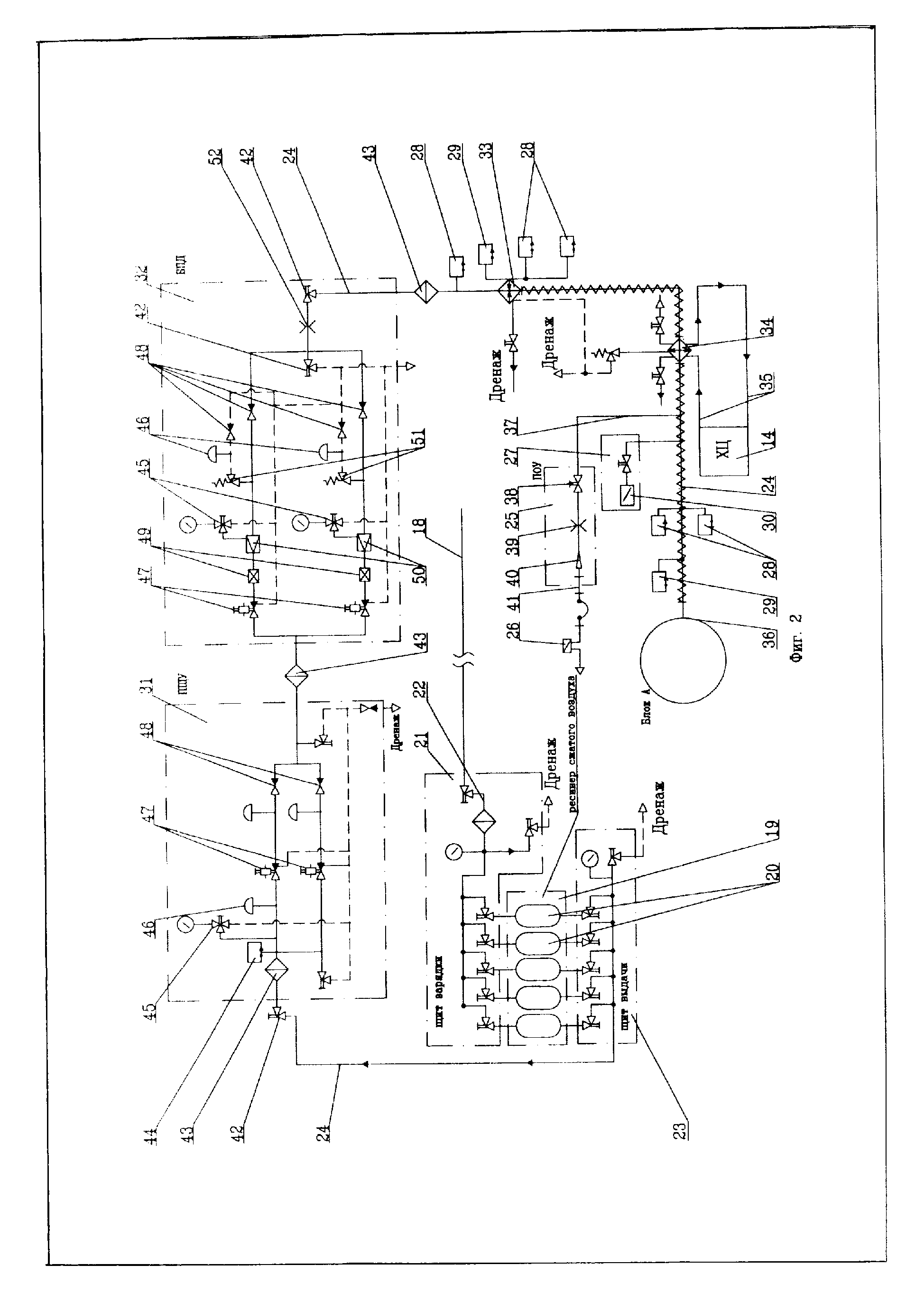 1. Наземный стартовый комплекс для предстартовой подготовки и пуска ракеты-носителя с космической головной частью, содержащий транспортно-установочный агрегат, стартовое сооружение, односкатный газоотражатель с газоотводным каналом, стартовую систему, кабель-заправочную мачту, верхнюю кабель-мачту, нижние кабель-мачты, башню обслуживания, кабину обслуживания, системы заправки окислителем и горючим, систему охлаждения горючего, оборудование хранилища газов, холодильный центр, систему термостатирования воздухом низкого давления, общетехнические системы и вспомогательное оборудование, отличающийся тем, что он дополнительно снабжен системой термостатирования воздухом высокого давления космической головной части с разгонным блоком и космическим аппаратом, которая включает в себя связанные с оборудованием хранилища газов магистральный трубопровод и ресивер сжатого воздуха, баллоны которого через щит зарядки и трубопровод с арматурой соединены с магистральным трубопроводом, а щит выдачи ресивера сжатого воздуха соединен с трубопроводом подачи воздуха в космическую головную часть, снабженным пробоотборным устройством, соединенным со счетчиком аэрозольных частиц, пневмощитом контроля кондиционности сжатого воздуха, средствами дистанционного контроля параметров температуры и давления воздуха, а также штатным гигрометром для контроля влажности воздуха, подаваемого в космическую головную часть, который через пневмощит управления, блок понижения давления, нагреватель газов и охладитель воздуха, установленный в кольцевом контуре охлаждения холодильного центра, соединен с разъемным соединением бл�