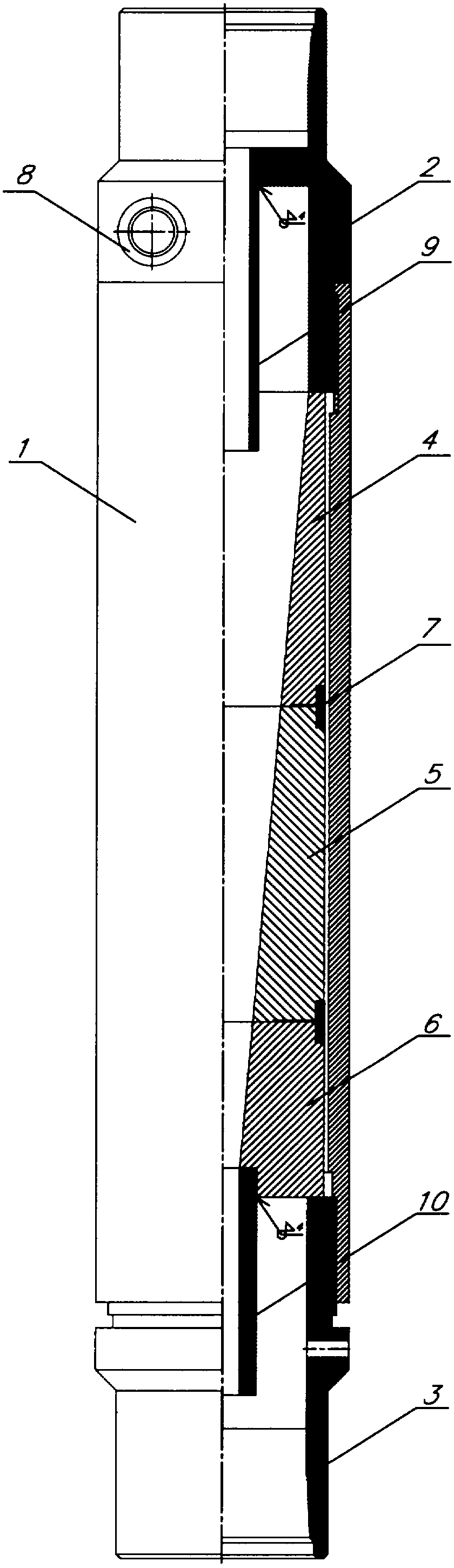 Гидроциклон выполнен разборным и содержит корпус 1 (фиг.1, 2), цилиндрическая часть которого соединена посредством резьбы с верхним 2 и нижним 3 переводниками, между которыми последовательно размещены, постепенно сужаясь книзу, три конические секции 4, 5, 6, соединенные между собой центрирующими кольцами 7, тангенциально встроенный входной патрубок 8, осевой сливной патрубок 9 для жидкой фазы и разгрузочный патрубок 10 для твердых частиц (шлама), которые скапливаются в специальном контейнере (не показан), состоящим из нескольких (2-5) насосно-компрессорных труб (НКТ).
