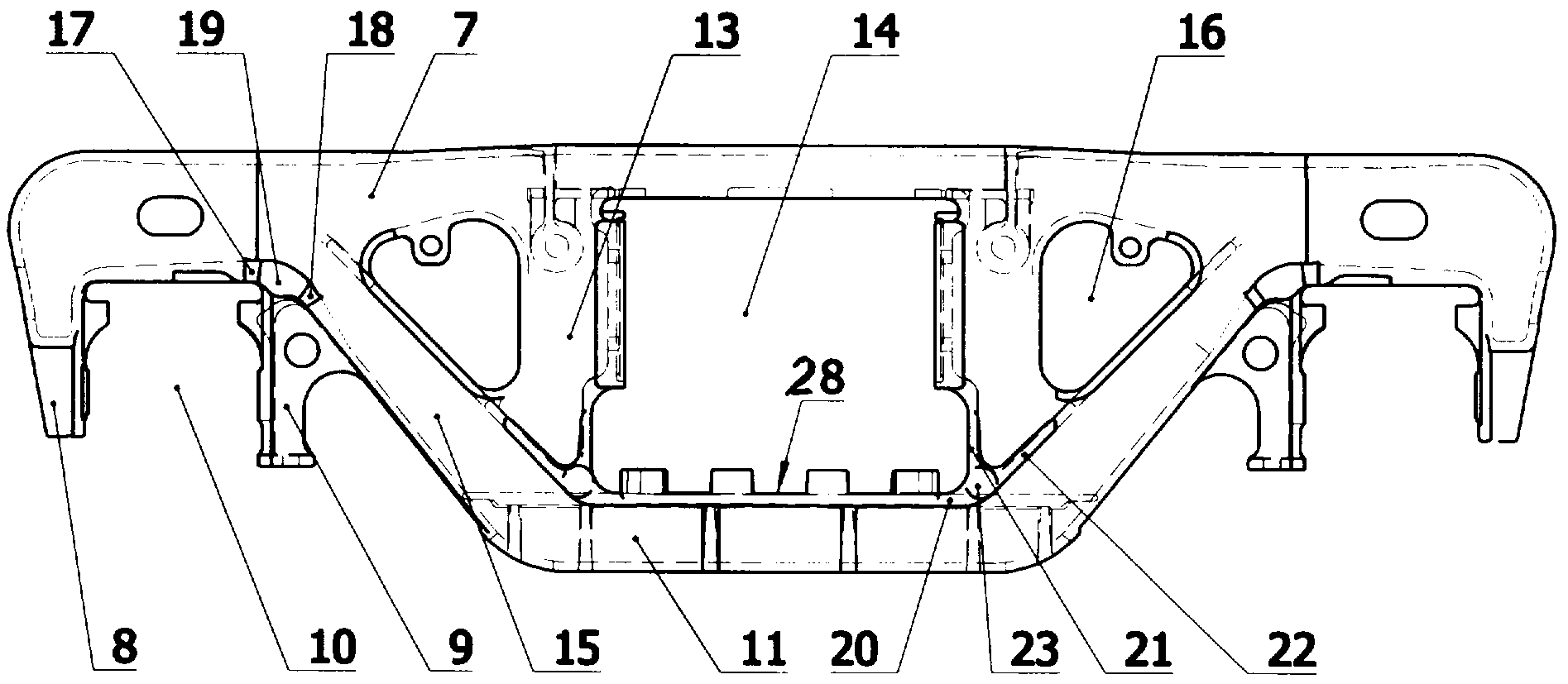 Полезная модель относится к железнодорожному транспорту и касается трехэлементных тележек грузовых вагонов. В грузовом железнодорожном транспорте в качестве ходовых частей вагонов широкое распространение получили трехэлементные тележки с одно или двухступенчатым рессорным подвешиванием, в которых используются рамы боковые литой конструкции. К таким конструкциям относятся, например, тележки Motion Control M-976 Truck System (США), QCZ56 (Китай), ICF i MD45/52 (Германия), 18-100, 18-131, 18-578, 18-579, 18-194-1 (Россия) и 18-4129, 18-4129-01, 18-7020, 18-7033, 18-755, 18-781, 18-1711 (Украина) и др. Начиная с боковых рам тележек УВЗ [1], ЦНИИ-Х3-0 [2] и их модификаций [3, 4, 5, 6 и 7] и заканчивая последними разработками [8 и 9], отличительной особенностью рам боковых является выполнение их в виде одной стальной отливки, в средней части которой расположен проем для центрального рессорного комплекта, а по концам - проемы (открытые или закрытые с боковых сторон) для буксовых узлов колесных пар. Вертикальные колонны центрального рессорного проема, наклонные пояса и верхний пояс образуют симметрично расположенные относительно поперечной оси рамы технологические отверстия треугольной формы со скругленными углами. Эти отверстия обеспечивают возможность осмотра тормозных колодок и снятие чеки, крепящей тормозные колодки к башмакам триангеля, замене тормозных колодок во время эксплуатации тележек. Верхний пояс в районе проема для центрального рессорного комплекта имеет замкнутое овалоподобное сечение с локальными отверстиями по нижней грани. В районе технологического отверстия он имеет корытообразную форму с некоторым загибом внутрь концов полок, а на участке буксовых проемов - прямоугольное замкнутое сечение. Сечение вертикальных колонн проема для центрального рессорного комплекта боковых рам имеют корытообразную форму с некоторым загибом внутрь концов полок на участке технологического отверстия. Наклонные пояса имеют коробчатое сечение от нижнего угла проема для центрального рессорного комплекта до начала технологического отверстия, а далее - корытообразную форму с некоторым загибом внутрь концов полок на участке технологического отверстия. Горизонтальный участок нижнего пояса проема для центрального рессорного комплекта имеет замкнутое коробчатое сечение. По бокам к нему примыкают полки, создающие опорную поверхность для установки пружин центрального рессорного комплекта и, со стороны кронштейнов для подвески триангелей, являющиеся опорами для наконечников три-ангелей в случае обрыва подвесок. Балки с таким профилем опорной поверхности для установки центрального рессорного комплекта хорошо сопротивляются изгибу и кручению. Однако недостаточную прочность имеет внутренний угол буксового проема [12], не смотря на то, что он усилен прямоугольной формы ребром, расположенным по касательной к радиусу сопряжения наклонного пояса с верхним горизонтальным поясом. Конструкция узла перехода нижнего пояса в вертикальные колонны проема для центрального рессорного подвешивания, несмотря на наличие внутреннего наклонного ребра, являющегося продолжением верхней полки нижнего пояса и соединяющего боковые стенки колонок, имеет так же недостаточную прочность. Как правило, попытки усиления этих зон сводится к увеличению толщин сопрягаемых элементов, при этом получается большое скопление ме