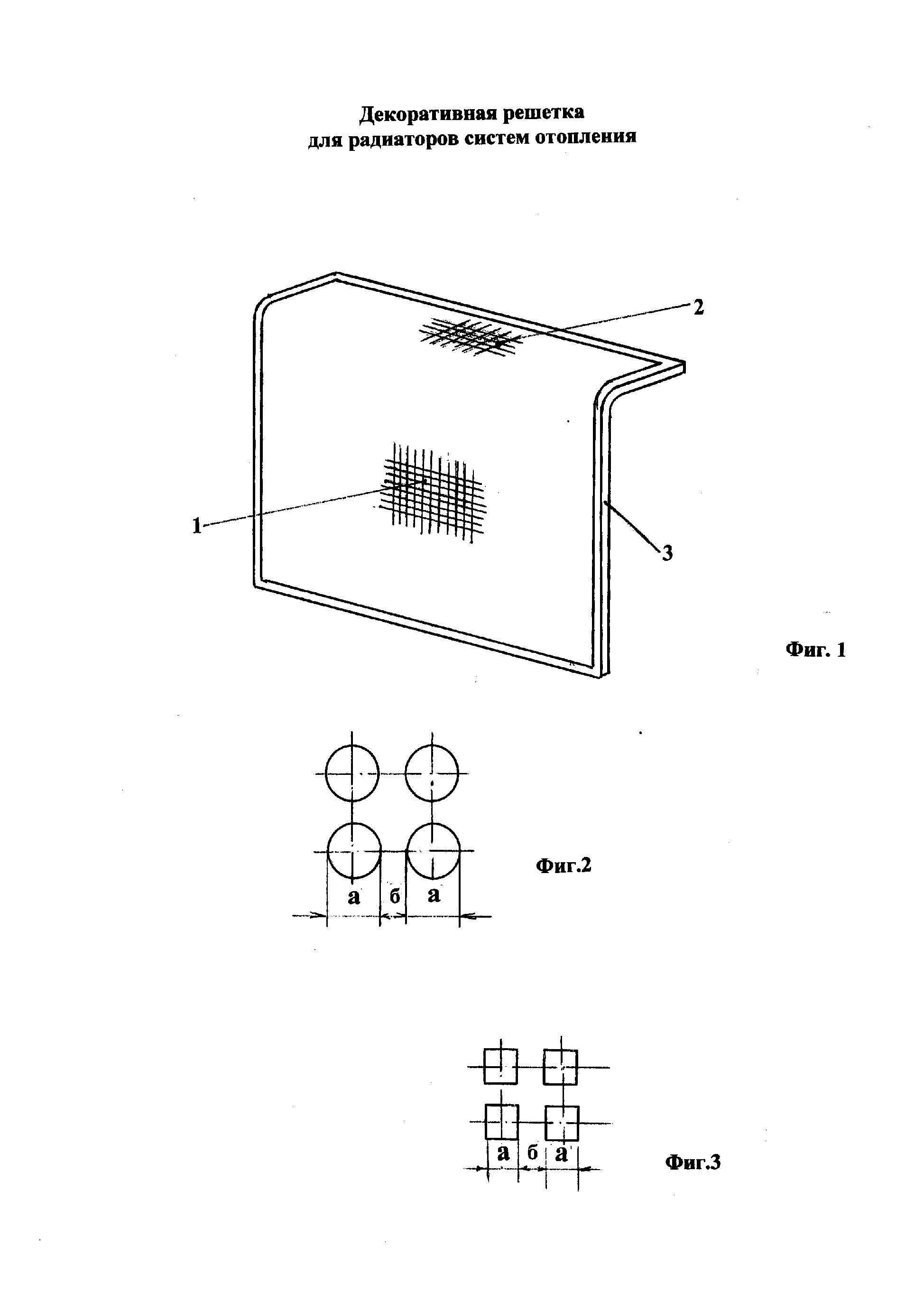 Полезная модель относится к области теплотехники, а именно, к декоративной решетке для радиаторов систем отопления, и может быть использовано при создании средств декоративного украшения или защиты радиаторов систем водяного отопления жилых, производственных и культурно-бытовых помещений различного назначения. Задача полезной модели - создание декоративной решетке для радиаторов систем отопления, техническим результатом при использовании которой является высокая технологичность изготовления, сборки, монтажа и демонтажа декоративной решетки, обеспечение заданного уровня теплоизлучения и конвекции тепловой мощности от поверхности радиатора системы отопления в окружающий воздух обогреваемого помещения, а также высокие экологические свойства и эстетический вид решетки. Для решения задачи предложена декоративная решетка для радиаторов систем отопления, содержащая фронтальную металлическую декоративную пластину, обращенную к обогреваемому помещению и верхнюю металлическую декоративную пластину, выполненные под прямым углом друг к другу с возможностью размещения экрана своей верхней пластиной на верхней части радиатора, при этом фронтальная и верхняя металлические декоративные пластины выполнены перфорированными из металлического листа толщиной от 0,5 до 2,0 мм из углеродистой стали, нержавеющей стали или алюминиевого сплава, при этом перфорация фронтальной и верхней пластин решетки выполнена с использованием отверстий круглой, овальной, эллиптической, квадратной, прямоугольной, ромбовидной или звездообразной формы, а также в форме крестообразного цветка с расстоянием между внутренними стенками перфорационных отверстий от 3 до 8 мм и перемычкой между перфорационными отверстиями от 2 до 6 мм, фронтальная и верхняя металлические декоративные пластины обрамлены по своим краям выполненным из металла уголком, закрепленным сваркой по всему периметру фронтальной и верхней пластины, переход фронтальной пластины в верхнюю пластину дополнительно выполнен скругленным с радиусом изгиба от 10 до 65 мм, соотношение ширины верхней пластины декоративной решетки к высоте ее фронтальной пластины выбрано в зависимости от высоты радиатора системы отопления в пределах 1:(1,00 - 6,5). При этом на фронтальной пластине декоративной решетки дополнительно вставлена обрамленная уголком декоративная перфорированная решетка квадратной, прямоугольной или ромбической формы. При этом решетка выполнена составной из двух или трех отдельных решеток в зависимости от длины радиатора системы отопления. При этом решетка дополнительно оснащена левой и/или правой боковыми перфорированными и/или сплошными металлическим пластинами. При этом решетка дополнительно оснащена средствами ее крепления на несущей поверхности любым известным способом. При этом в качестве углеродистой стали металлического листа решетки используют холоднокатаную сталь марки 08пс. При этом в качестве нержавеющей стали металлического листа решетки используют сталь марки 08Х18Н10. При этом в качестве алюминиевого сплава металлического листа решетки используют сплав марки Д16Т. При этом на поверхности решетки нанесены известные декоративно-защитные покрытия, например полиэфирная краска любой цветовой гаммы.