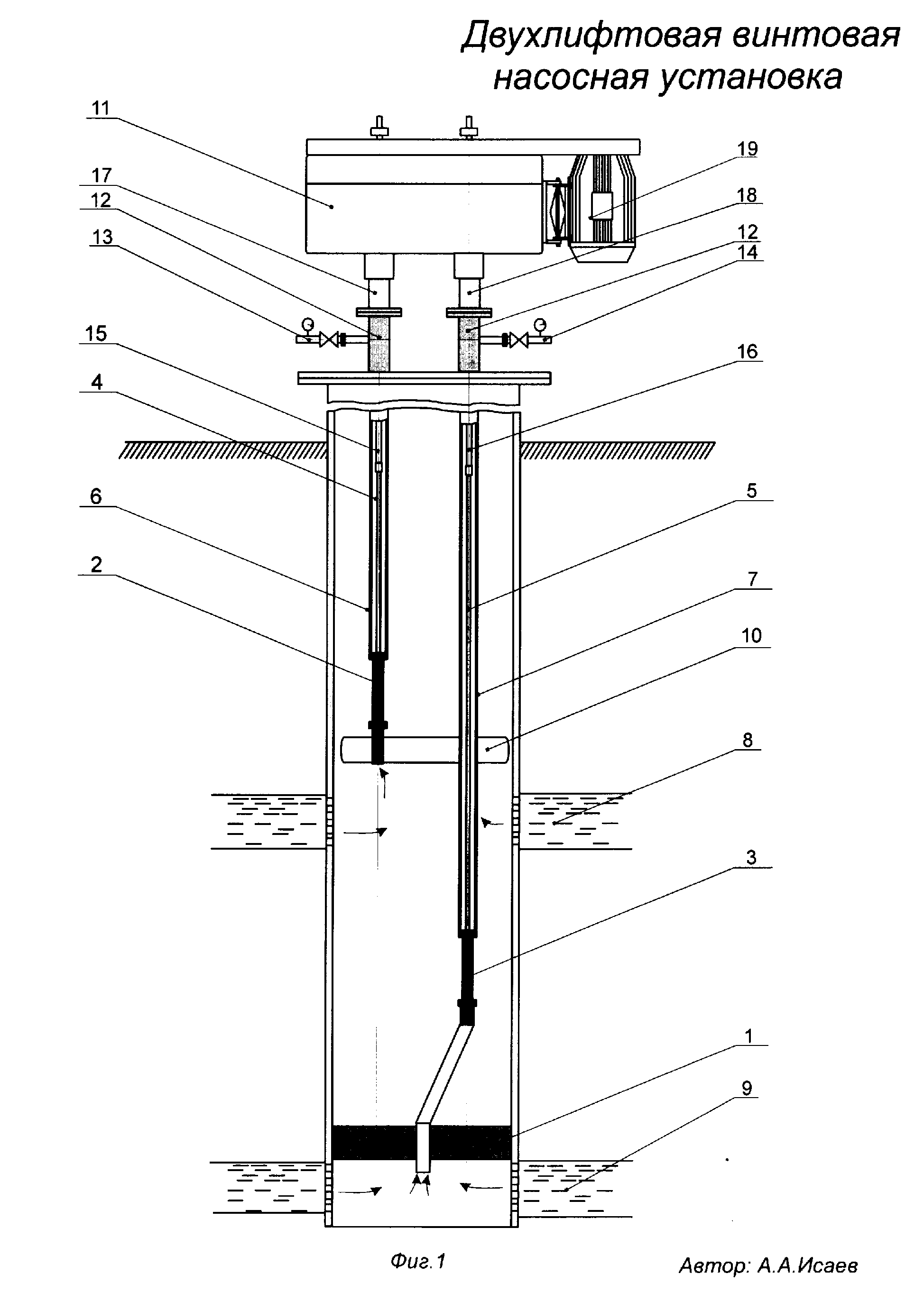 Двухлифтовая винтовая насосная установка, содержащая привод, два насоса, две подвески колонн насосных штанг, две колонны насосно-компрессорных труб различной длины, параллельный двухканальный якорь, двухканальную устьевую арматуру и пакер для разобщения продуктивных пластов, отличающаяся тем, что в качестве привода для вращения двух колонн насосных штанг использована приводная головка, связанная с помощью ременной или зубчатой передачи с электродвигателем или газовым двигателем, при этом в качестве насосов использованы винтовые штанговые насосы.
