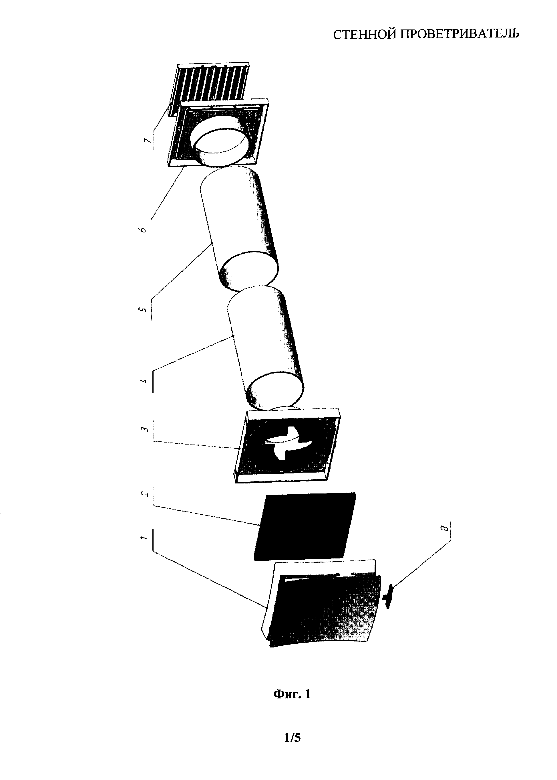 1. Стенной проветриватель, состоящий из внутренней части, в которую входят: внутренняя крышка - 1, фильтр - 2, регулировочный клапан - 3, внутренняя труба - 4 и внешняя труба - 5, внешняя крышка проветривателя - 6, внешняя решетка - 7 и элемент управления - 8, отличающийся тем, что внутренняя крышка 1 представляет собой диффузор с разной геометрией вентиляционной щели, регулировочный клапан 3 выполнен в виде выдвижных пластин, которые синхронно выдвигаются к центру отверстия и количество пластин составляет от 4 до 24, которые контролируются при помощи элемента управления 8, а труба 4 вместе с трубой 5 образовывает «телескопическую трубу». 2. Стенной проветриватель по п.1, отличающийся тем, что во внутренней крышке 1 ширина щели сверху больше, чем снизу. 3. Стенной проветриватель по п.1, отличающийся тем, что количество пластин регулирующего клапана 3 составляет от 4 до 12. 4. Стенной проветриватель по п.3, отличающийся тем, что количество пластин регулирующего клапана 3 составляет 4. 5. Стенной проветриватель по п.1, отличающийся тем, что элемент управления 8 выполнен в виде ползунка, который входит в сцепление с элементом синхронизации выдвижных пластин клапана 3. 6. Стенной проветриватель по п.1, отличающийся тем, что элемент управления 8 выполнен в виде рычага, который непосредственно присоединен к элементу синхронизации выдвижных пластин клапана 3. 7. Стенной проветриватель по п.1, отличающийся тем, что элемент управления 8 выполнен в виде ползунка, соединенного с пластиной, которая выполнена из биметалла, и ползунок входит в сцепление с элементом синхронизации выдвижных пластин клапана 3. 8. Стенной проветриватель по п.1, отличающийся тем, что внешнюю решетку 7 оборудовано ламелями, которые изменяют угол наклона. 9. Стенной проветриватель по п.1, отличающийся тем, что внешняя крышка проветривателя 6 и внешняя решетка 7 представляют собой единую конструкцию. 10. Стенной проветриватель по п.8, отличающийся тем, что между внешней крышкой 6 и внешней решеткой 7 дополнительно устанавливается москитная сетка. 11. Стенной проветриватель по п.1, отличающийся тем, что в качестве внешней крышки проветривателя 6 используют обычную вентиляционную решетку. 12. Стенной проветриватель по п.1, отличающийся тем, что представляет собой набор, состоящий из упаковки, внутренней крышки проветривателя 1, фильтра 2, регулировочного клапана 3, внутренней трубы 4, внешней трубы 5, внешней крышки проветривателя 6, внешней решетки 7, элемента управления 8 и инструкции. 13. Стенной проветриватель по п.12, отличающийся тем, что набор дополнительно состоит из москитной сетки. 14. Стенной проветриватель по п.12, отличающийся тем, что набор дополнительно состоит из активного фильтровального материала. 15. Стенной проветриватель по п.1, отличающийся тем, что представляет собой набор, который состоит из упаковки, внутренней крышки проветривателя 1, фильтра 2, регулировочного клапана 3 и инструкции.