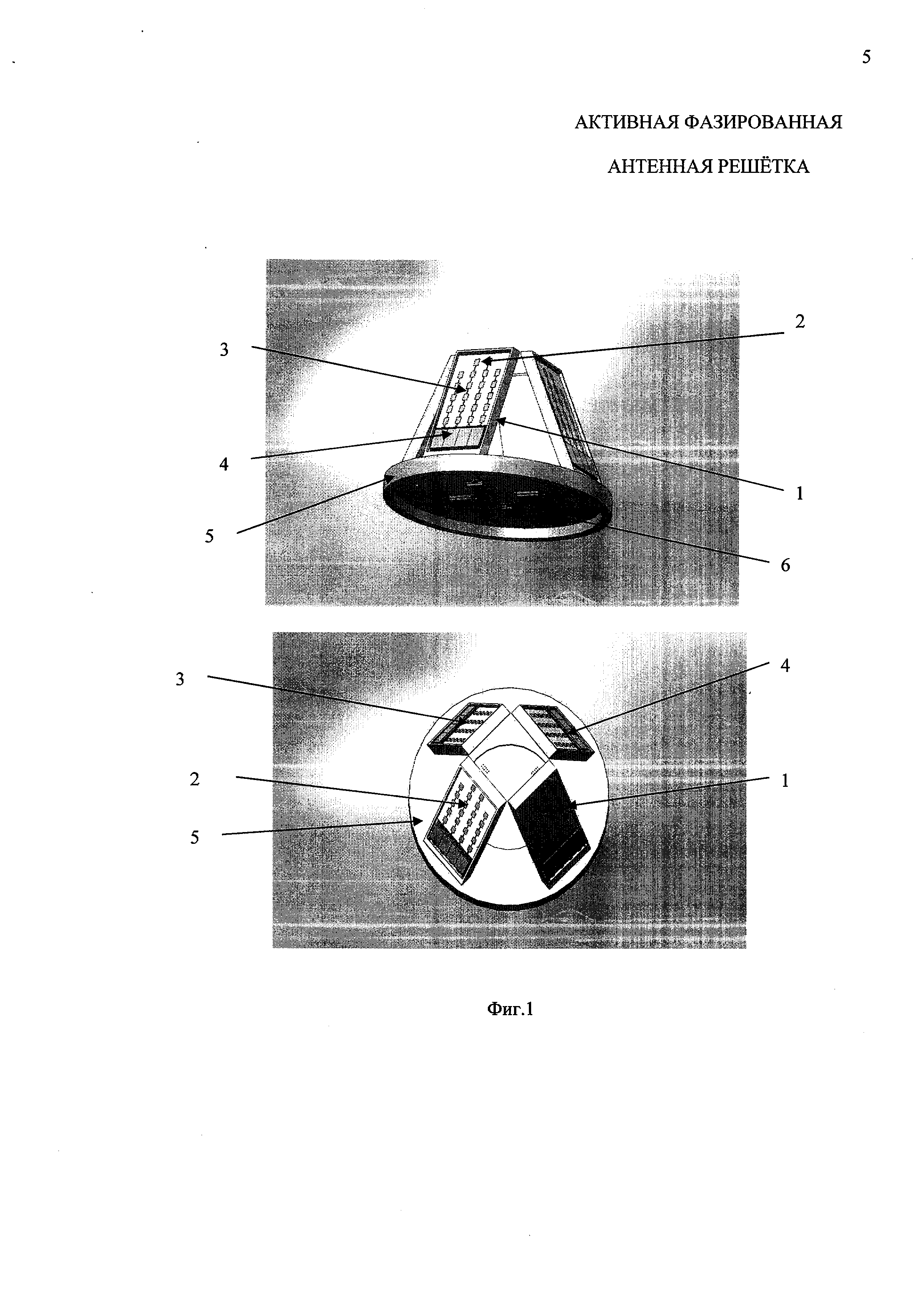 1. Активная фазированная антенная решетка, содержащая, по крайней мере, одну плоскую активную фазированную антенную решетку из печатных антенных излучателей, полосковых линий передачи, из устройства формирования, содержащего активные элементы, линии питания и управления, аттенюаторы, фазовращатели, элементы схемы суммирования, элементы схемы управления, отличающаяся тем, что она выполнена в виде усеченной пирамиды, на боковых гранях которой размещены плоские активные фазированные антенные решетки из печатных антенных излучателей, полосковых линий передачи, из устройства формирования, при этом на внешней стороне основания усеченной пирамиды расположены входы для подключения каждой плоской активной фазированной антенной решетки к приемному и/или передающему устройству. 2. Активная фазированная антенная решетка по п.1, отличающаяся тем, что антенные излучатели выполнены в виде печатных излучателей прямоугольной формы. 3. Активная фазированная антенная решетка по п.1, отличающаяся тем, что апертура плоской активной фазированной антенной решетки выполнена в виде ряда параллельных линейных антенных решеток из активных печатных излучателей, расположенных между собой на заданном расстоянии и соединенных между собой последовательно посредством полосковых линий, а линейные антенные решетки соединены с устройством формирования. 4. Активная фазированная антенная решетка по п.1, отличающаяся тем, что активные элементы выполнены в виде передающих усилителей мощности и/или приемных малошумящих усилителей. 5. Активная фазированная антенная решетка по п.1, отличающаяся тем, что она выполнена в виде двух активных фазированных антенных решеток, которые конструктивно объединены между собой со стороны основания усеченной пирамиды.