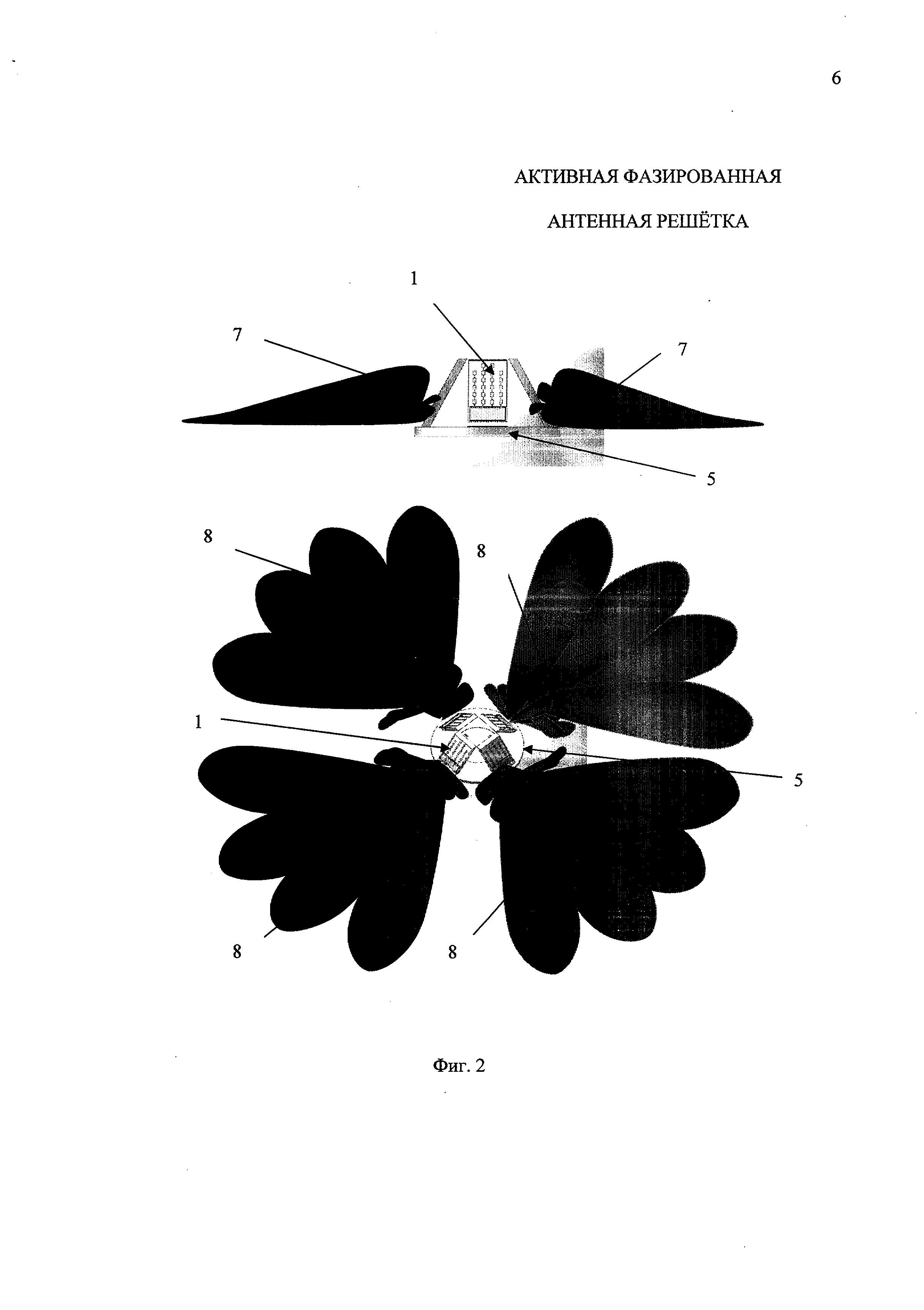 Техническое решение (полезная модель) относится к радиотехнике, в частности к конструированию активных фазированных антенных решеток (АФАР). Известна фазированная антенная решетка, содержащая печатные антенные излучатели, полосковые и микрополосковые линии передачи, линии питания и управления [1]. Недостатком данной фазированной антенной решетки является ее низкая эффективность, обусловленная ограниченными функциональными возможностями. Наиболее близким техническим решением к заявленному является активная фазированная антенная решетка, содержащая плоскую активную фазированную антенную решетку из печатных антенных излучателей, полосковых линий передачи, из устройства формирования, содержащего активные элементы, линии питания и управления, аттенюаторы, фазовращатели, элементы схемы суммирования, элементы схемы управления. [2]. Недостатком данной фазированной антенной решетки является ее низкая эффективность, обусловленная ограниченными функциональными возможностями. В основу заявленного технического решения положена задача создания такой активной фазированной антенной решетки, которая обеспечит большую эффективность за счет более широких функциональных возможностей. Сущность заявленного технического решения заключается в том, что активная фазированная антенная решетка, содержащая, по крайней мере, одну плоскую активную фазированную антенную решетку из печатных антенных излучателей, полосковых линий передачи, из устройства формирования, содержащего активные элементы, линии питания и управления, аттенюаторы, фазовращатели, элементы схемы суммирования, элементы схемы управления, выполнена в виде усеченной пирамиды, на боковых гранях которой размещены плоские активные фазированные антенные решетки из печатных антенных излучателей, полосковых линий передачи, из устройства формирования, при этом на внешней стороне основания усеченной пирамиды расположены входы для подключения каждой плоской активной фазированной антенной решетки к приемному и, или передающему устройству. На фиг.1 изображена АФАР, общие виды; на фиг.2 - расчетная диаграмма направленности (ДН) АФАР в полусфере, в угломестной и азимутальной плоскости. Активная фазированная антенная решетка содержит плоские активные фазированные антенные решетки 1, печатные излучатели 2, полосковые линии передачи 3, устройства формирования 4, основание 5 усеченной пирамиды, входы 6, ДН в угломестной плоскости 7, ДН в азимутальной плоскости 8. ПРИМЕР КОНКРЕТНОГО ВЫПОЛНЕНИЯ Активная фазированная антенная решетка, содержащая, по крайней мере, одну плоскую активную фазированную антенную решетку 1 из печатных антенных излучателей 2, полосковых линий передачи 3, из устройства формирования 4, содержащего (на рисунке не показаны) активные элементы, линии питания и управления, аттенюаторы, фазовращатели, элементы схемы суммирования, элементы схемы управления, выполнена в виде усеченной пирамиды 5, на боковых гранях которой размещены плоские активные фазированные антенные решетки 1 из печатных антенных излучателей 2, полосковых линий передачи 3, из устройства формирования 4, при этом на внешней стороне основания 5 усеченной пирамиды расположены входы 6 для подключения каждой плоской активной фазированной антенной решетки 1 к приемному и, или передающему устройс