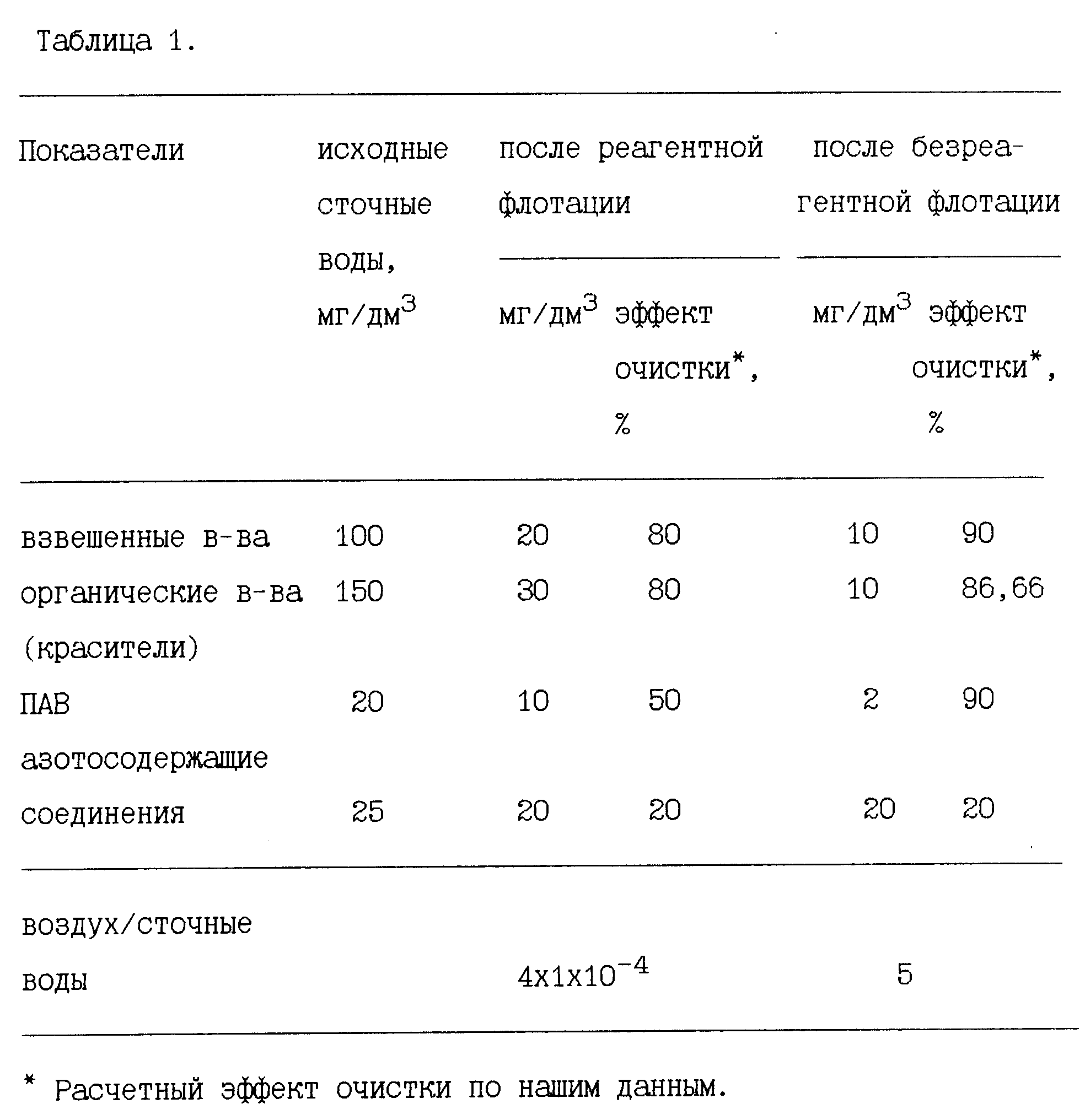 и последующая флотация с соотношением воздух/сточные воды в диапазоне от 3 до 10. Данные по очистке стоков известным способом приведены в табл 1. Известный способ