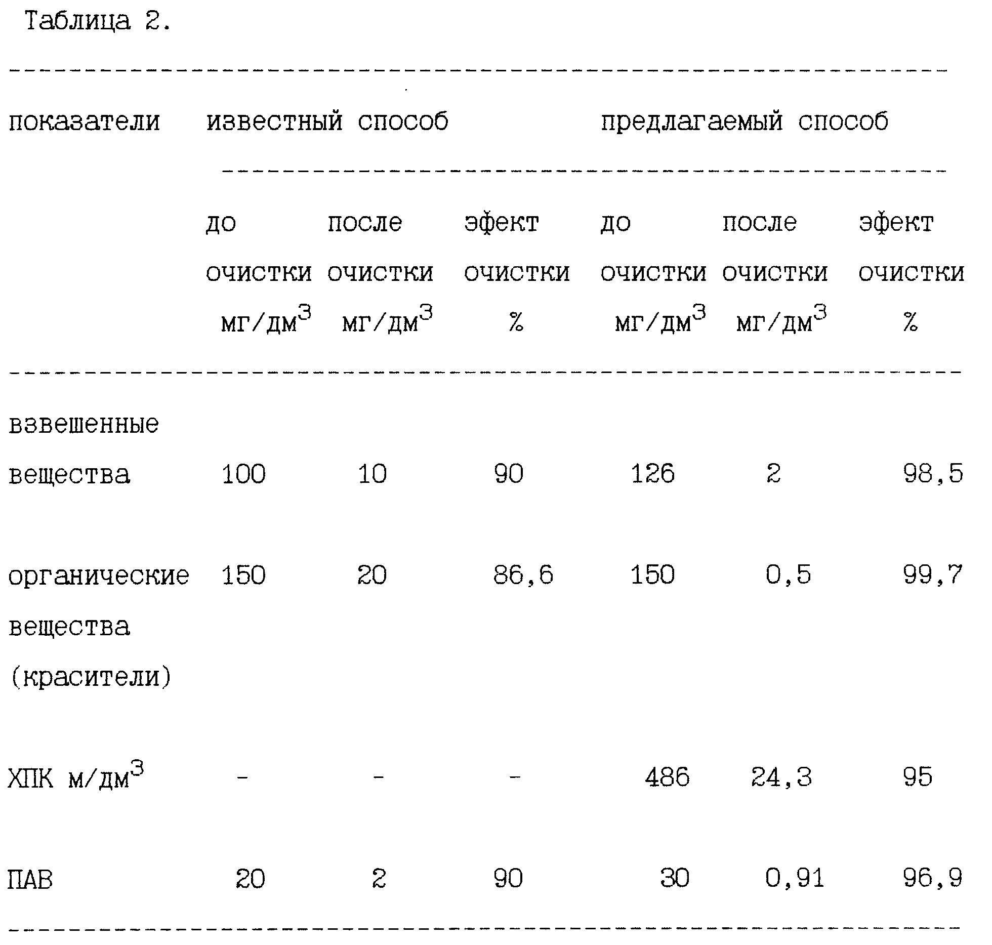 по степени очистки известным и предлагаемым способами приведены в табл. 2.