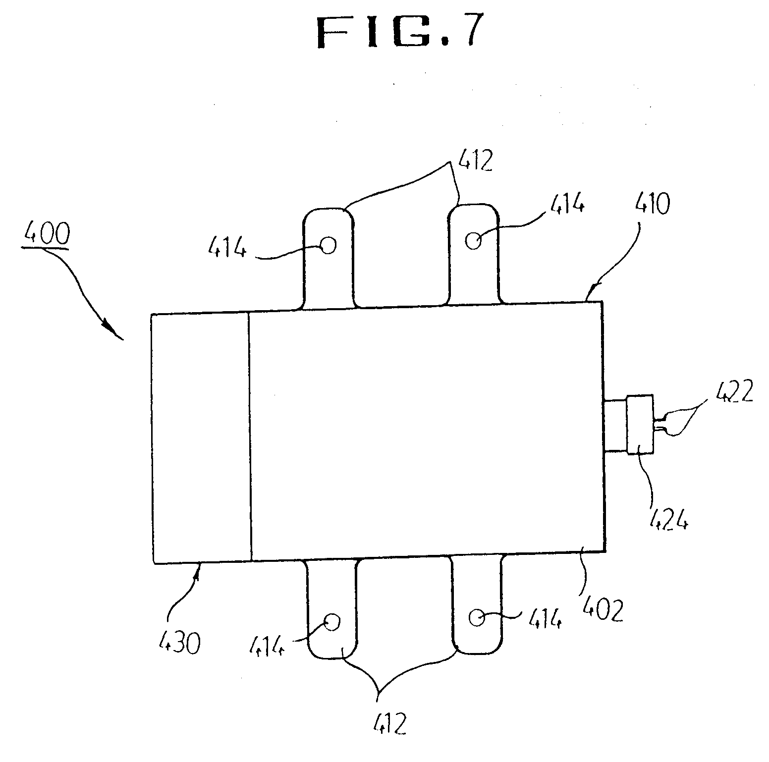 432 и охлаждающий элемент 434, окружающий охлаждающие ребра 432 и составляющий кожух охлаждающего устройства 430. На фиг. 6 дан вид сверху клистрона 400, показанного на фиг.5. На фиг.7