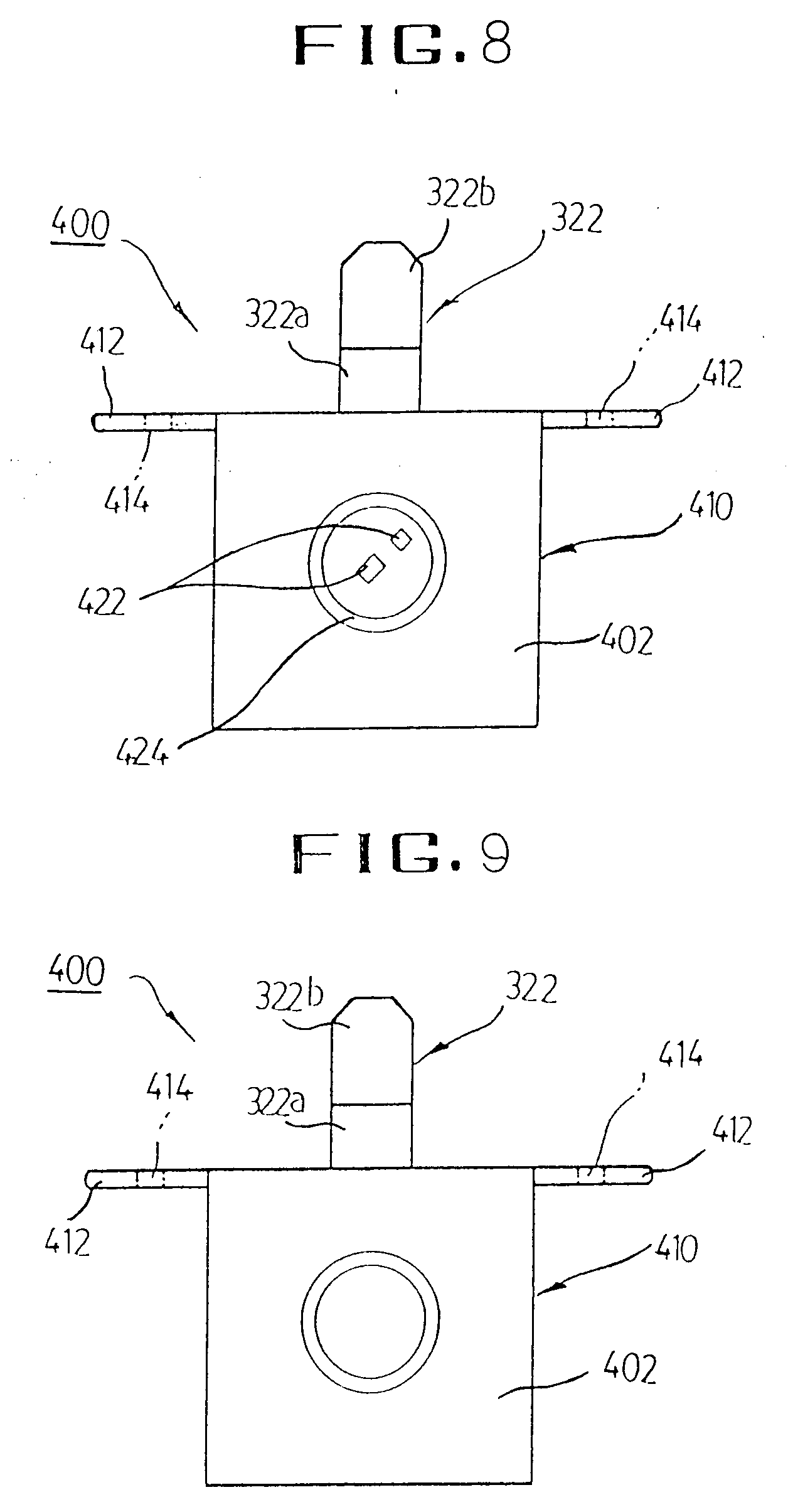 410 выступает вверх антенна 322, которая включает в себя коаксиальную линию, которая будет описана позже, изолирующий элемент 322а и колпачок 322b. Изолирующий элемент 322а изготовлен из изоляционного