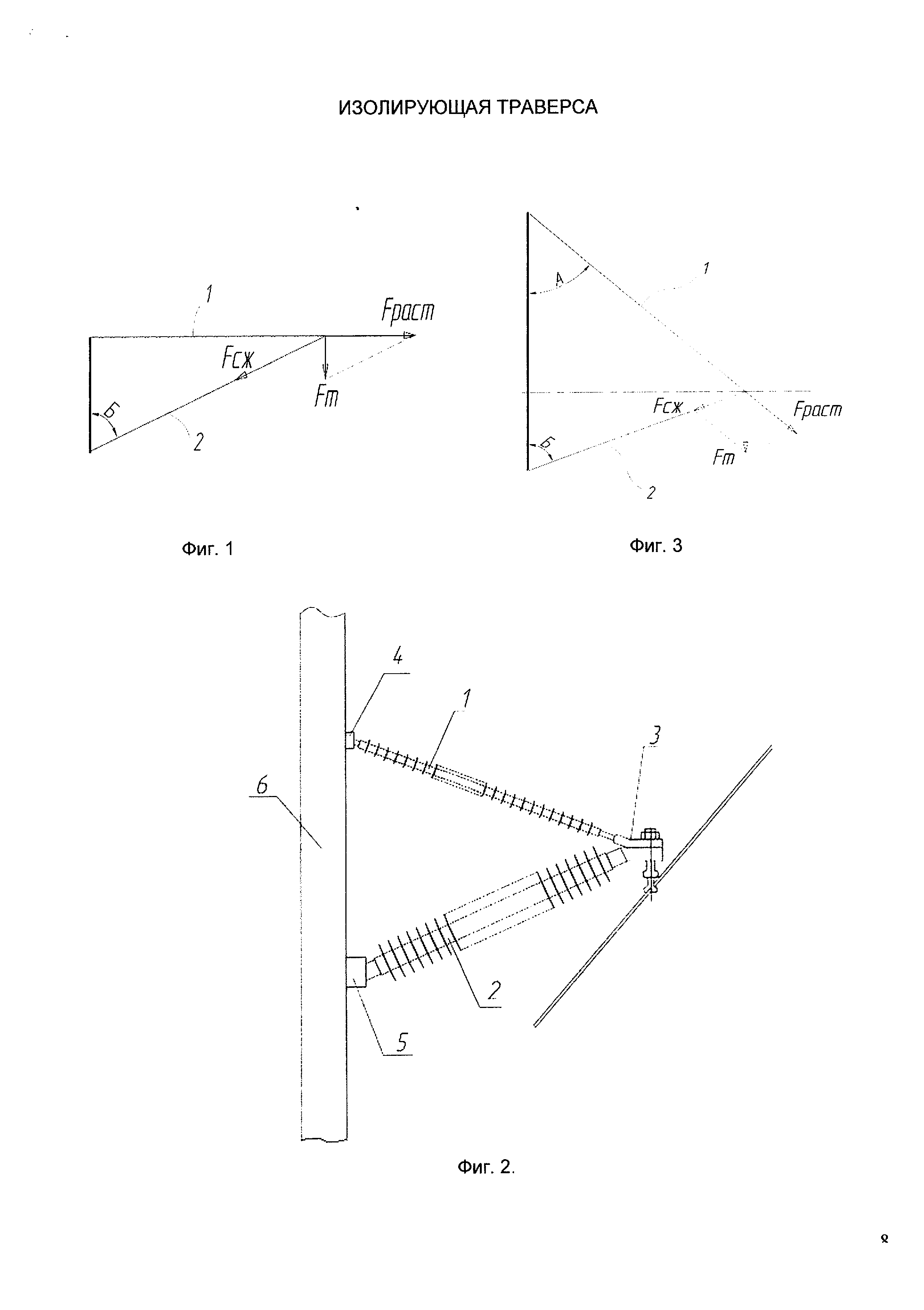 Полезная модель относится к электротехнике, а именно к высоковольтным линиям электропередачи, и может быть использована в конструкции изолирующих траверс, предназначенных для подвески фазных проводов линий к опорам. Известны конструкции изолирующих траверс с использованием серийно выпускаемых изоляторов, как фарфоровых, так и полимерных. См., например, «Энергетическое строительство за рубежом» 1978, №5, Стр.37-46. Также известны конструкции изолирующих траверс, состоящих из трех стержневых изоляторов, закрепленных в виде трех лучей через металлические оконцеватели к вершине стойки опоры. На свободных концах изоляторов закрепляются токоведущие фазные провода высоковольтной линии электропередачи. (Патент РФ 2159969, кл Н01В 17/02 опубл. 27.11.2000 г.). Принципиальным недостатком указанных конструкций является превышение допустимых нагрузок на использованные в них изоляционные элементы. Примененные в них опорно-стержневые изоляторы имеют существенные ограничения по допустимым усилиям на изгиб, направленным перпендикулярно относительно оси изолятора. В вышеописанных конструкциях нагрузка от силы тяжести проводов действует в перпендикулярном направлении относительно оси изолятора, что ограничивает использование опорно-стержневых изоляторов в качестве изоляционных конструкций по механическим характеристикам. Наиболее близким к предлагаемому решению является конструкция изолирующей траверсы для подвески проводов на опоре линии электропередачи, выполненная из комбинации подвесного (линейного) и опорного стержневых изоляторов. (Патент RU на ПМ №52250 от 2006.г.). В данной конструкции изоляторы закреплены на опоре на расстоянии друг от друга, в точке крепления провода объединены в общем узле крепления, образуя тем самым прямоугольный треугольник, одной стороной которого служит участок опоры, расположенный между точками крепления опорного и подвесного изоляторов, а две другие стороны - опорный и подвесной изоляторы. При этом подвесной изолятор располагается горизонтально, а опорный - вниз от соединительного узла до опоры под острым углом. Узлы крепления изоляторов к опоре выполнены шарнирными и позволяют траверсе повернуться на угол до 90° вокруг оси, параллельной оси опоры. Изоляторы крепятся к опоре с помощью металлического хомута. В качестве подвесного (линейного) изолятора используется полимерный стержневой изолятор, а в качестве опорного - полимерный опорно-стержневой изолятор. Указанная конструкция траверсы также обладает рядом недостатков. Шарнирное крепление изоляторов к опоре и горизонтальное расположение подвесного изолятора приводит к тому, что сила тяжести провода, а также гололедно-ветровые нагрузки, действуют на подвесной изолятор на растяжение, а по отношению к опорному изолятору на сжатие. Разложение действия силы тяжести Fт на составляющие в этом случае показано на фиг.1. Сила на растяжение FРаст подвесного изолятора 1 и сила сжатия FСж опорного изолятора 2 при горизонтальном расположении подвесного изолятора определяются по следующим формулам: Из формул (1.1) видно, что при горизонтальном расположении линейного подвесного изолятора при любом угле Б, большем 0 градусов, сила на сжатие для опорного изолятора превышает нагрузку от тяжести проводов. При углах Б, меньших 45°, сила на растяжение меньше силы тяжес