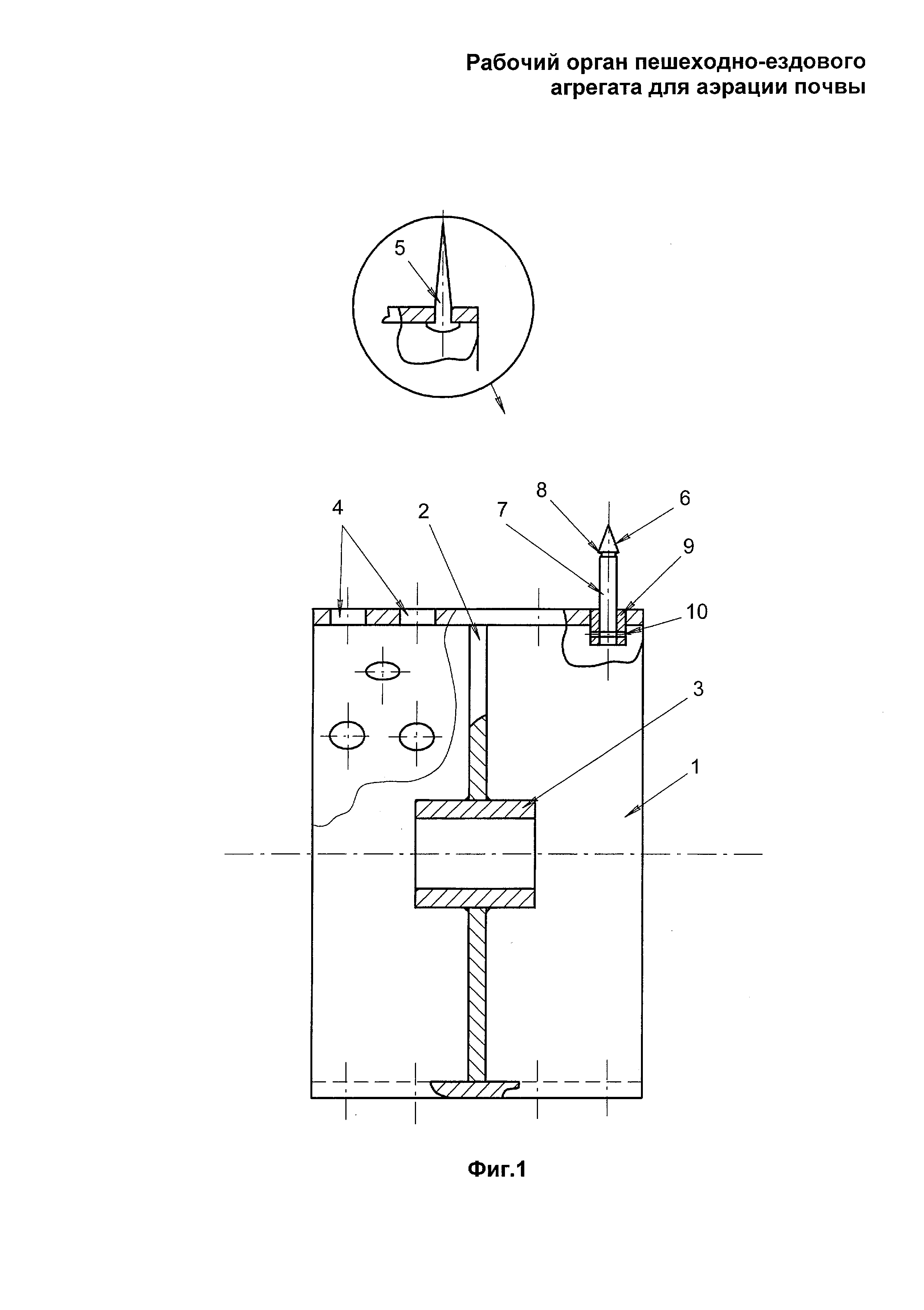 1. Рабочий орган пешеходно-ездового агрегата для аэрации почвы, содержащий корпус, выполненный в виде кругового пустотелого цилиндра, перфорированного сквозными отверстиями, в которых закреплены рабочие зубья и неразъемно соединенного со ступицей, снабженной приспособлением для установки рабочего органа на приводном валу, отличающийся тем, что рабочие зубья закреплены на корпусе жестко, а приспособление для установки рабочего органа на приводном валу выполнено унифицированным с креплением колеса промышленного мотоблока, например, типа «Нева», «ОКА», «Каскад».