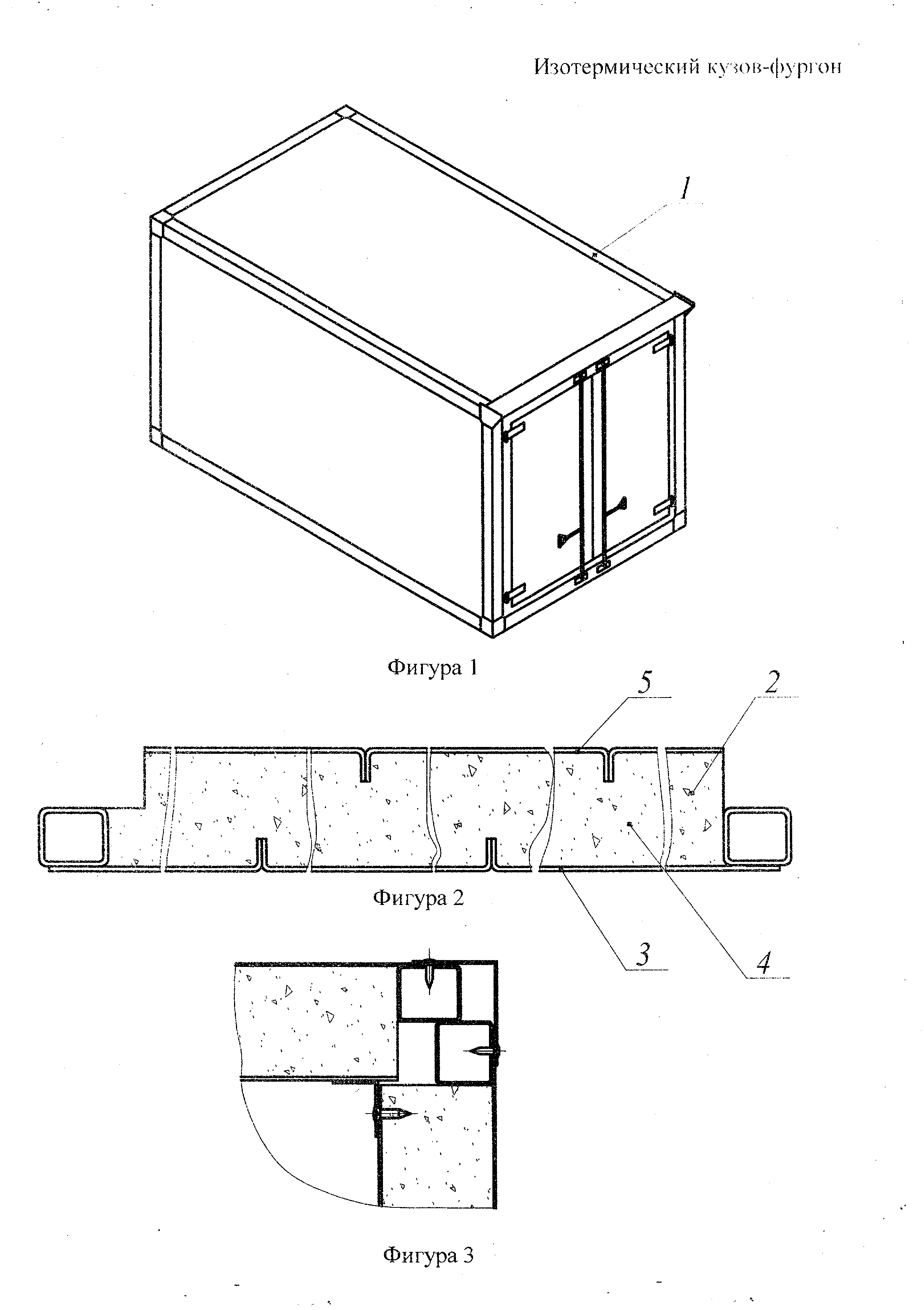 Полезная модель относится к транспортным средствам для перевозки грузов, требующих климатического контроля, в частности к конструкции изотермических фургонов для хранения и перевозки охлажденных грузов. Известен изотермический кузов, содержащий корпус, выполненный из жестко соединенных между собой модулей, установленный на общем основании, причем каждый модуль имеет сварной каркас, обшитый изнутри и снаружи листовым металлом, теплоизоляционный материал, расположенный между внутренней и внешней обшивками, холодильный агрегат, испаритель. В качестве листового металла использован стальной лист, а в качестве теплоизоляционного материала - пенополиуретан [1]. Известный изотермический кузов не обеспечивает надежной теплоизоляции, так как в местах соединения модулей образуются тепловые мостики за счет контакта металла, где происходит утечка тепла (холода) из кузова, следовательно, снижение теплоизоляционных свойств. Известен изотермический кузов-фургон, содержащий соединенные между собой смежные теплоизоляционные панели, каждая из которых образована наружным и внутренним металлическими листами, образующими соответственно наружную и внутреннюю обшивки стен и крыши кузова, и расположенным между металлическими листами теплоизоляционным слоем, причем упомянутое соединение между панелями включает в себя расположенный вдоль кузова уголок, каждая полка которого неподвижно соединена с внутренним листом одной из смежных теплоизоляционных панелей [2]. Недостатком этого изотермического кузова является значительная трудоемкость операций по сборке из бескаркасных панелей и наличие между панелями «тепловых мостов», возникающих как при монтаже кузова, так и при деформации кузова в процессе эксплуатации. Известен также изотермический кузов-фургон, содержащий соединенные между собой смежные теплоизоляционные панели, каждая из которых образована наружным и внутренним металлическими листами, образующими соответственно наружную и внутреннюю обшивки стен и крыши кузова, и расположенным между металлическими листами теплоизоляционным слоем, причем упомянутое соединение между панелями включает в себя расположенный вдоль кузова уголок, каждая полка которого соединена при помощи неподвижного соединения с внутренним листом одной из смежных теплоизоляционных панелей. Кузов-фургон содержит единый каркас, образованный размещенными по одной внутри теплоизоляционного слоя каждой панели металлическими рамками и неподвижно соединенными с рамками упомянутыми уголками. Каждая из указанных рамок снабжена двумя перемычками, а в сечении имеет форму швеллера, высота которого меньше толщины теплоизоляционного слоя панели [3]. Недостатком указанного изотермического кузова является наличие металлоемких тяжелых каркасов панелей, значительная трудоемкость изготовления панелей, сложность точного сопряжения швеллера и уголка без нарушения целостности теплоизоляционного слоя. Наиболее близким по технической сущности к заявляемому и достигаемому результату является изотермический кузов-фургон, содержащий каркас и теплоизоляционные панели, состоящие из теплоизоляционного слоя, наружной и внутренней обшивок. Каркас кузова-фургона состоит из каркасов элементов кузова-фургона, сваренных из профильной трубы, входящих в тепл