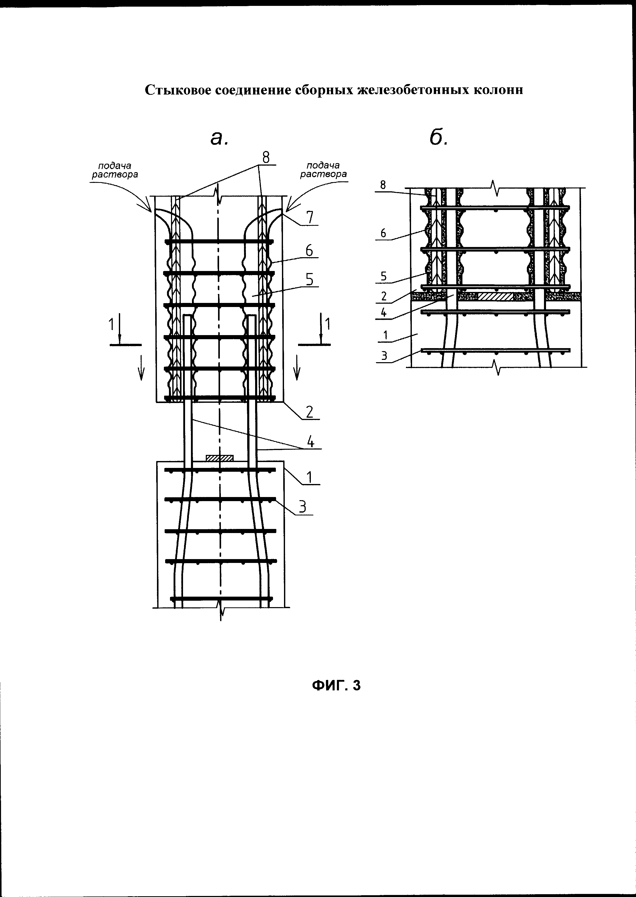 Стыковое соединение сборных железобетонных колонн, включающее концы стыкуемых колонн, имеющих косвенное армирование в виде поперечных сеток, выпуски продольных рабочих стержней арматуры в торце одной из колонн, вставленные в скважины в торце смежной стыкуемой колонны, отличающееся тем, что скважины образованы не извлекаемыми гофрированными трубками, имеющими технологические отверстия для инъецирования раствора, установленными параллельно оси колонны в процессе ее изготовления, при этом продольные рабочие стержни этих колонн расположены внутри гофрированных трубок.