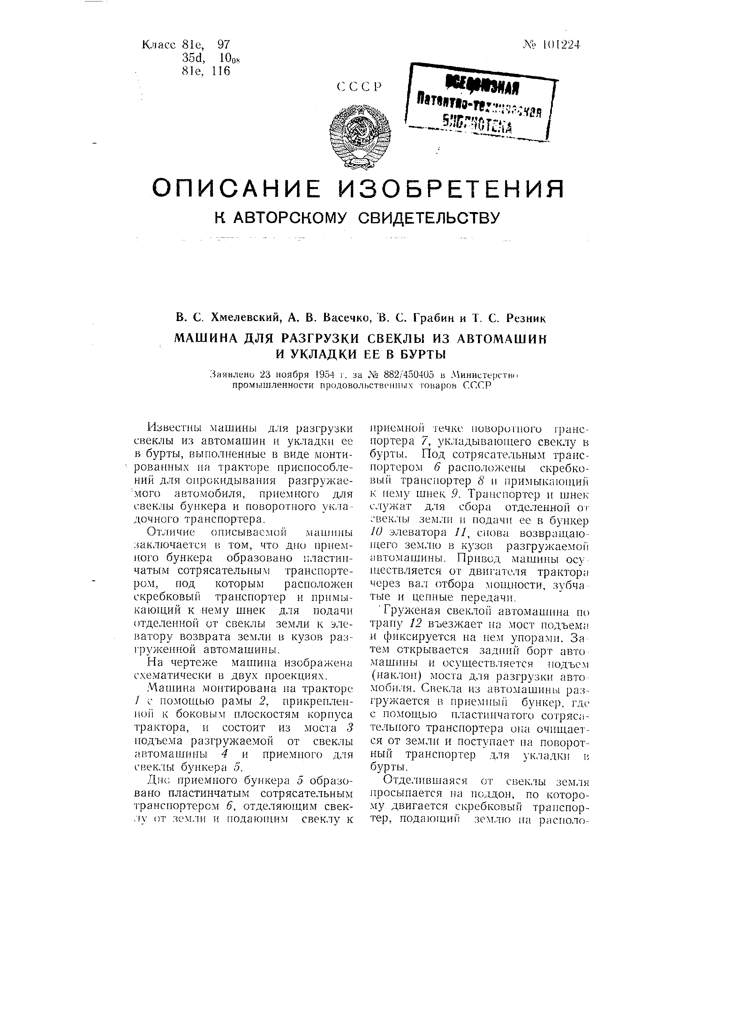 моста для разгрузки авто .мобнля. Свекла из автомашины разгружается в приемны/ бункер, где с помощью нластинчатого сотряс;:тельного транснортера она очищается от земли и поступает на поворотный транснортер .тля ук.чадки i; бурты. Отдел1Н}шаяся от свеклы земля просыпается на поддон, но которому двигается скребковый транспортер , подающий землю на расноло ..1 .- л{енны11 . иерненДйТГуЖрно пластинам шнек. Мий Ладаег землю на элеватор, которЫ1.у1Э;ДНиУает ее н бункер. После разгрузки автомашины от свеклы открывается пшбер 13 бункера элеватора и земля из него осыпается и кузои явтомаптш-л Пред м е г н з о б р е i е и и я Машина для разгрузки свехслы из автомашин и укладки ее в