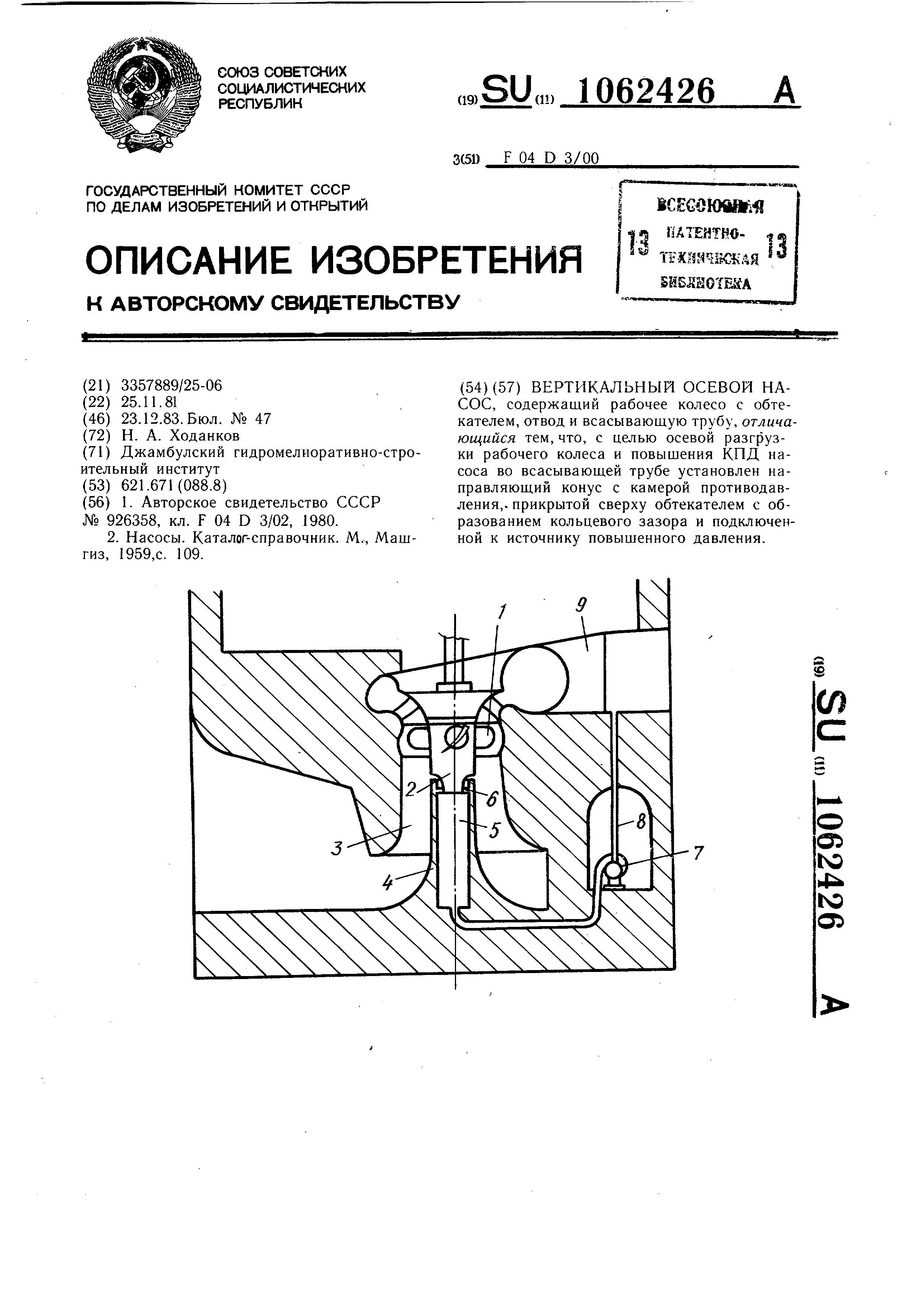 , отвод и всасывающую трубу, отличающийся тем,что, с целью осевой разгрузки