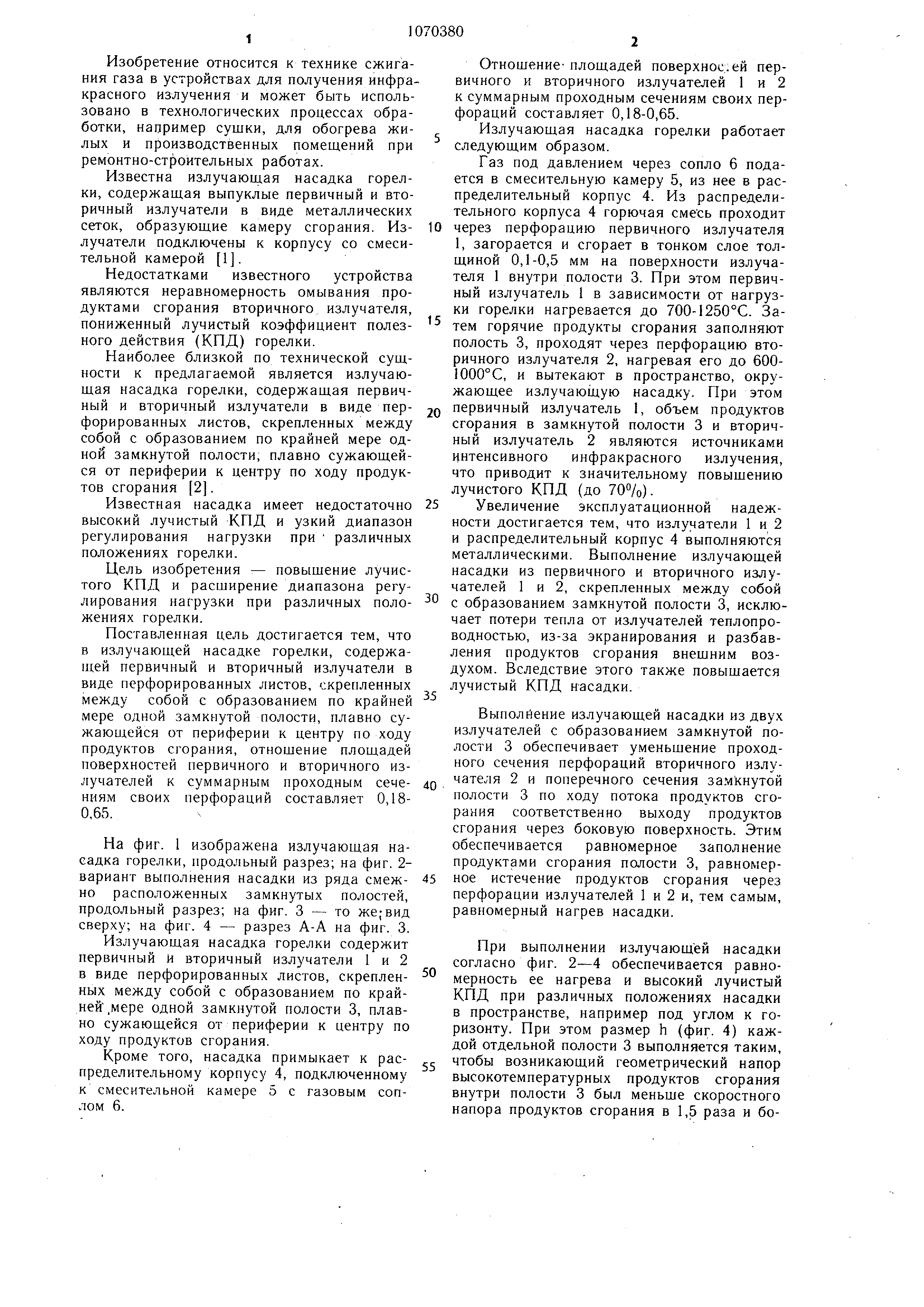 Излучающая насадка горелки содержит первичный И вторичный излучатели 1 и 2