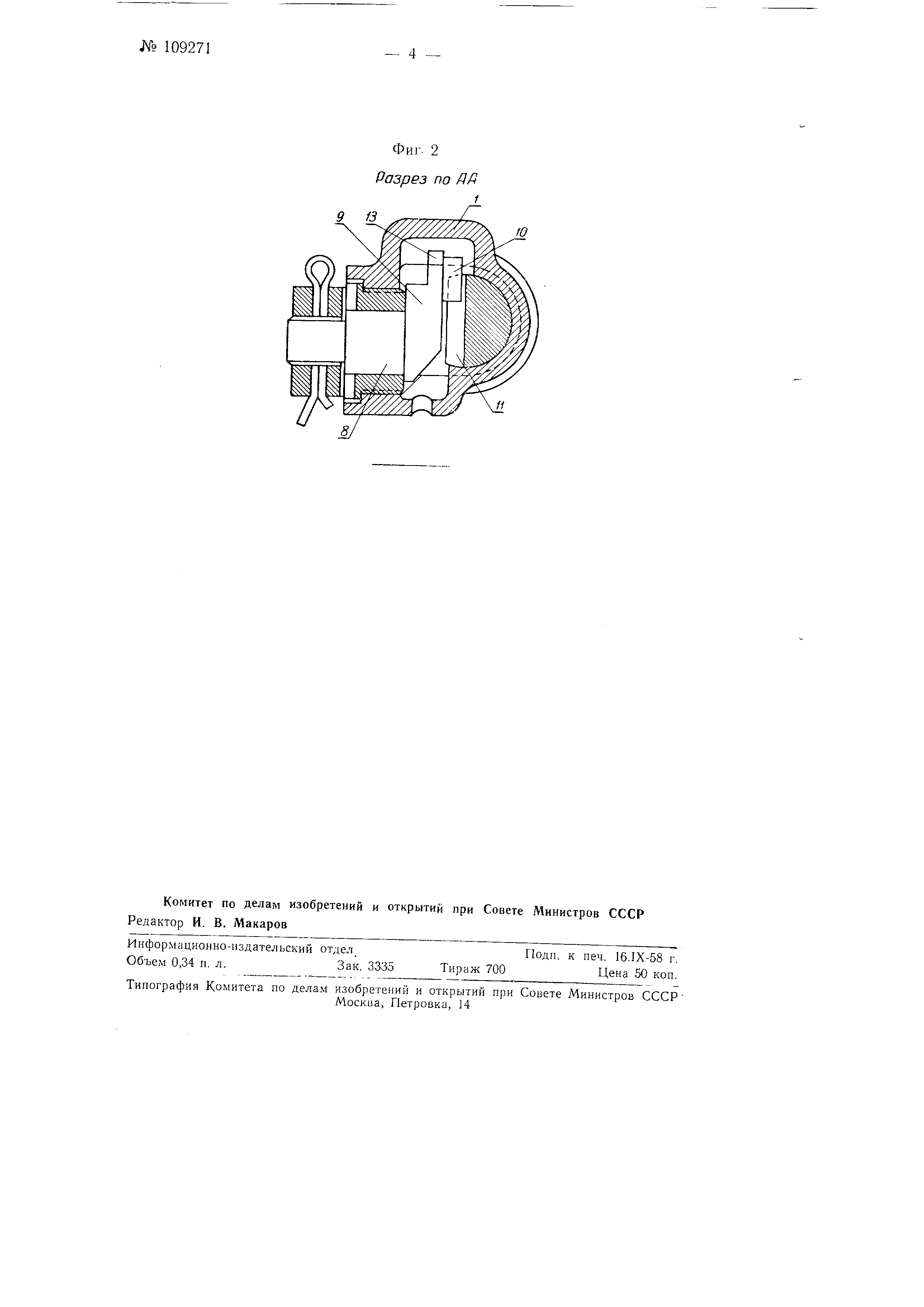 отвинчивания втулки валика кривощипа , последний снабжен заплечиком, упирающимся в етенку корпуса . Приоритет по п. 2 от 29 марта 1956 г. : X а © Фиг. 2 Разрез по /7/7 9 13