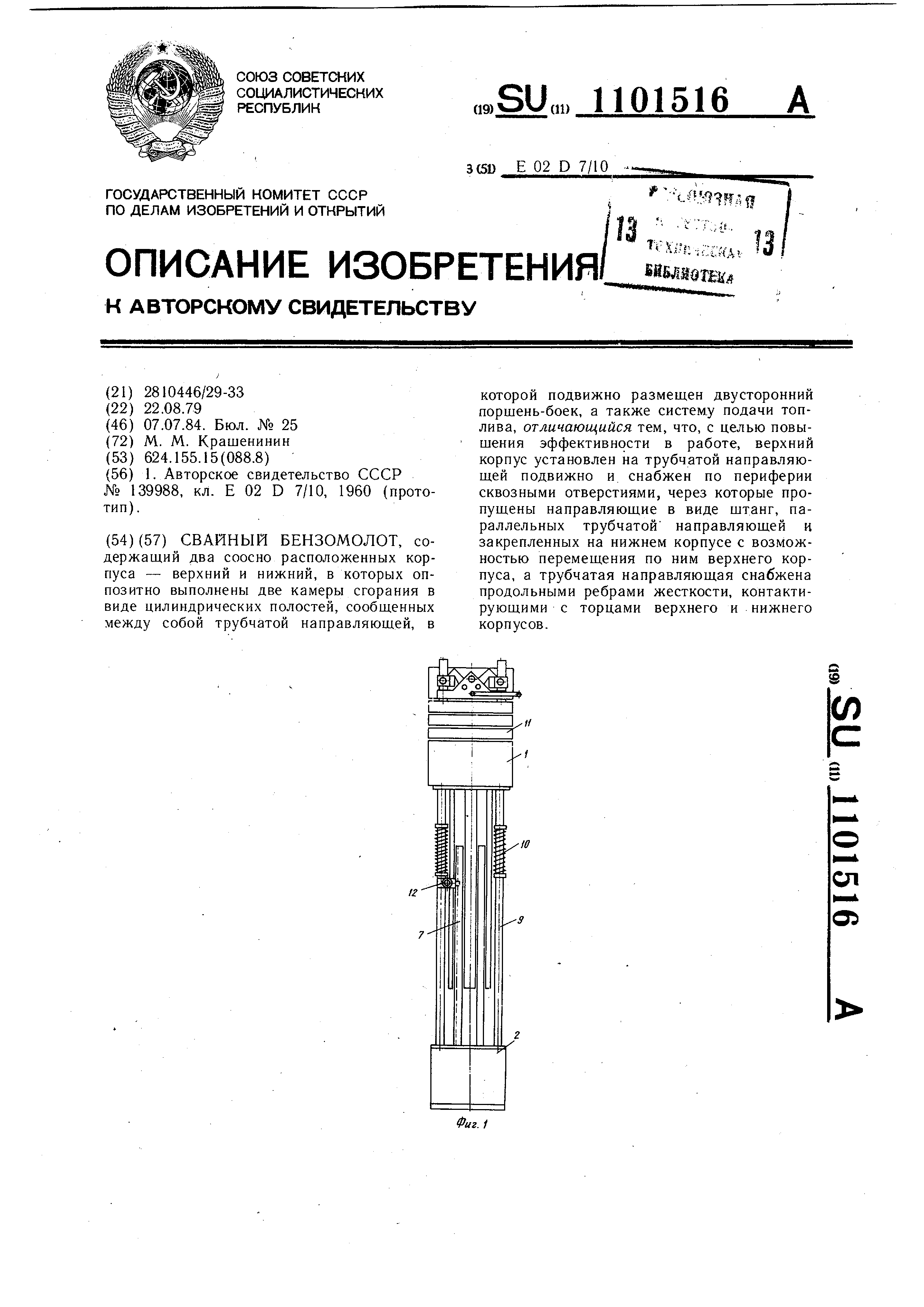 СВАЙНЫЙ БЕНЗОМОЛОТ, содержащий два соосно расположенных корпуса - верхний и нижний, в которых оппозитно выполнены две камеры сгорания в виде цилиндрических полостей, сообщенных между собой трубчатой направляющей, в которой подвижно размещен двусторонний порщень-боек, а также систему подачи топлива , отличающийся тем, что, с целью повышения эффективности в работе, верхний корпус установлен на трубчатой направляющей подвижно и снабжен по периферии сквозными отверстиями, через которые пропущены направляющие в виде щтанг, параллельных трубчатой направляющей и закрепленных на нижнем корпусе с возможностью перемещения по ним верхнего корпуса , а трубчатая направляющая снабжена продольными ребрами жесткости, контактирующими с торцами верхнего и нижнего корпусов. & (Л