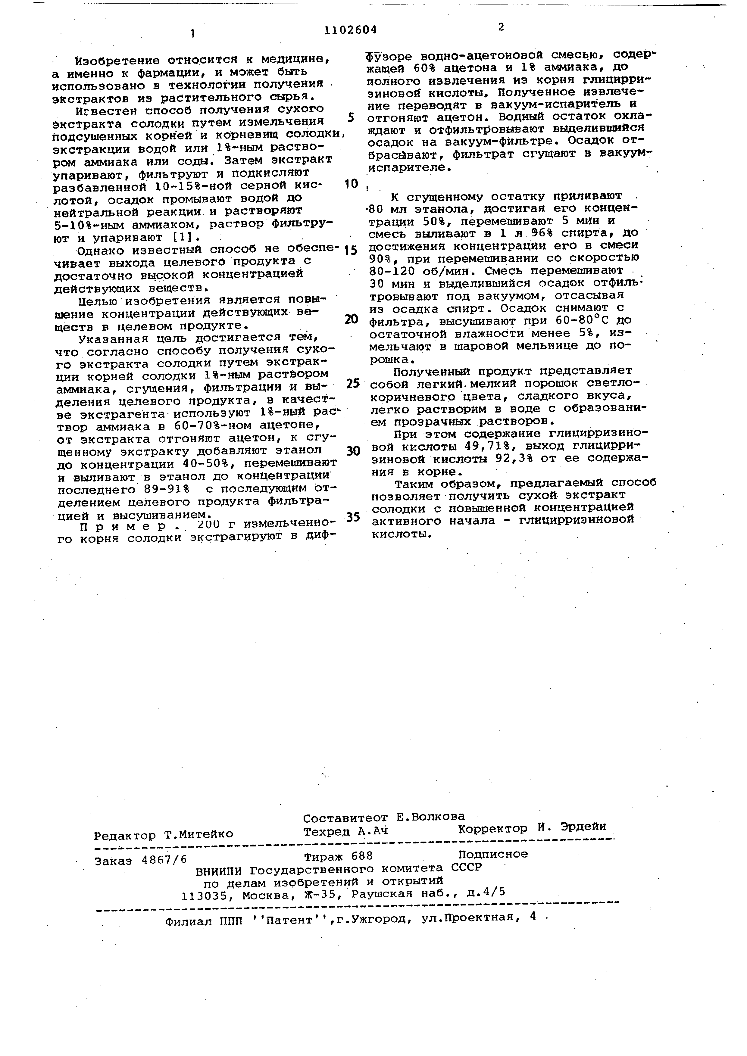 СПОСОБ ПОЛУЧЕНИЯ СУХОГО ЭКСТРАКТА СОЛОДКИ путем экстракции корней солодки 1%-ным раствором аммиака , сгущения, фильтрации и вьвделения целевого продукта, отличающийся