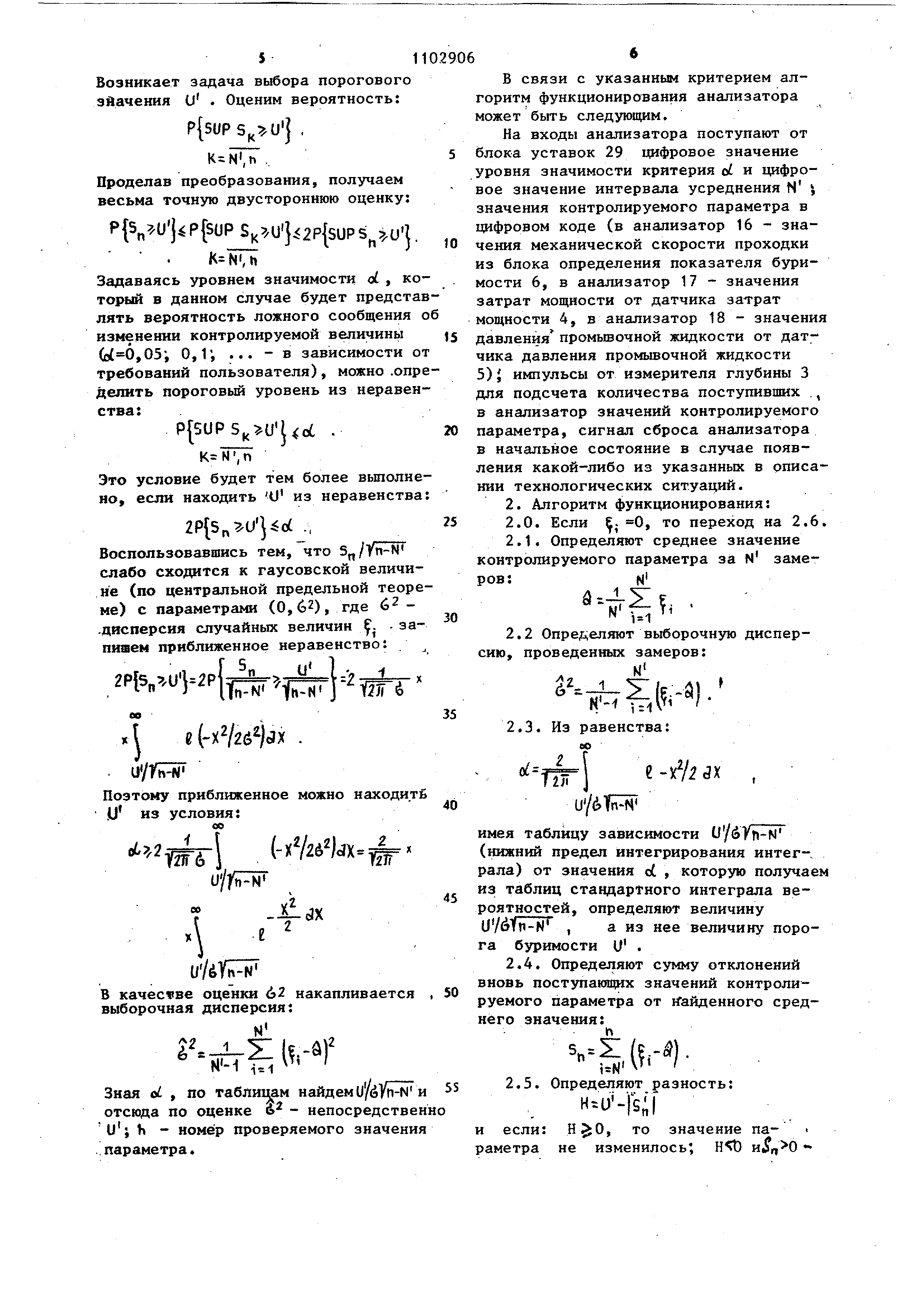 N - задаваемый интервал усреднения. Возникает задача выбора порогового эйачения U . Оценим вероятность: P{5UPS Uj , . Проделав преобразования, получаем весьма точную двустороннюю оценку: .UJ P{SUPS,,U}.2P{SUPS.U1 Задаваясь уровнем значимости oL , к торый в данном случае будет предст лять вероятность ложного сообщения изменении контролируемой величины (о(0,05, 0,1; ... - в зависимости требований пользователя), можно .опр делить пороговый уровень из неравен ства: . КгТПТп Это условие будет тем более вьшолн но, если находить U из неравенств 2Р{5„ и5 оС , Воспользовавшись тем, что 5„ /Vn-N слабо сходится к гаусовской величи не (по центральной предельной теор ме) с параметрами (0,6), где 6 .дисперсия случайных величин . - за пишем приближенное неравенство: , Pl nUHp{t fr Yrrl- WT к e(-x2/26)jx . u/rSniF Поэтому приближенное можно находит и из условия: (. u/dyiviT В качестве оценки &2 накапливается выборочная дисперсия: N J2 1 IP л)2 Зная oL , по таблш ам найдем U/eVn-N отсюда по оценке 6 - непосредстве Ui Ь - номер проверяемого значени . параметра. В связи с указанным критерием алгоритм функционирования анализатора может быть следующим. На входы анализатора поступают от блока уставок 29 цифровое значение уровня значимости критерия at. и цифровое значение интервала усреднения N j значения контролируемого параметра в цифровом коде {в анализатор 16 - значения механической скорости проходки из блока определения показателя буримости 6, в анализатор 17 - значения затрат мощности от датчика затрат мощности 4, в анализатор 18 - значения давления промьшочной жидкости от датчика давления промывочной жидкости 5){ импульсы от измерителя глубины 3 для подсчета количества поступивших ., в анализатор значений контролируемого параметра, сигнал сброса анализатора в начальное состояние в случае появления какой-либо из указанных в описании технологических ситуаций. 2. Алгоритм функционирования: 2.0.Если . 0, то переход на 2.6. 2.1.Определяют среднее значение контролируемого параметра за N замеN ров: --1 f N 2.2 Определяют выборочную дисперсию , проведенных замеров: ). 2.3. Из равенства: е -xV dx имея таблицу зависимости U/ Vn-N (нижний предел интегрирования интеграла ) от значения ot , которую получаем из таблиц стандартного интеграла вероятностей , определяют величину иМТп-М , а из нее величину порога буримости U . 2.4.Определяют сумму отклонений вновь поступающих значений контролируемого параметра от йайденного среднего значения: -|М2 .5.Определяют разность: H.u -|sil если: , то значение па- « аметра не изменилось, Н и, и S О - уменьувеличило .сь шилось. 2.6.Из полученных в 2.5 и 2.0 результатов формируют сигналы на вы-ходе анализатора. 2.7.Возврат на 2,0 в случае появления сигнала Сброс. Устройство работает следующим образом . По мере вычисления показателей буримости, полученных при бурении равных по длине интервалов скважины, рассчитьшается величина коэффициента вариации сначала для двух показателей и сравнивается с пороговой вели .чиной. Если величина коэффициента вариации К меньше допустимой для дан ного закона распределения величины, то к первбначальной выборке, состоящей из двух показателей, присоединяется третий показатель буримости и для новой выборки снова рассчитывается величина коэффициента вариации и сравнивается с допустимой величиной и т.д. Тот показатель, который, будучи присоединенным к выборке, при вел к превьппению величины ее коэффициента вар