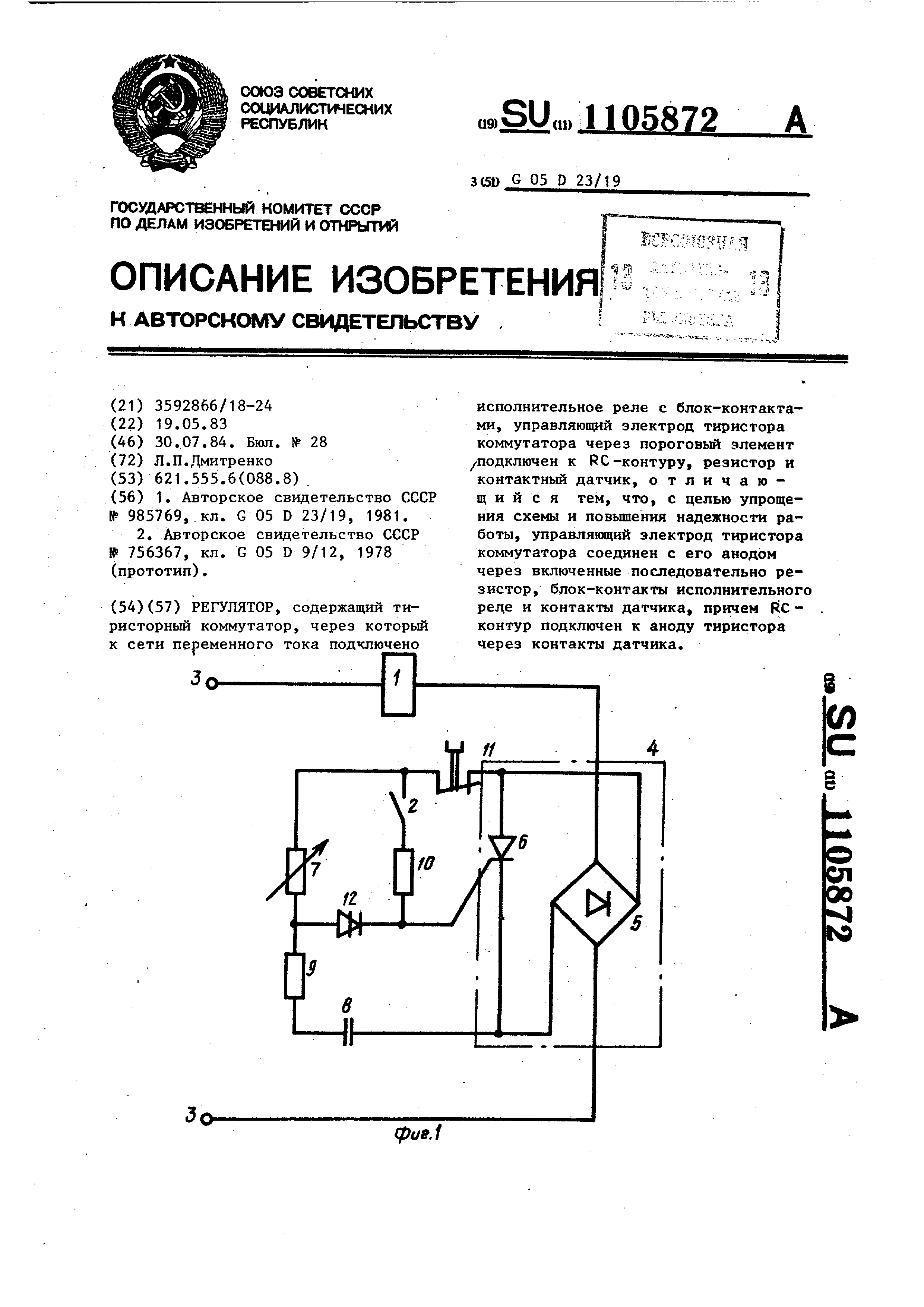 транзистора. Регулятор содержит исполнительное реле 1, например, магнитный пускатель