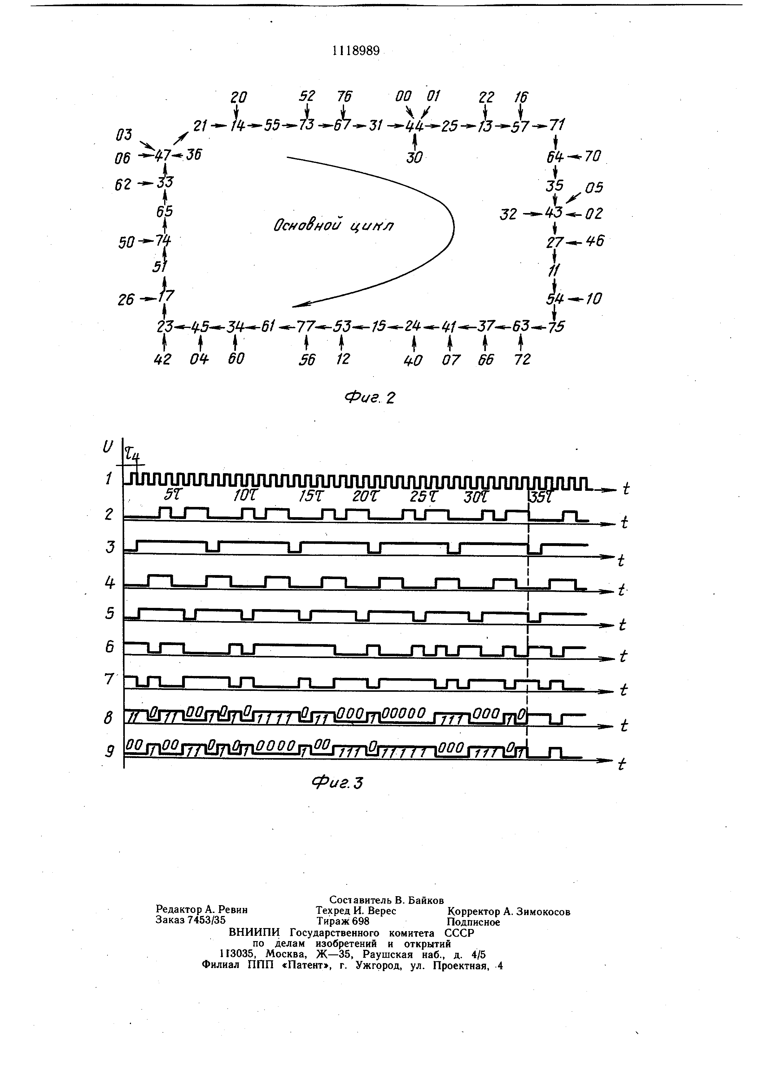 касается регистра 18, то за счет логики, состоящей из элементов И 15 и И 13 и обеспечивающей его работу, осуществляются переходы из состояний 2 и 6 в его основной цикл также за один такт, как это было показано при разборе цикла табл. 2. Отсюда