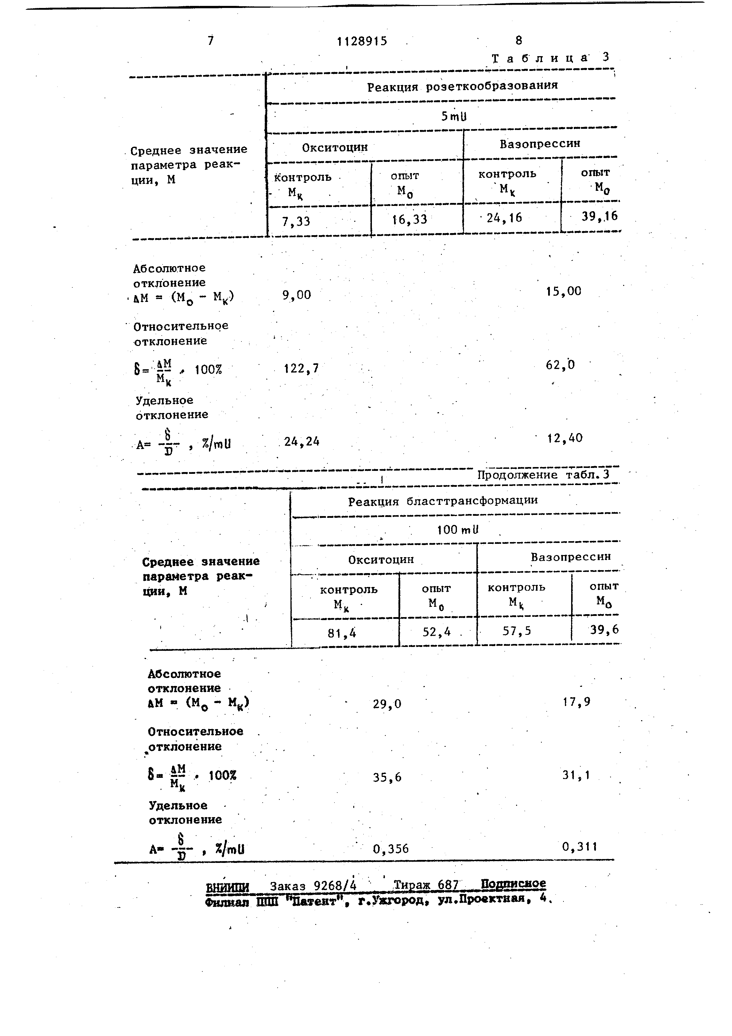 Изобретение относится к медицине и 6иоло1 и, а именно к способам определения биологической активност гормонов, и может быть использовано при стандартизации препаратов гормо . нов, извлекаемых из головного мозга млекопитающих или птиц. Известен способ определения активности гормонов задней доли гипофиза (вазопрёссина и окситоцина) путем внесения его в культуру лимфоцитов с последукицим учетом количества измененных клеток V|. Однако этот способ обладает низкой чувствительностью. Целью изобретения является повышение чувствительности способа. Указанная цель достигается тем, что согласно способу определения активности гормонов задней доли . гипофиза (вазопрёссина и окситоцина ) путем внесения его в культуру лимфоцитов с последующим учетом количества измененных клеток, испол зуют культуру лимфоцитов, чувствительную к действию гормона, призтом в нее вносят эpитpoциtы кролика и .активность препарата определяют по степени увеличения количества розет кообразующихлимфоцитов. Для определения активности вазопрессина используют культуру лимфоцитов тимуса морской свинки. Для определения активности окситоцина используют культуру лимфоцитов лимфатических узлов морской свинки. Способ выполняется следующим образом. Осуществление способа стало возможным лтпь после того, как, учитыв ранее известный эффект влияния гормонов эадней доли гипофиза на лимфоциты крови в реакции бластной тра сформации, были проведены более широкие лабораторные исследования по влиянию гормонов окситоцина и вазопрёссина на функциональную активт ность клеток различной локализации; тймоцитов, спленоцитов, лимфоцитов крови, костного мозга, лимфатически узлов с учетом их дифференцировки на Т- и В-лимфоциты. Технически рещение поставленной задачи осуществлялось с помощью реакции розеткообразования (связыва ния лимфоцитов с гетерологическими эритроцитами),которая, ввиду просто высокой чувствительности и специфич ности, позволяет надежно и быстро дифференцировать Т- и В-лимфоциты. В результате проведенных испытаний была выявлена высокая чувствительность Т-лимфоцитов лимфоузла к окситоцину и Т-лимфоцитов тимуса к вазопрессину. При бьщо установлено , что при помощи реакции розеткообразования удается обнаружить . изменение функциональной активности клеток при минимальной дозе гормонов , составляющих 5mU(О,0005 М.ед.), Выявленные новые знания и были положены в основу способа стандартизации гормонов задней доли гипофиза по реакции розеткообразования. В качестве биологического объекта использовали культуру лимфоците тимуса и лимфатического узла морской свинки. При стандартизации окситоцина использовали лимфоциты лимфатического узла, а вазопрёссина лимфоциты тимуса (тимоциты), П р им е р. Были проведены лабораторные испытания способа стандартизации гормонов задней доли гипофиза .- окситоцина и вазопрёссина. Методика проведения реакций была следующей . В силиконовые пробирки, содержащие 0,1 мл взвеси лимфоцитов в среде 199 (25 млн/мл), добавляли по 0,1 мл 2,5%-ной взвеси эритроцитов кролика в той же культуральной среде и соответств5тощий гормон в различных дозах так, что.бы концентрация его составляла 50тU, )И, 0,5 mil. В контрольные пробы вносили образцы тех же взвесей лимфоцитов и эритроцитов по О,1 мл и растворитель плацебо .Полученную смесь центрч-. фугировали пр